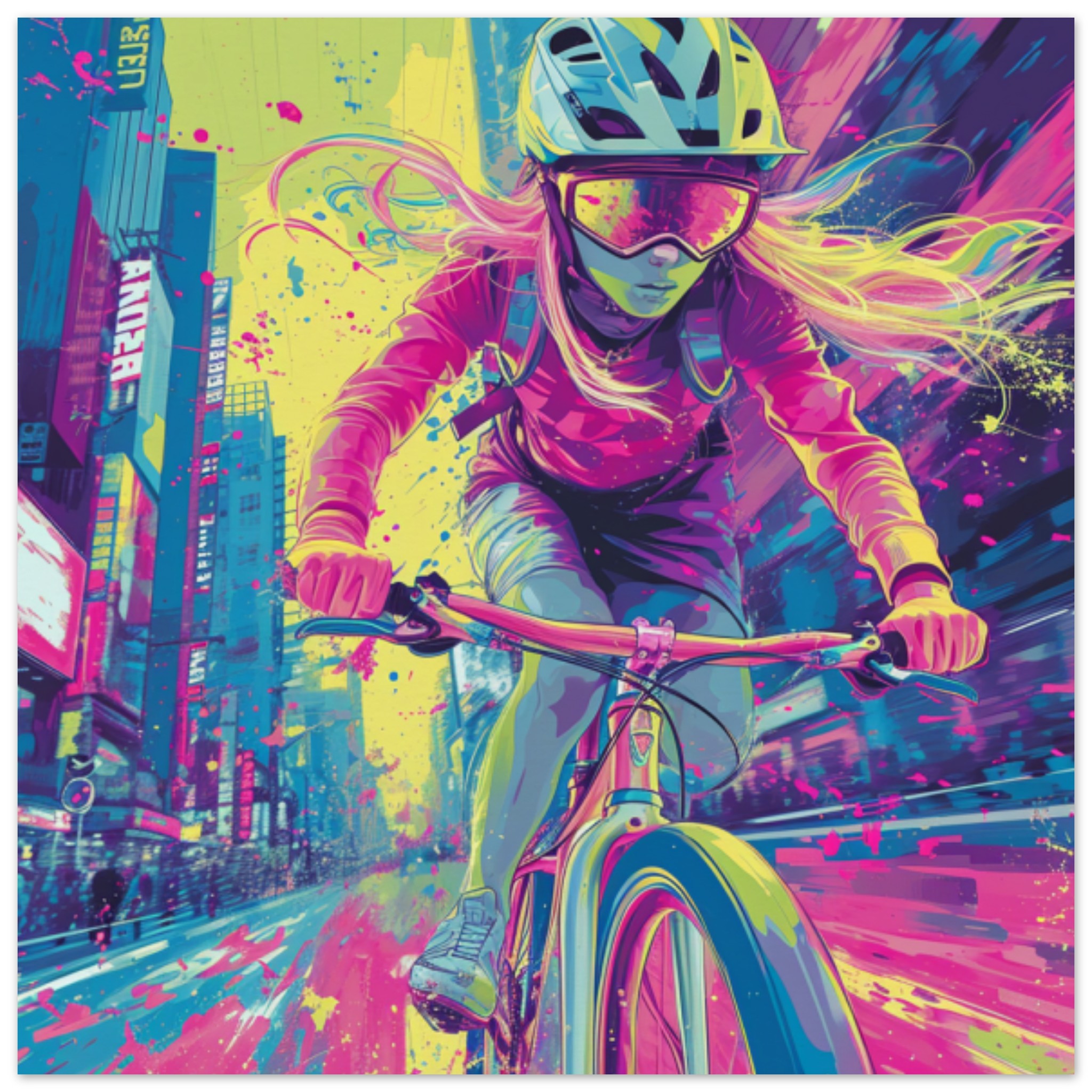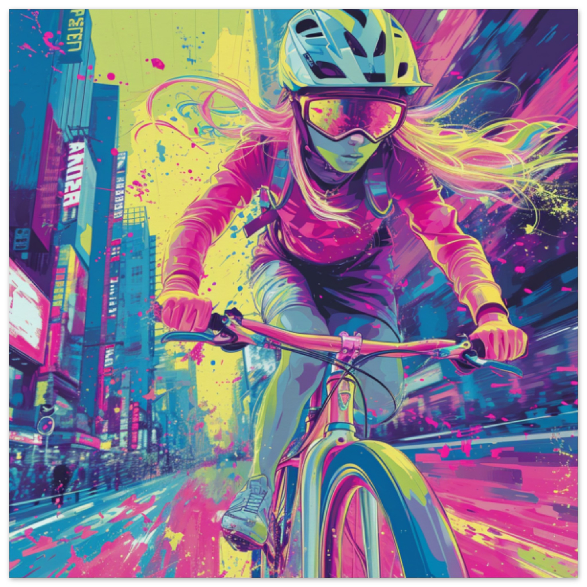 A vibrant pink drawing of a girl riding a bike in an artistic style. The image is set against a pink background with hints of blue. The girl is wearing a helmet and appears to be enjoying a leisurely ride. The bicycle is prominently featured, with graffiti elements adding a playful touch to the scene. The overall composition suggests a creative and imaginative atmosphere, with a focus on art and painting. The image is a mix of abstract nonphoto and abstract texture elements, creating a visually engaging and dynamic visual experience.