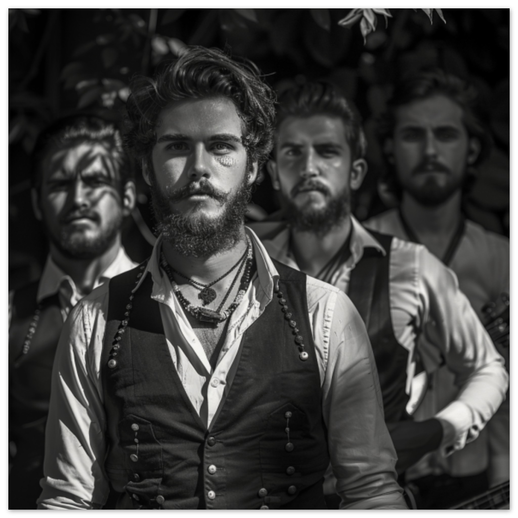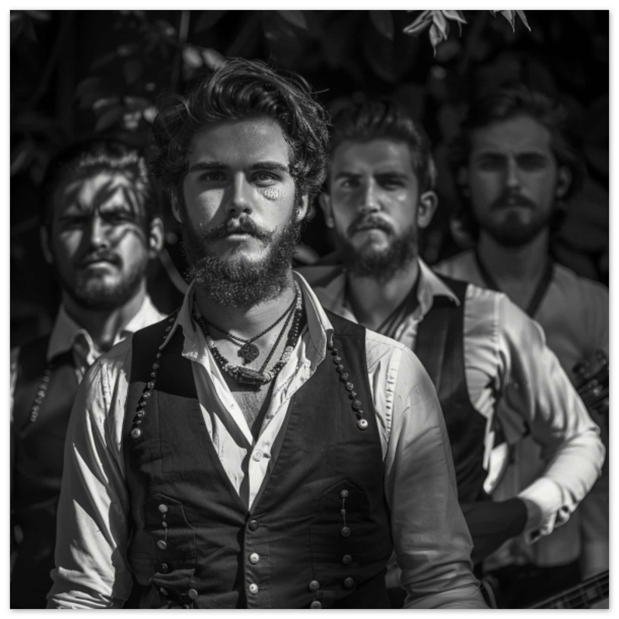 A group of four men, dressed in jackets, standing in front of a row of trees. The image is in black and white, with dominant colors of black and grey. The men have varying facial hair styles, with one man wearing sunglasses. The men are positioned at different distances from the camera, with one man in the foreground and the others in the background. The men appear to be outdoors, possibly on a street. The image is focused on the men’s faces and upper bodies, with a clear view of their clothing and expressions.