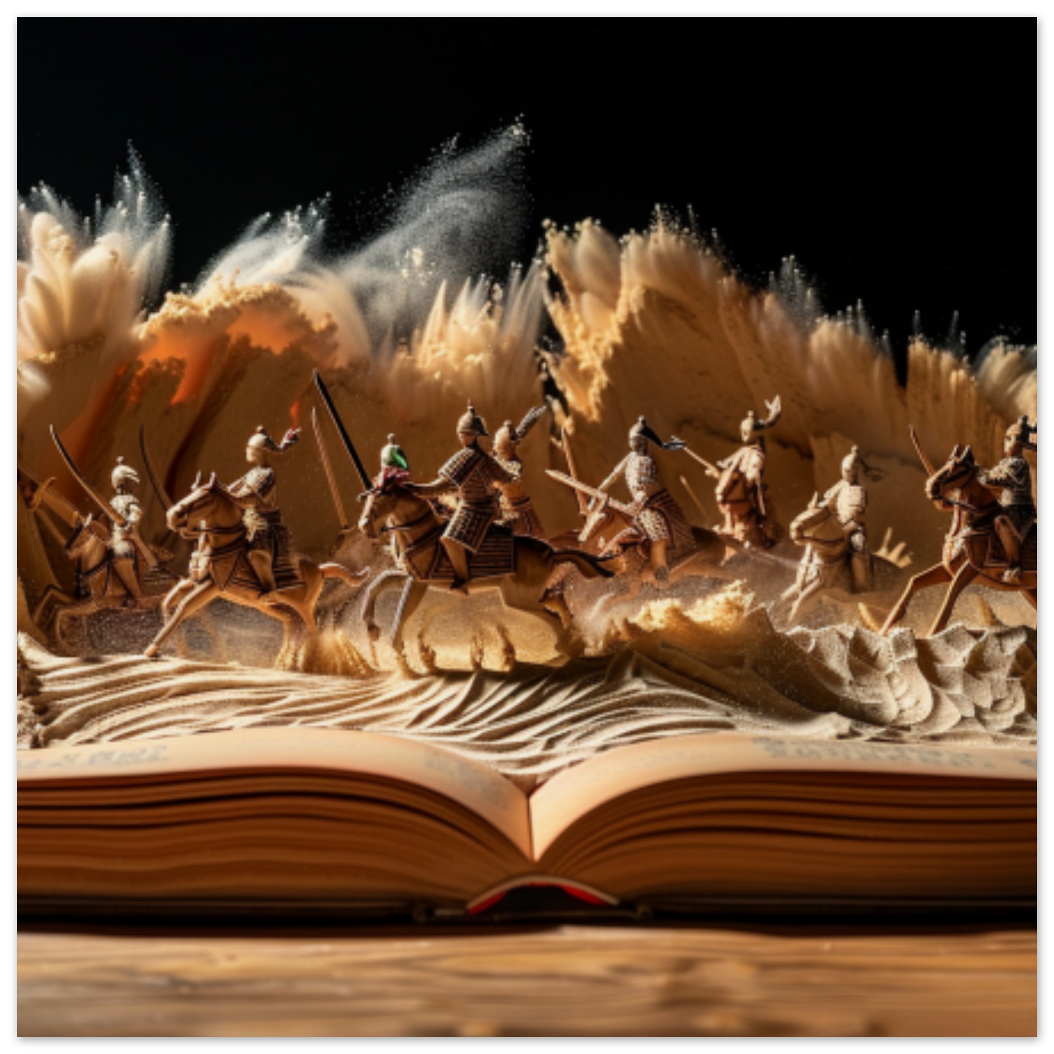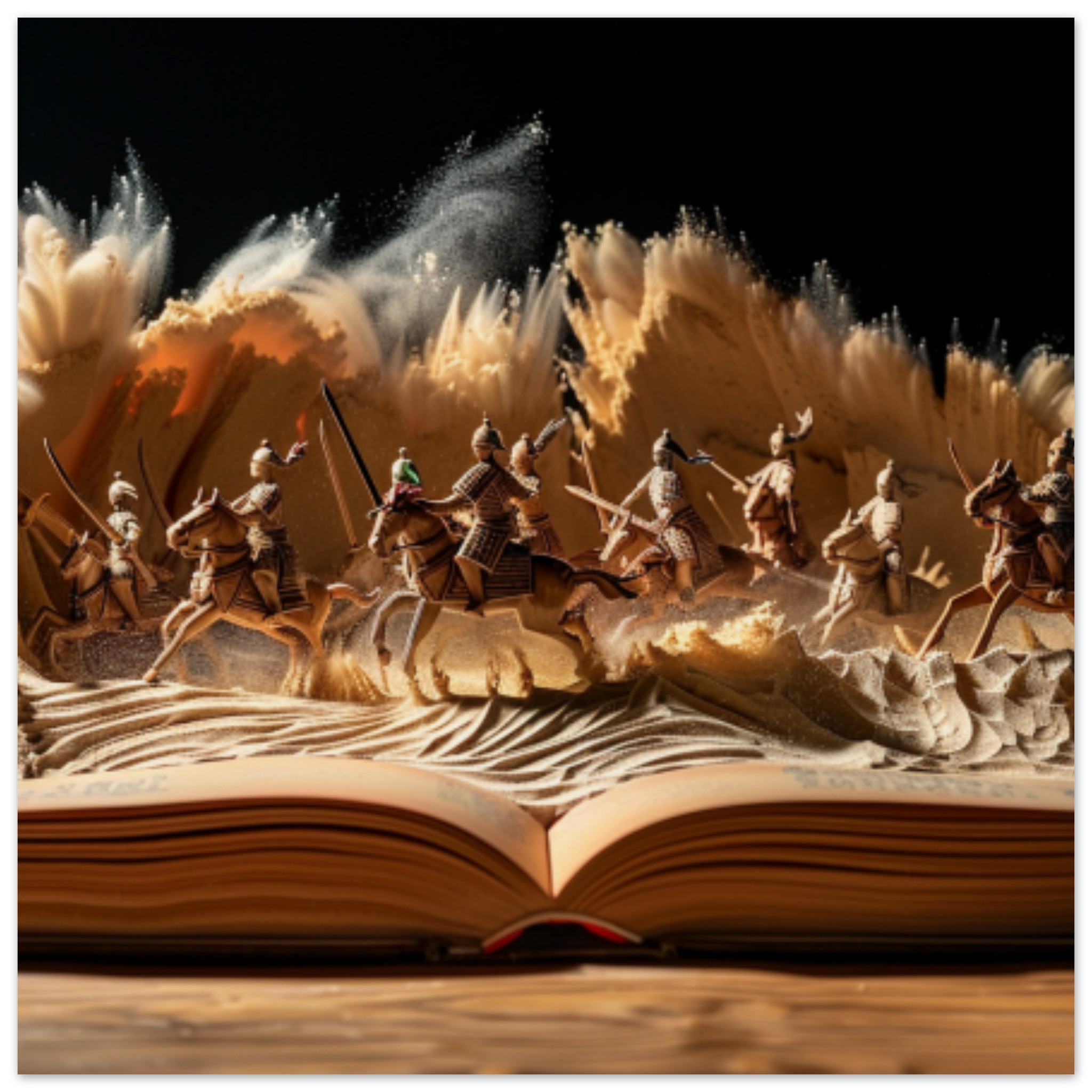 A book with a sand-patterned cover features a sculpture of a group of soldiers on horses. The dominant colors of brown and black create a dramatic backdrop for the detailed statue of men riding horses. The scene depicted on the cover is reminiscent of a historical battle or cavalry charge, capturing the intensity and power of the soldiers on horseback. The image exudes a sense of action and movement, with the soldiers appearing ready for battle. This captivating book cover is sure to intrigue readers interested in military history and action-packed stories.