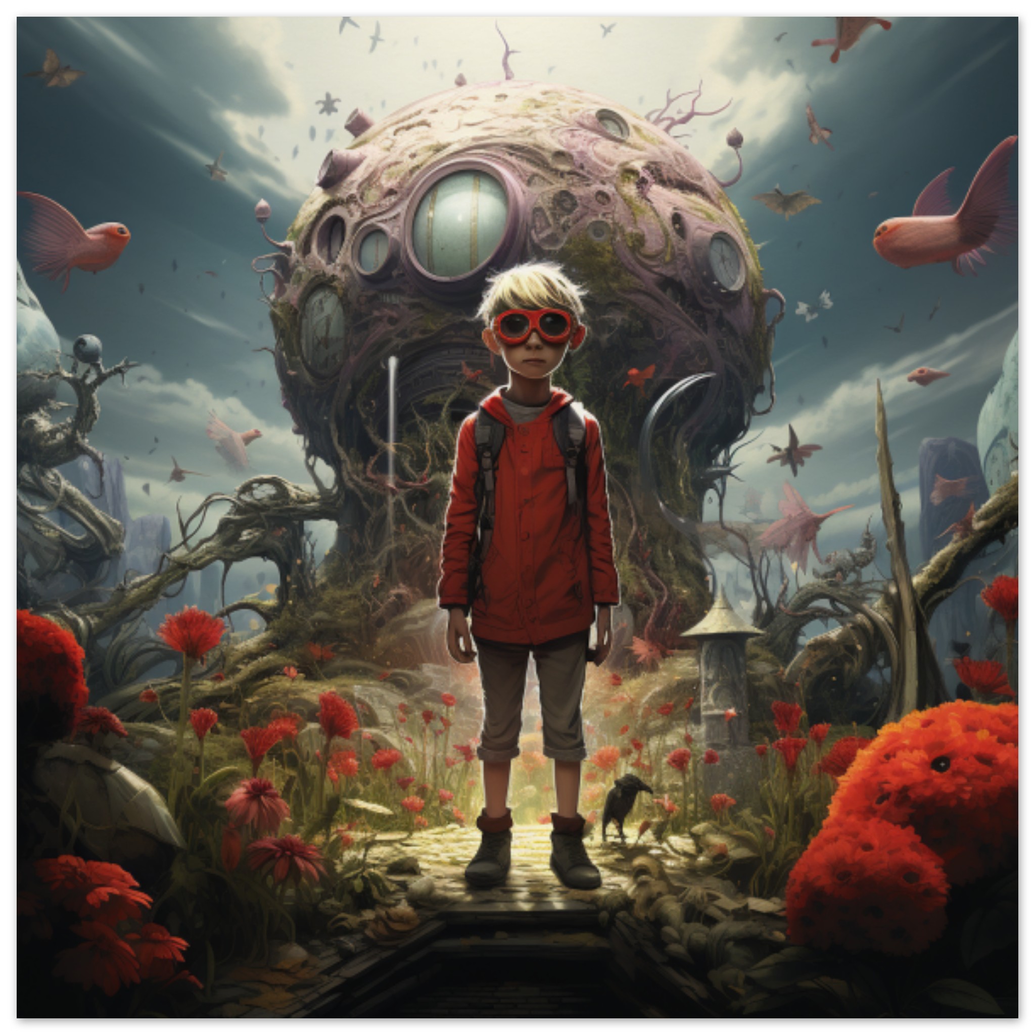 A young boy stands in front of a mesmerizing scene: a giant alien planet looming in the background. The boy is wearing a red jacket, his curious gaze fixed on the otherworldly sight. Surrounding him are various marine creatures – fish with wings, swimming in an underwater reef. In the distance, an aquarium filled with vibrant marine life captivates the viewer. A teddy bear lays nearby, adding a touch of whimsy to the surreal setting. The dominant colors of grey and black create a mysterious atmosphere, heightened by the accent color of deep red.