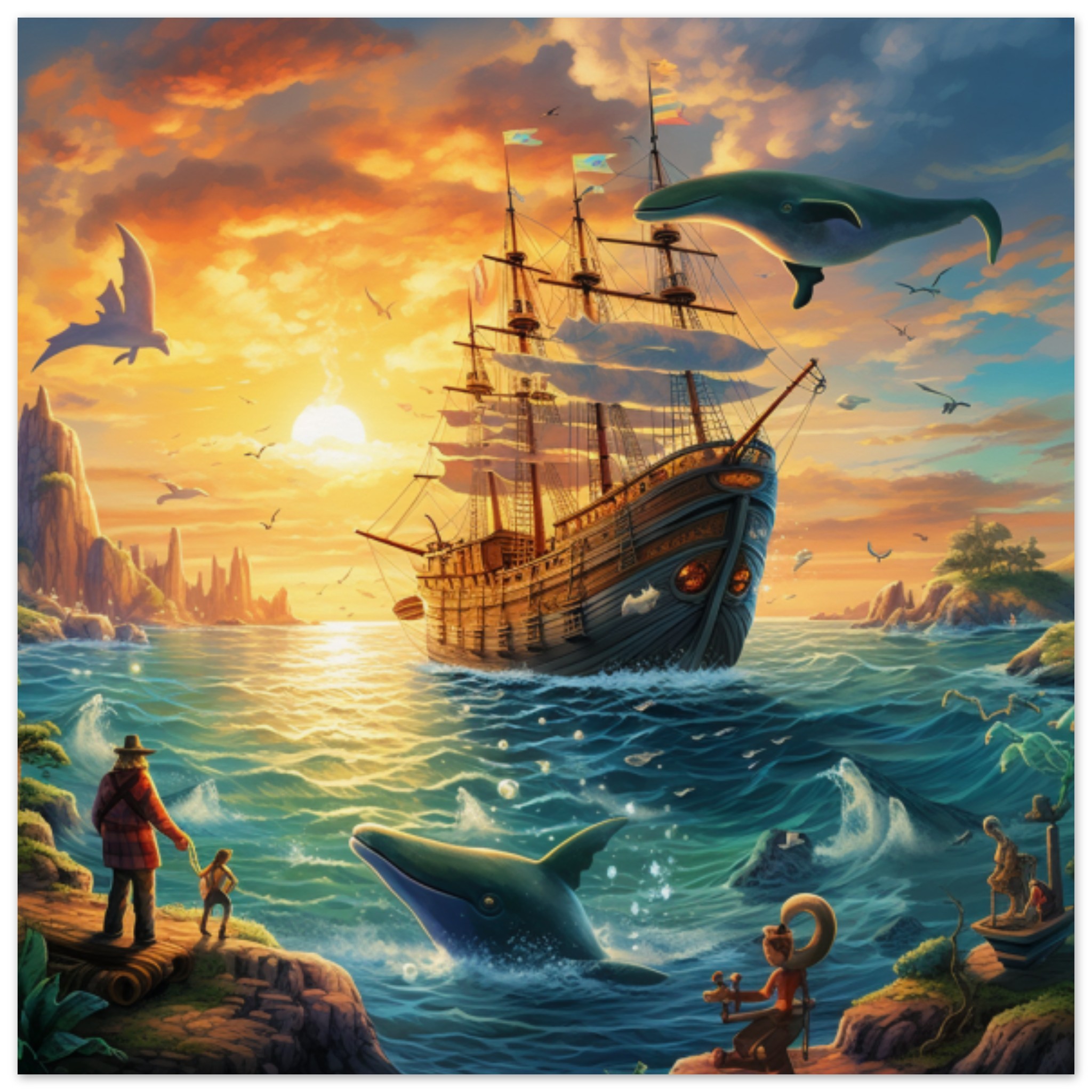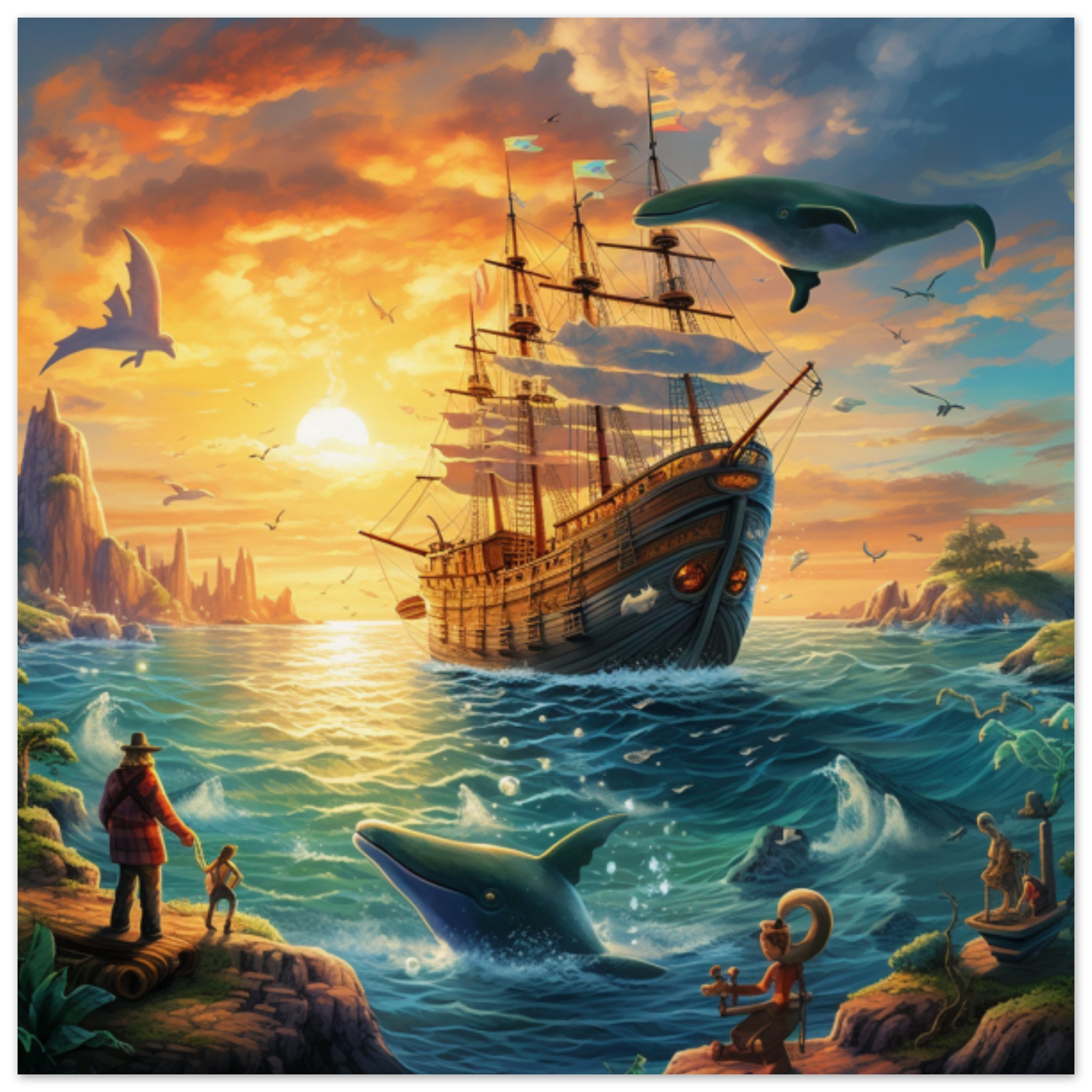 A beautiful painting of a ship sailing in the ocean, with a yellow sky and brown clouds in the background. The ship is detailed with masts and flags, while a marine mammal swims gracefully in the water below. In the foreground, a boat with a person in a red plaid coat can be seen. The scene captures a serene outdoor setting, with a bird flying overhead adding to the peaceful atmosphere. The artwork evokes a sense of adventure and tranquility, inviting viewers to imagine themselves on a similar voyage at sea.