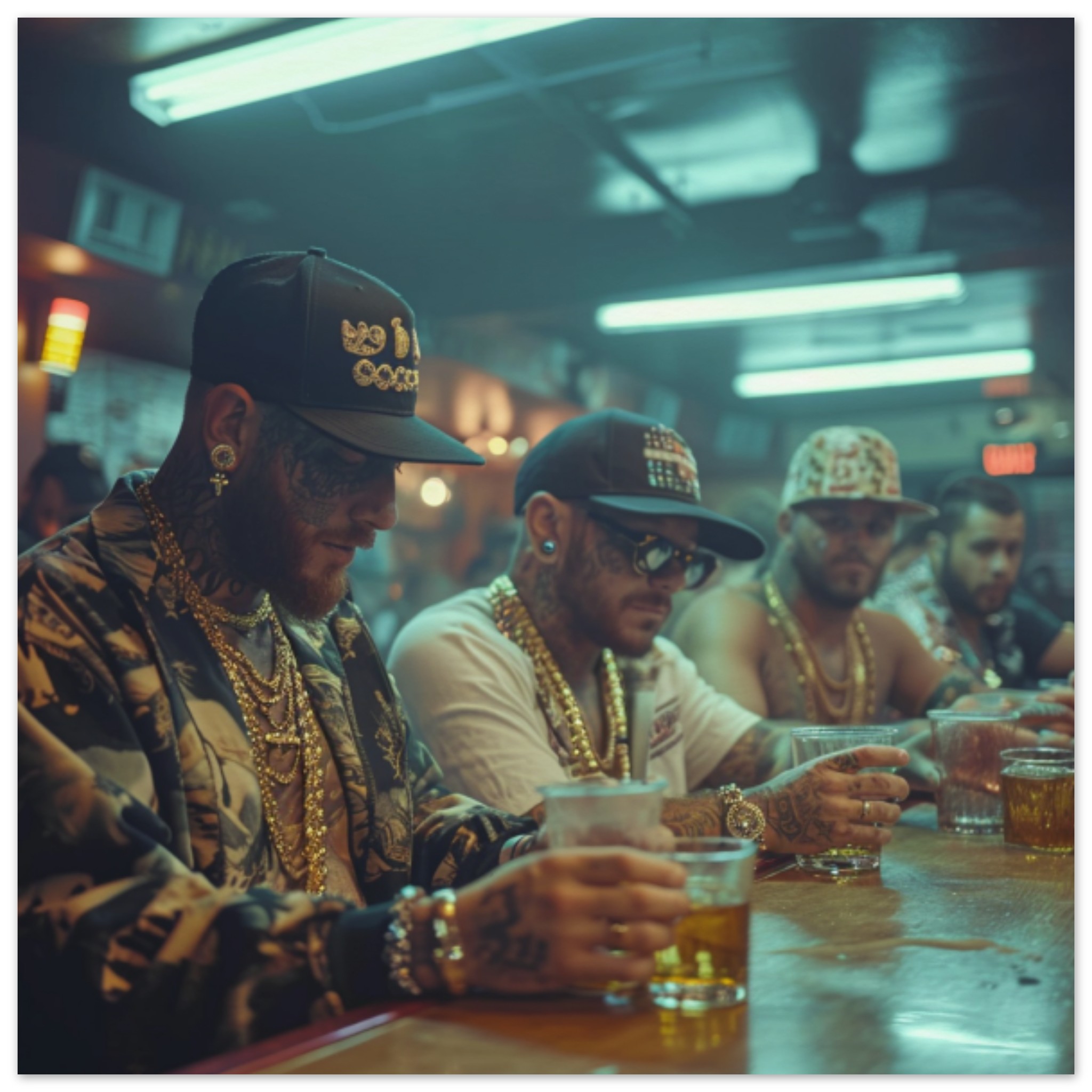 A group of six men are sitting at a table indoors, enjoying drinks. The men are dressed in casual clothing and hats, with one man wearing gold jewelry. One man is holding a glass of beer, and there is a close-up of the glass. The room has a brown background and a grey ceiling. The men appear to be socializing in a pub or bar setting. One man has a tattoo on his hand. Overall, the image captures a casual and relaxed atmosphere with friends enjoying each other’s company over drinks.