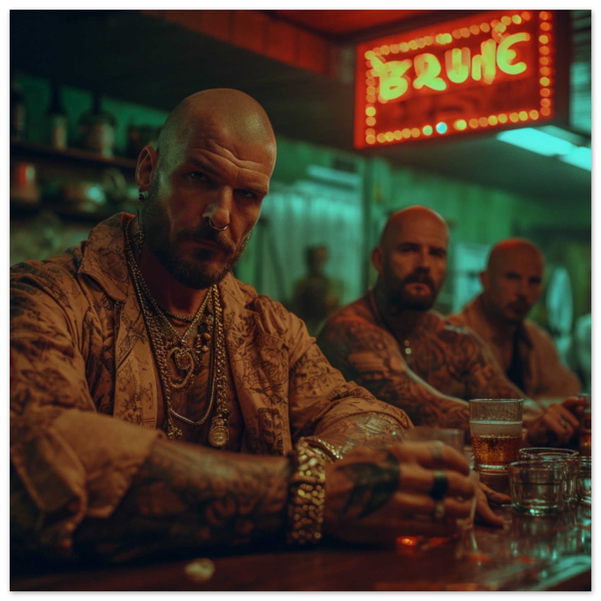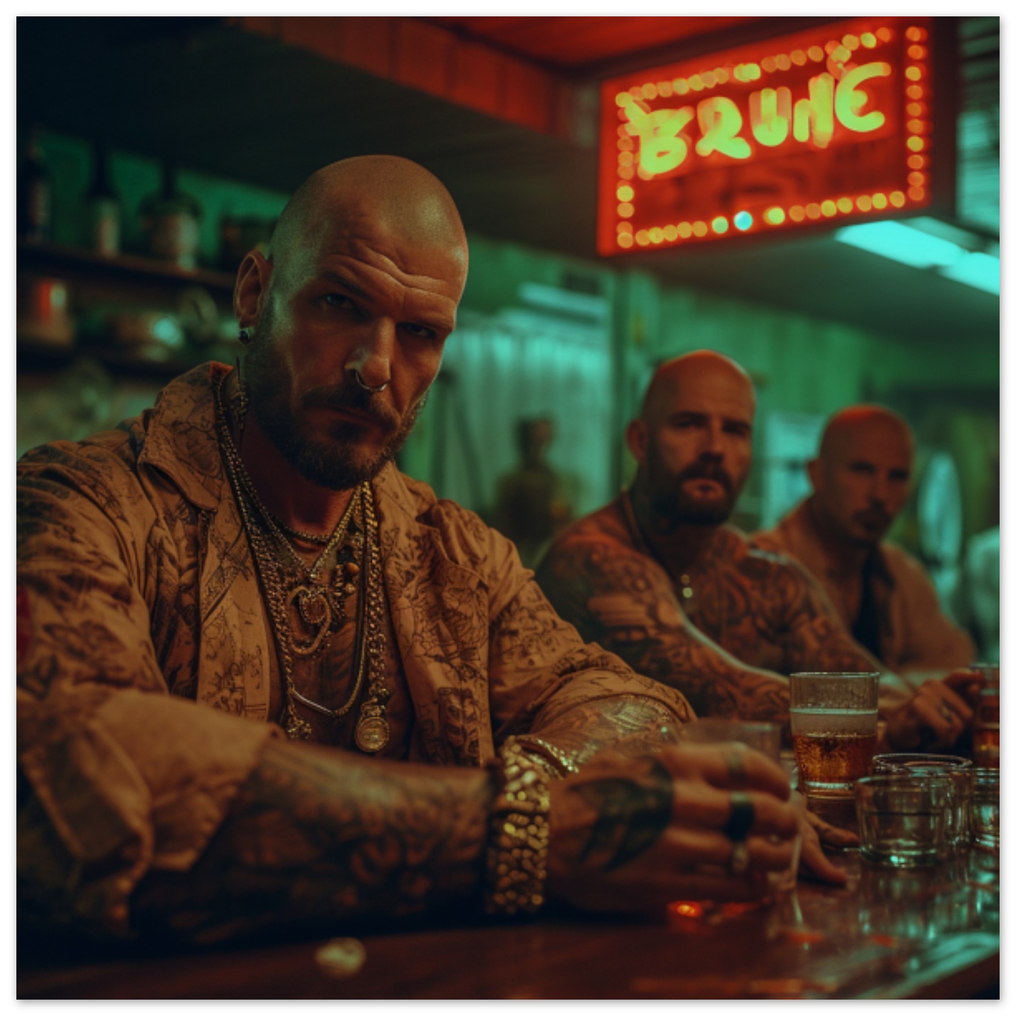 A group of four men are sitting at a wooden bar in a dimly lit indoor setting. The men are casually dressed in black and brown clothing, one of them holding a glass of liquid. The dominant colors in the image are green and brown, with an accent color of teal. The men’s faces are partially visible, with one man in close-up, showcasing a gold band on his hand. The image is not black and white, and there are objects such as a table and glasses on the bar. The overall scene exudes a relaxed and social atmosphere.