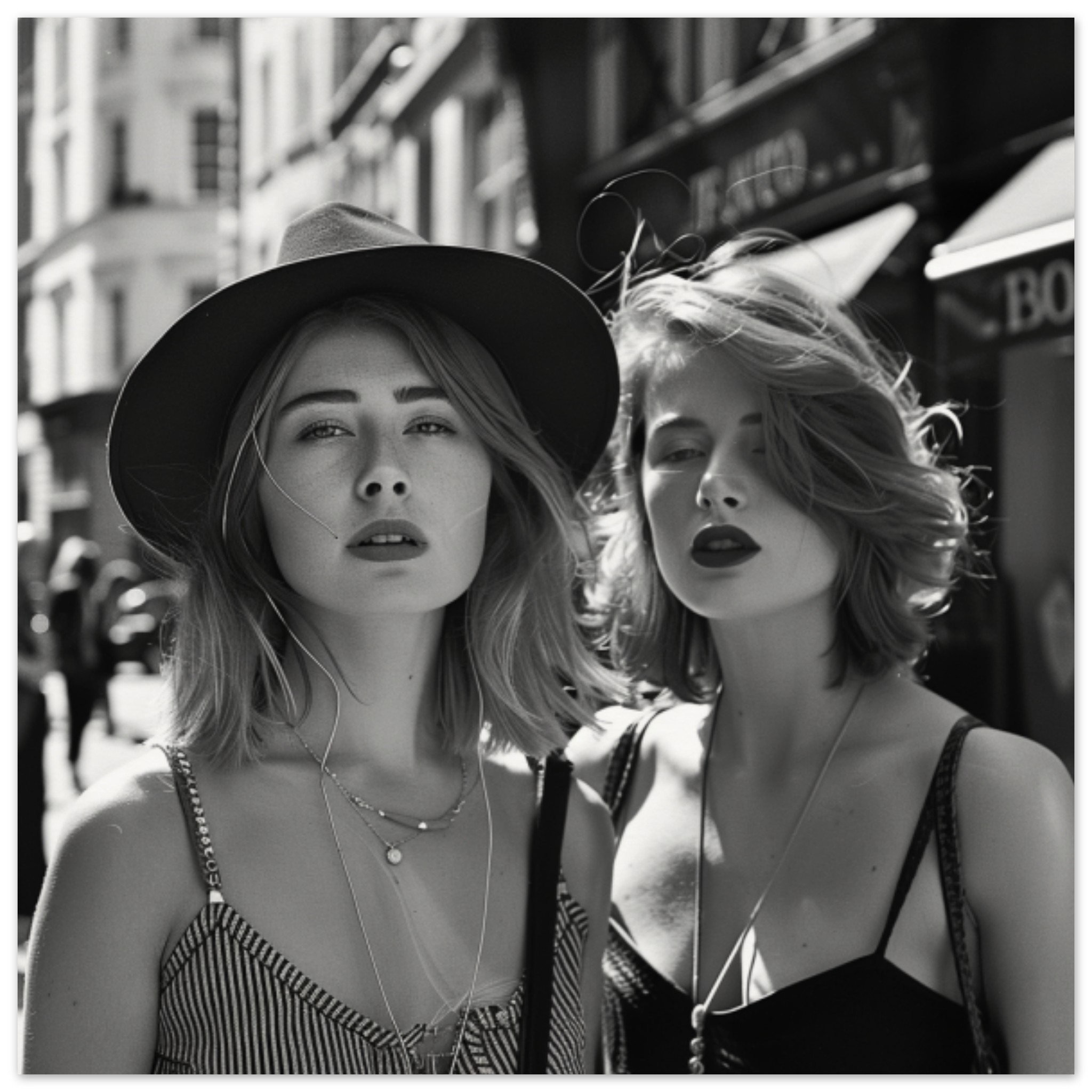 Two women are posing for a picture outdoors on the street. Both are wearing fashionable black and white clothing. One woman is smiling with her eyes closed, while the other is wearing a stylish sun hat and earphones. The image is in black and white, emphasizing the classic street fashion look. One woman is wearing an academic gown, adding an academic flair to the scene. The dominant colors in the image are grey, black, and white. The women are the main focus of the image, exuding style and confidence as they pose for the camera.