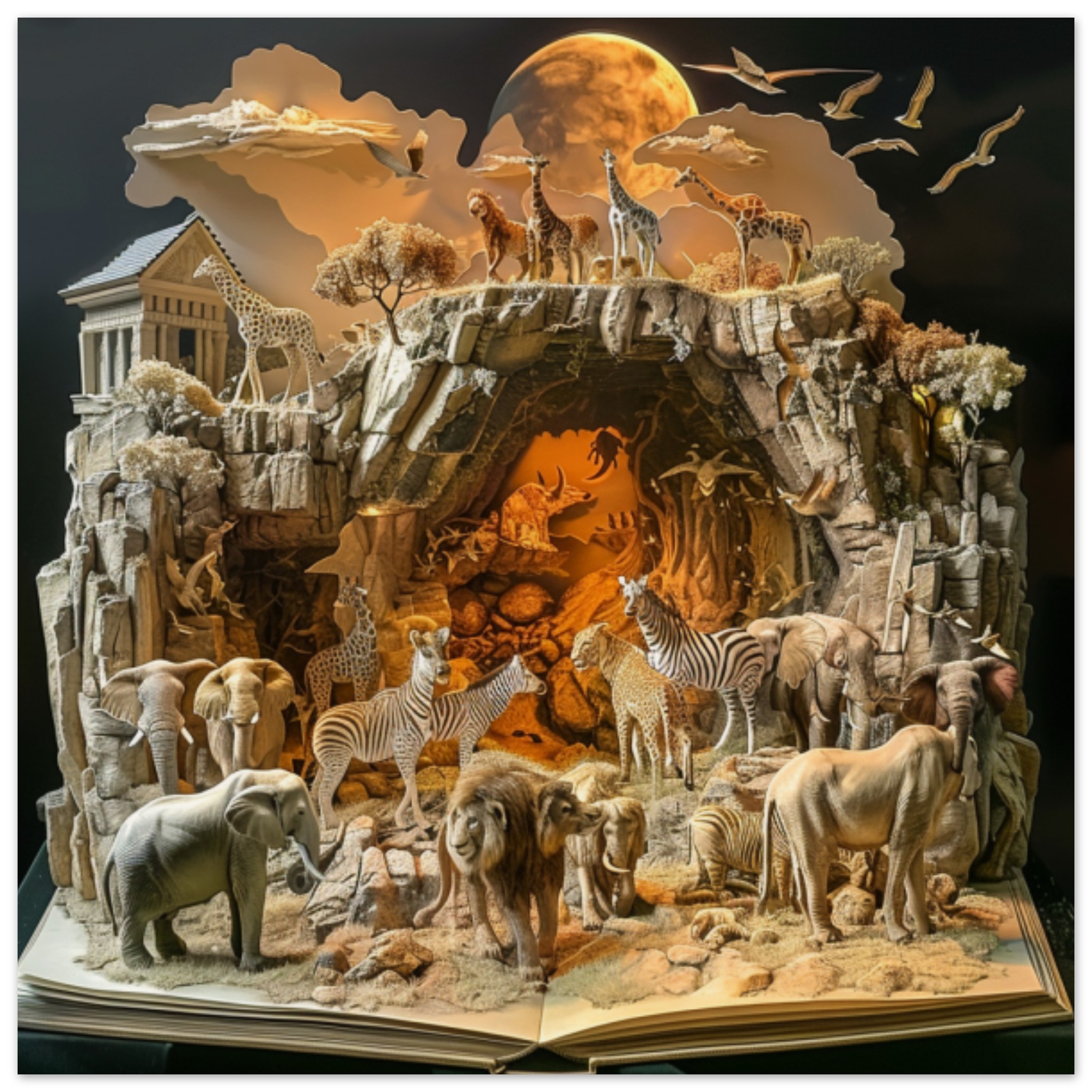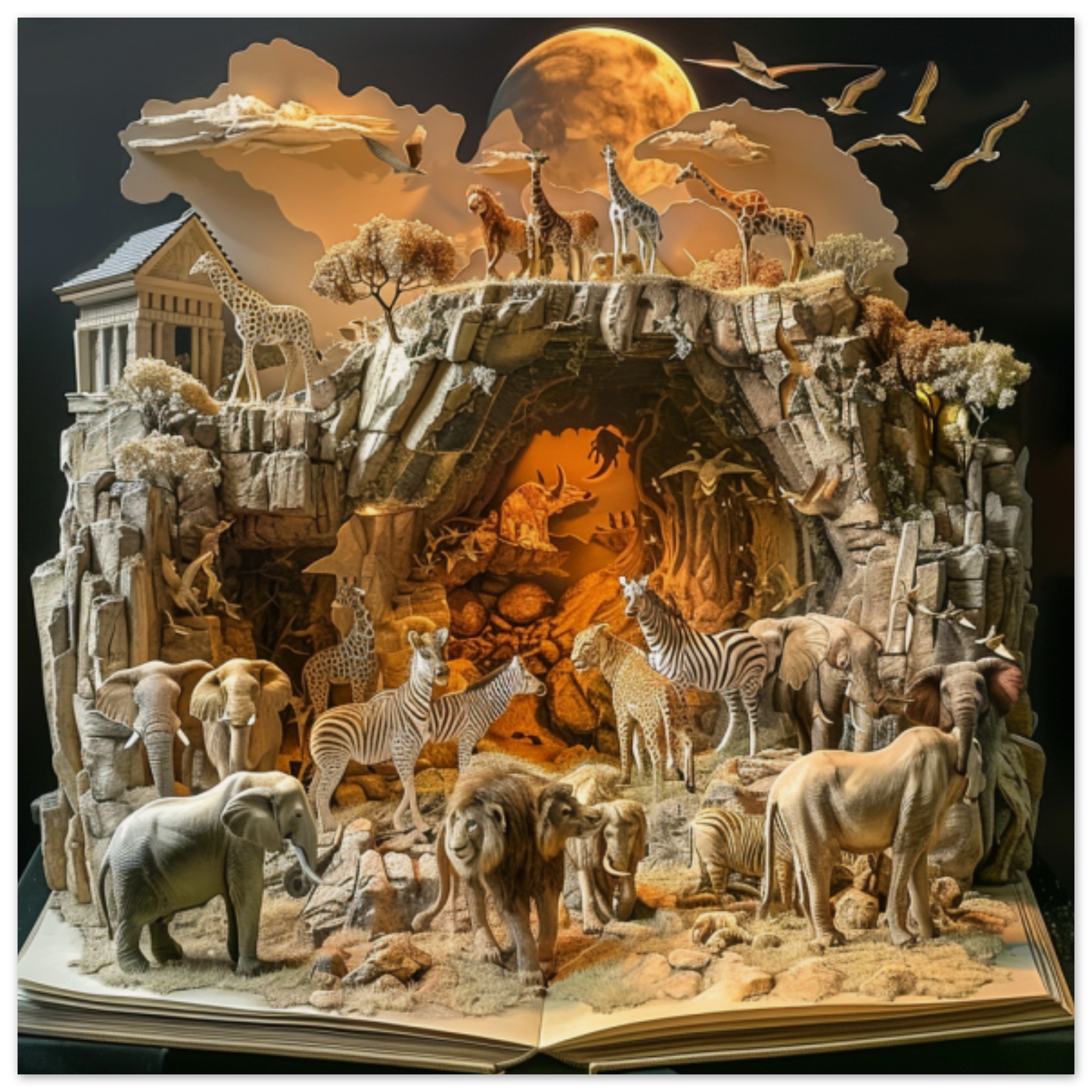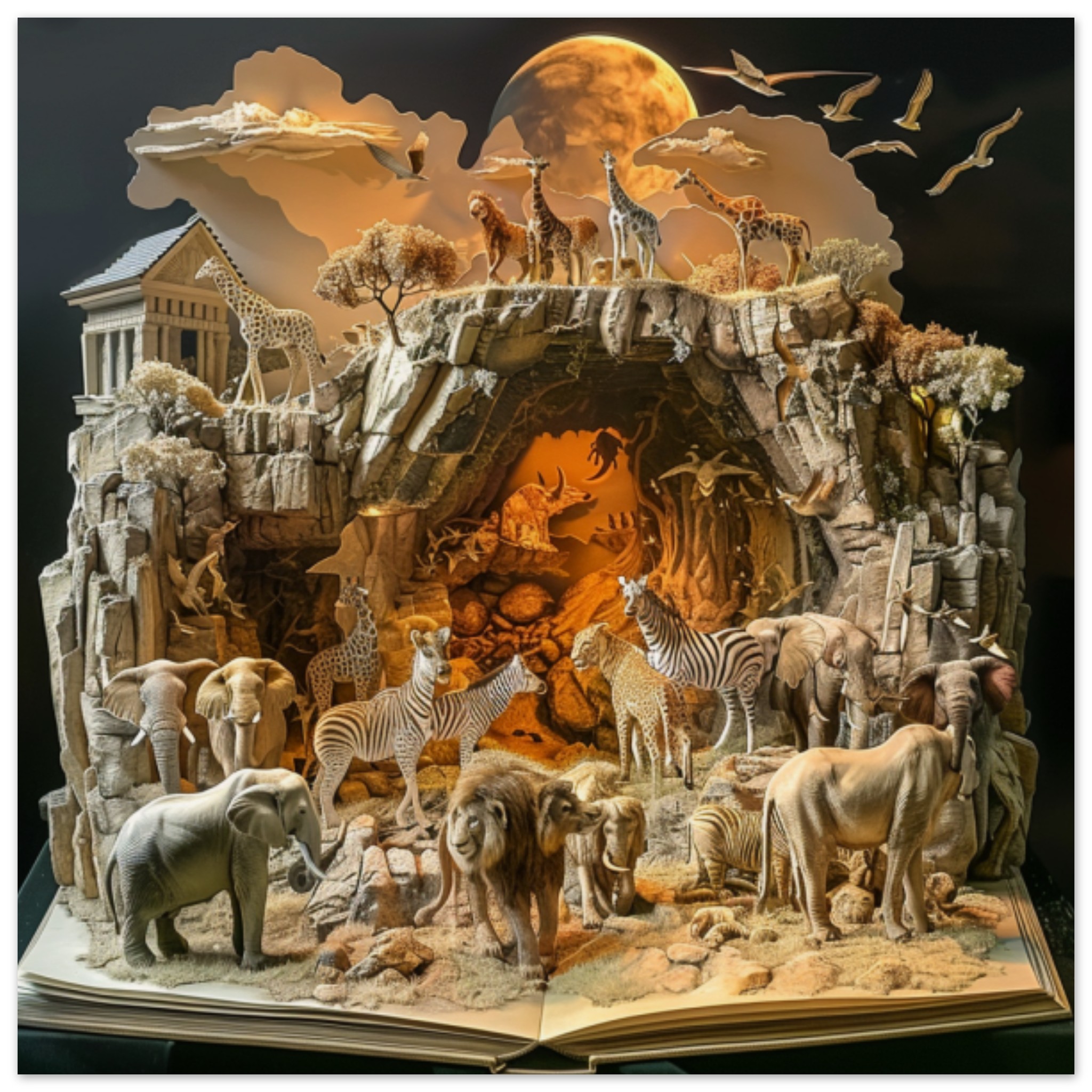A beautifully illustrated book featuring a variety of animals and birds, with a focus on mammals like zebras, giraffes, elephants, lions, and cheetahs. The book showcases stunning artwork of these creatures in different settings, such as standing in a zoo exhibit, on rocks, and in natural fields. The dominant colors in the illustrations are brown and black, with accents of a vibrant orange color. The images convey a sense of wonder and appreciation for the diverse wildlife depicted, making it a captivating and educational resource for all animal lovers.