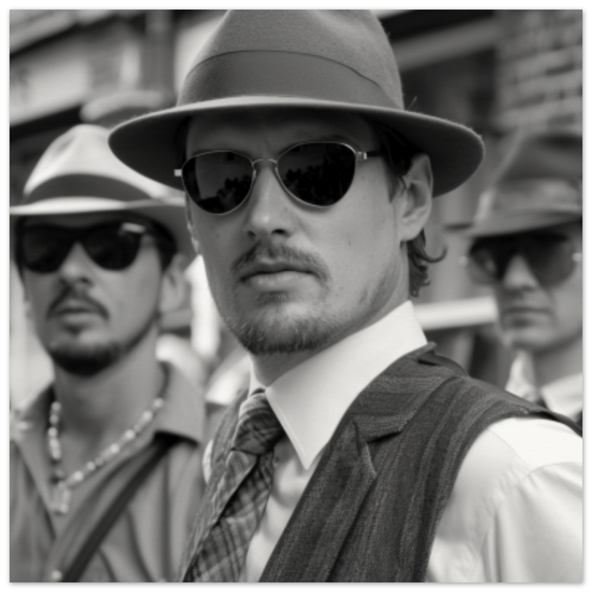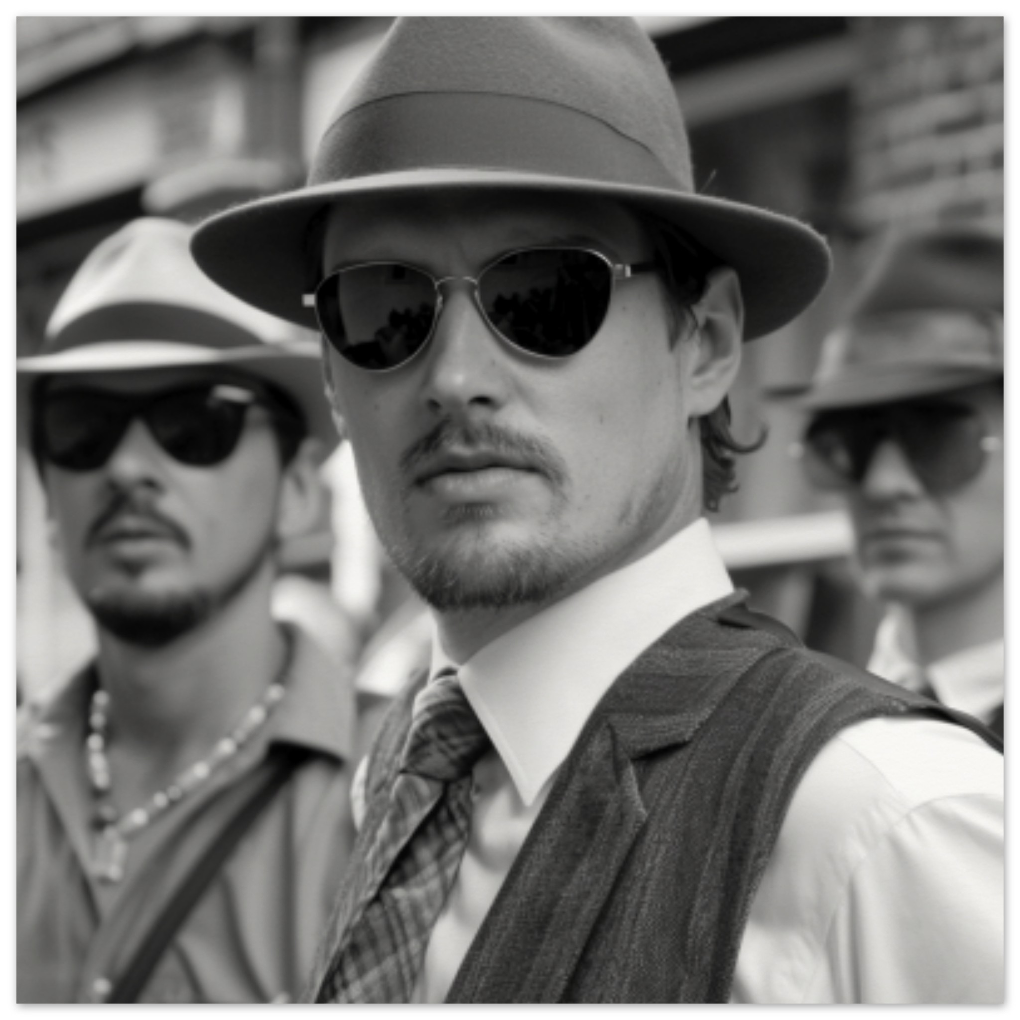 A group of three men are standing outdoors wearing stylish black and white outfits. Two of them are wearing fedora hats and sunglasses, while the third is sporting a visor cap. The men are casually dressed, exuding a sense of fashion and sophistication. The image is in black and white, with the dominant colors being grey, black, and white. The men appear to be in a relaxed urban setting, possibly outside a building. The focus is on their faces, showcasing their cool and confident expressions under the shade of their sunglasses.