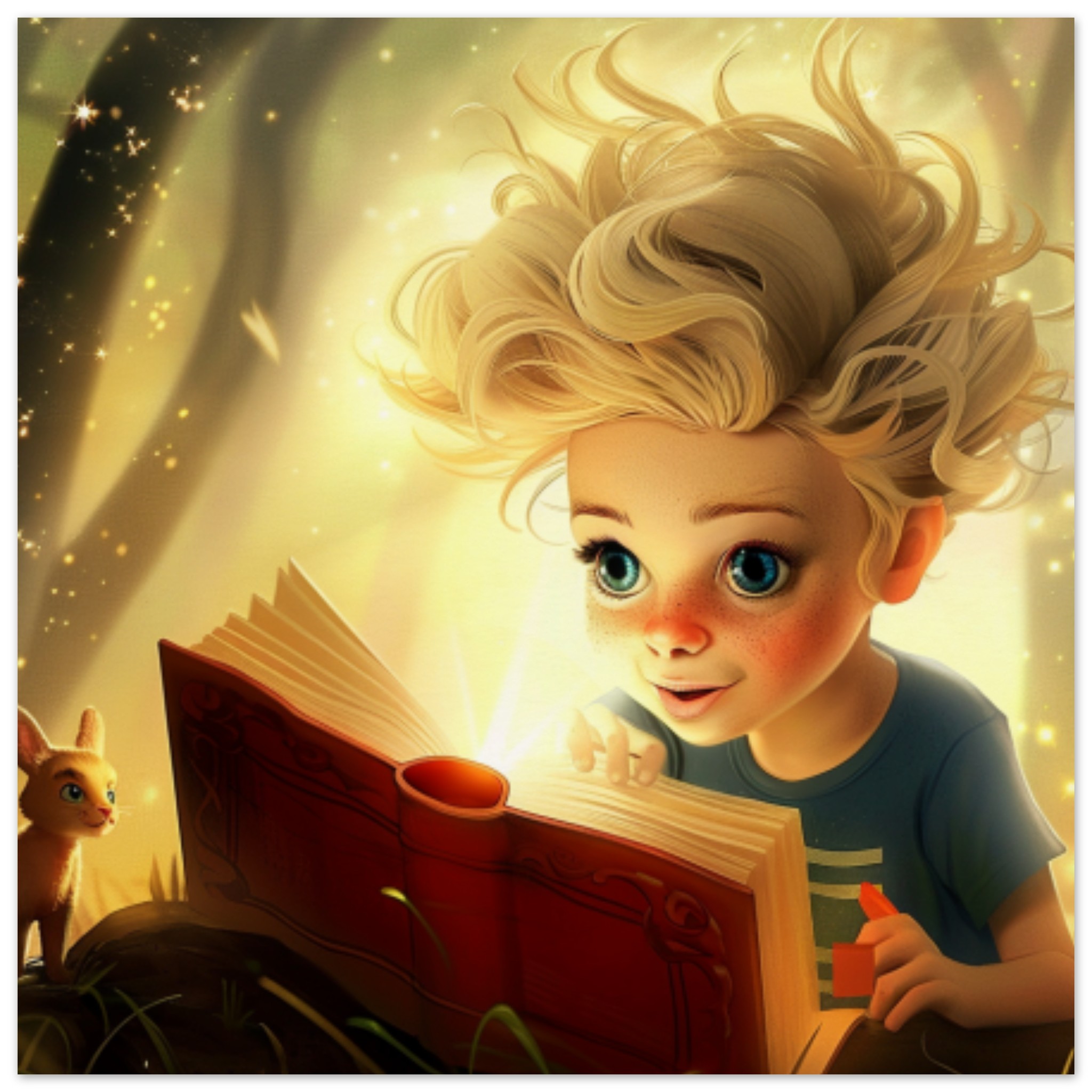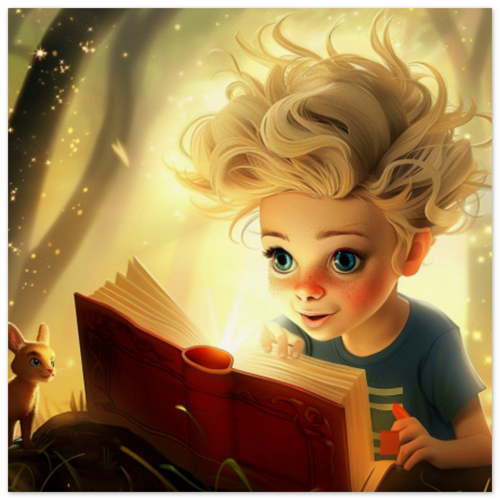 A colorful and whimsical cartoon illustration featuring a child engrossed in reading a book. The child is depicted with a joyful expression, sitting cross-legged on the floor. Surrounding the child are two cute animal plush toys – a fox and a cat. The background is a warm brown color, with accents of vibrant yellow. The scene exudes a cozy and playful atmosphere, perfect for sparking imagination and creativity in young minds. The artwork has a distinct anime-inspired style, adding a touch of uniqueness to the overall composition.