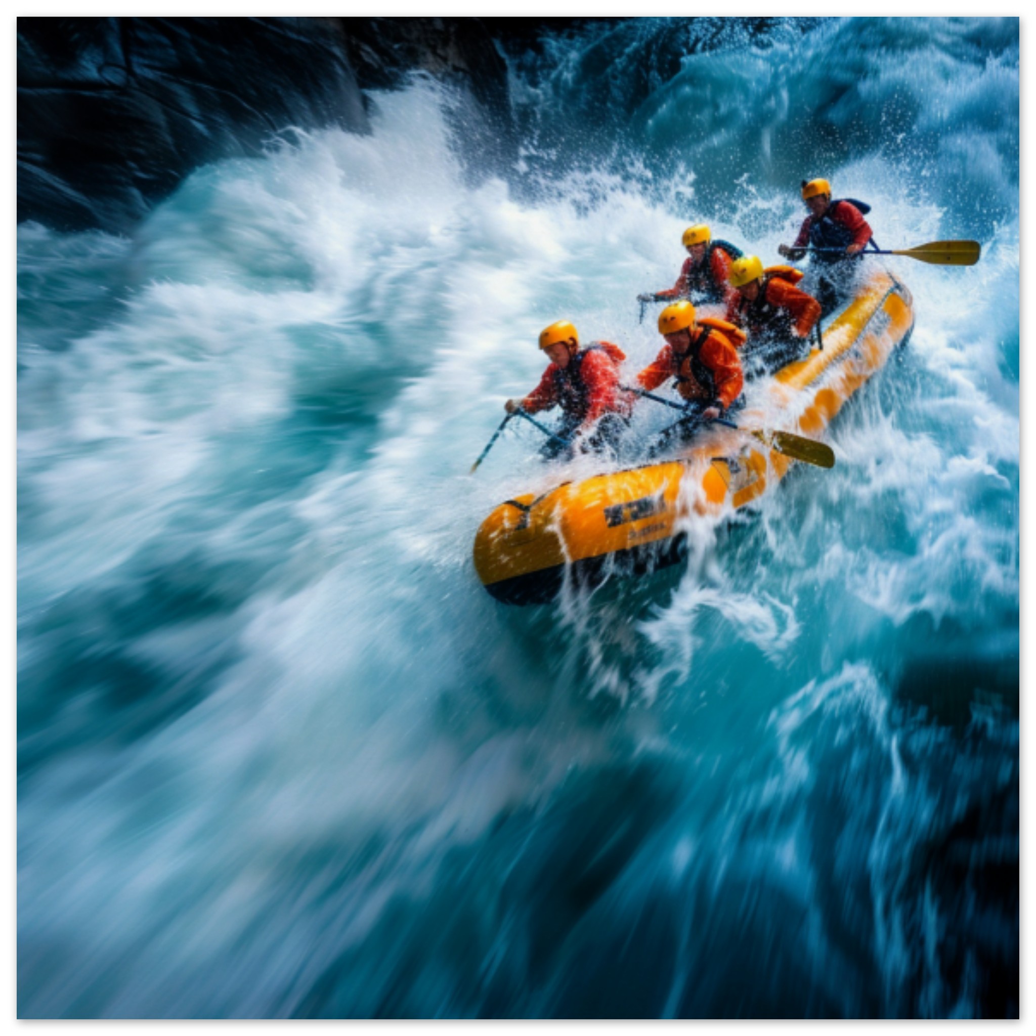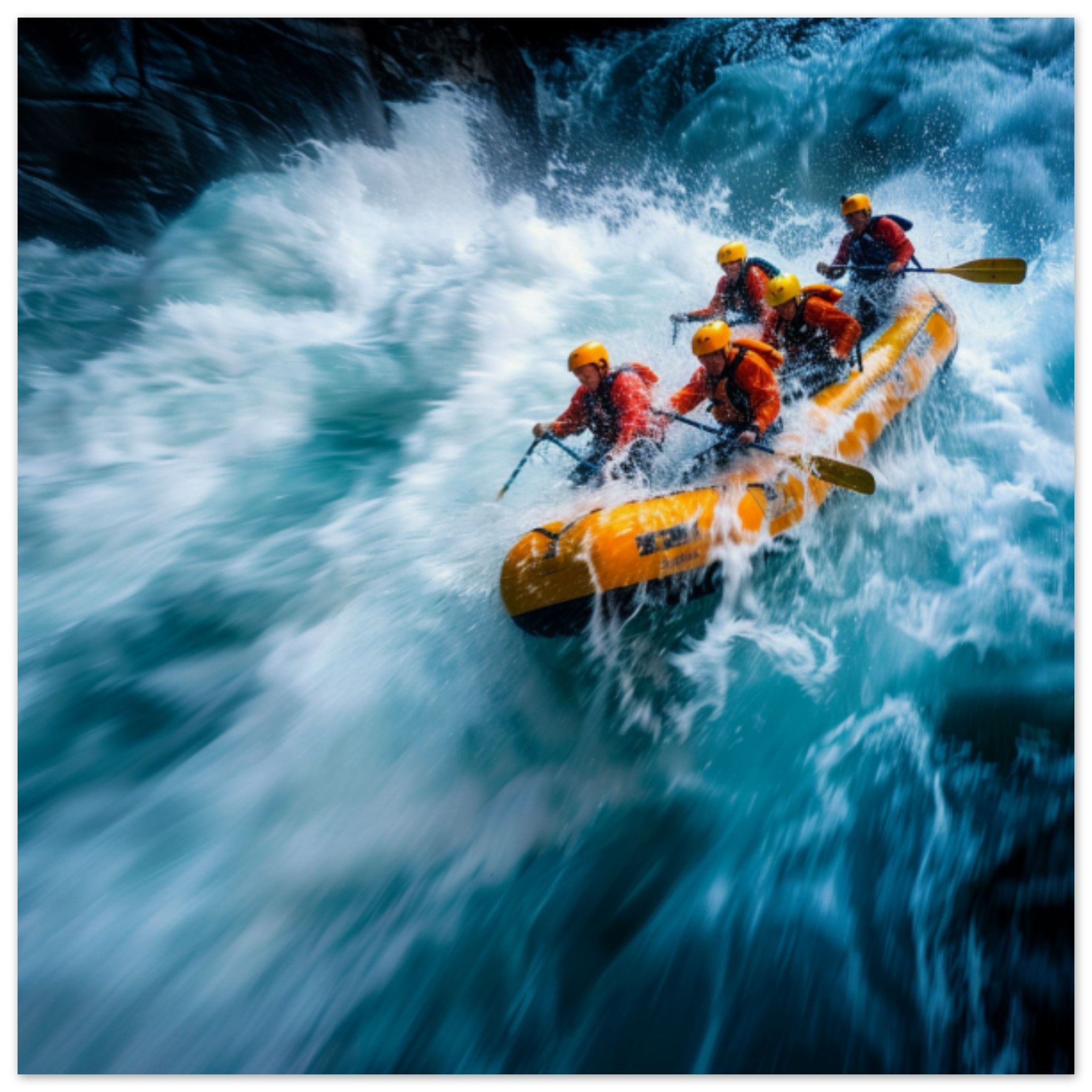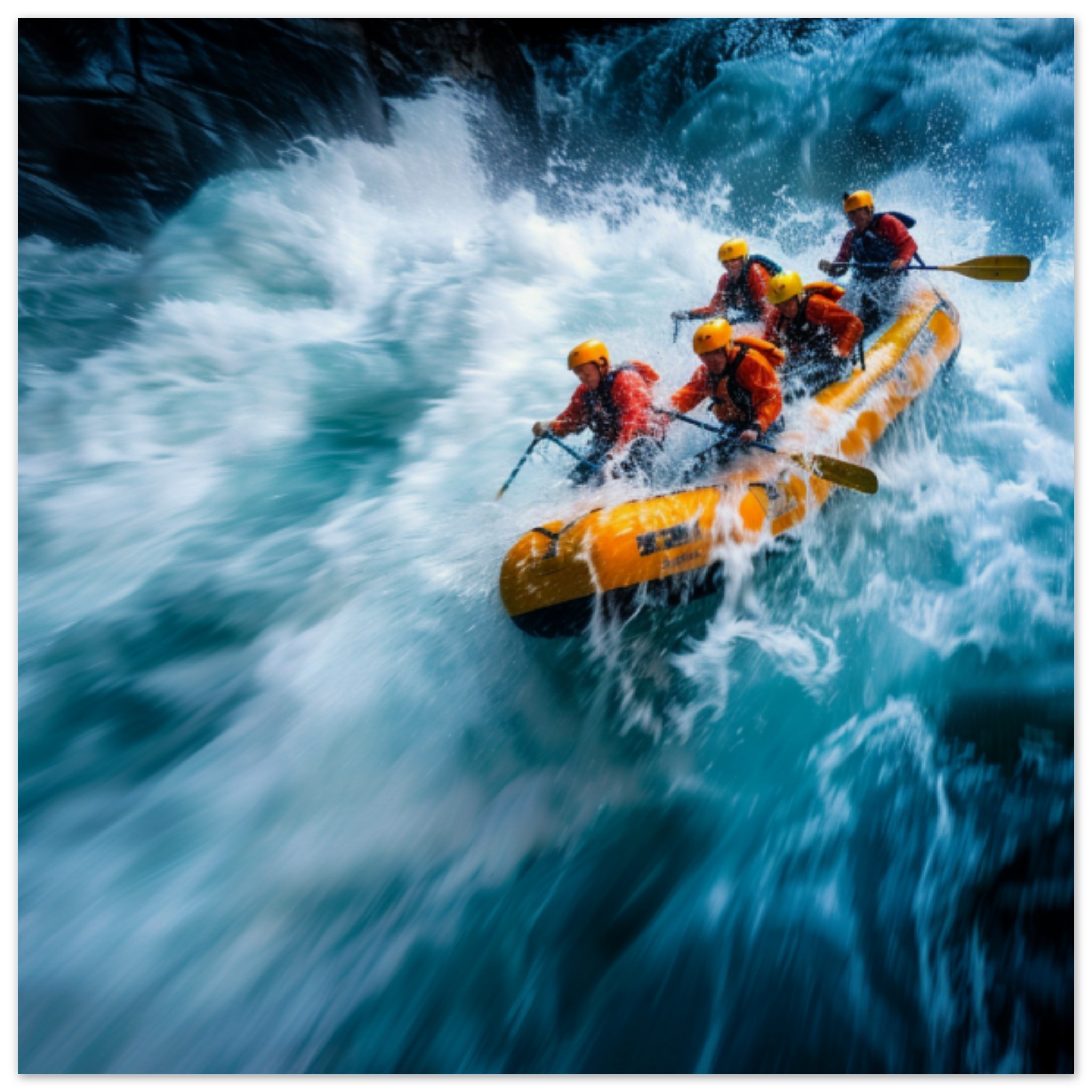 A group of people are enjoying a thrilling adventure on a raft as they navigate through rough waters. The scene captures the excitement of outdoor recreation, with individuals wearing life jackets and using paddles to steer the inflatable boat. The dominant colors of white and black contrast against the water, adding to the dynamic composition. The image exudes a sense of adrenaline and teamwork, as the group works together to conquer the rapids. This action-packed moment showcases the exhilarating experience of whitewater rafting, a popular surface water sport for thrill-seekers.