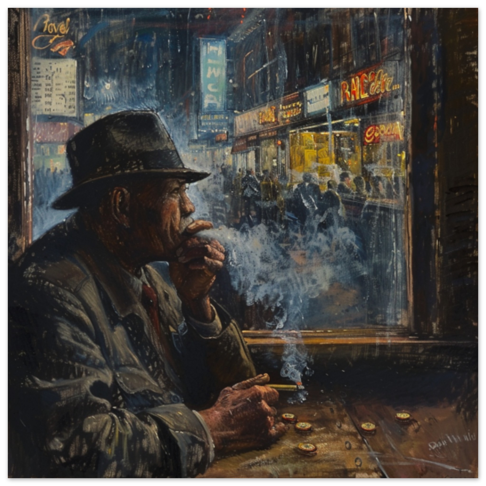 A man is depicted in a painting, wearing a hat and smoking a cigarette. The artwork shows the man’s face prominently, with a prominent focus on his headwear. The overall color scheme of the painting is dominated by shades of black and grey. The man’s expression is not visible, but he appears to be engaged in the act of smoking. The painting is set on a street backdrop, adding to the urban feel of the scene. The style of the painting is reminiscent of a drawing, with a realistic portrayal of the man’s features.