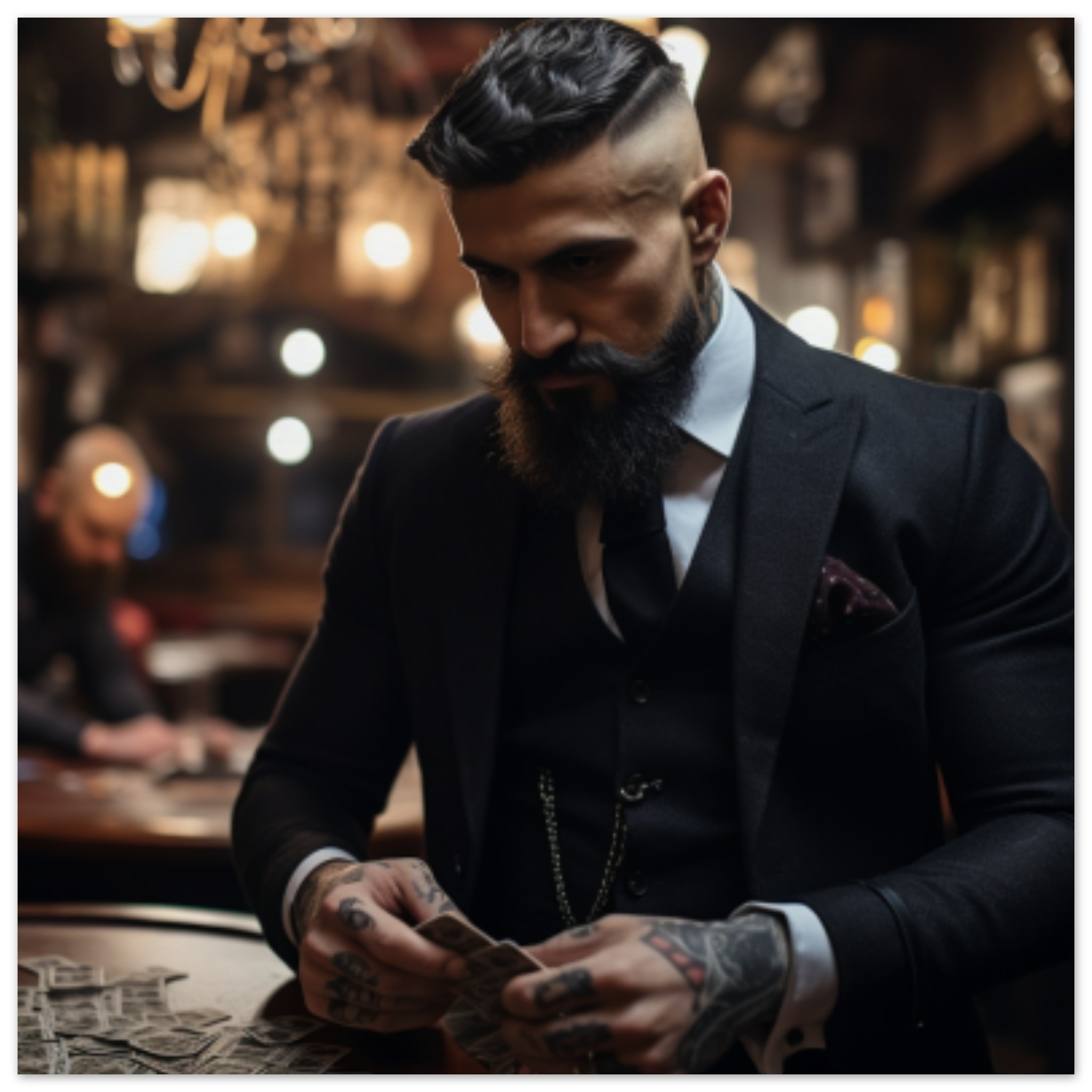 A well-dressed man is standing on a street, holding a deck of cards in his hand. He is wearing a black suit and appears focused on the cards in his hand. The image shows a close-up of the man’s face, revealing a slight beard. The background is also black, enhancing the man’s presence in the image. The man’s face is captured in a blurry manner, adding a mysterious element to the scene. Overall, the image conveys a sense of concentration and intrigue as the man engages with the deck of cards in his possession.