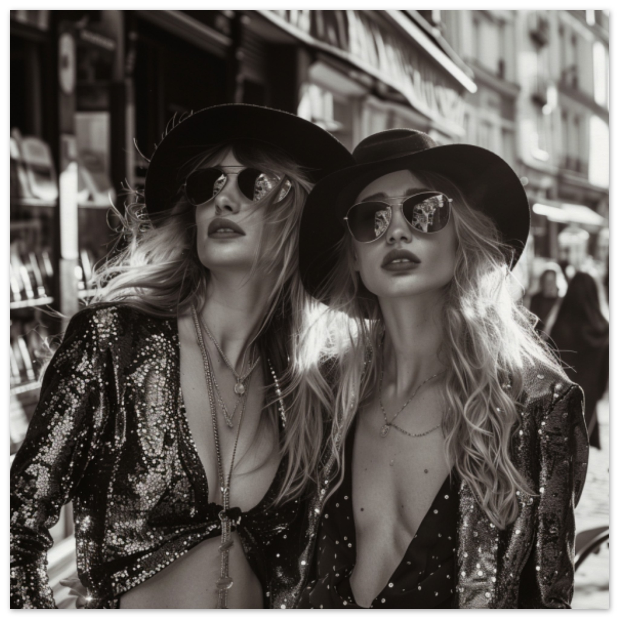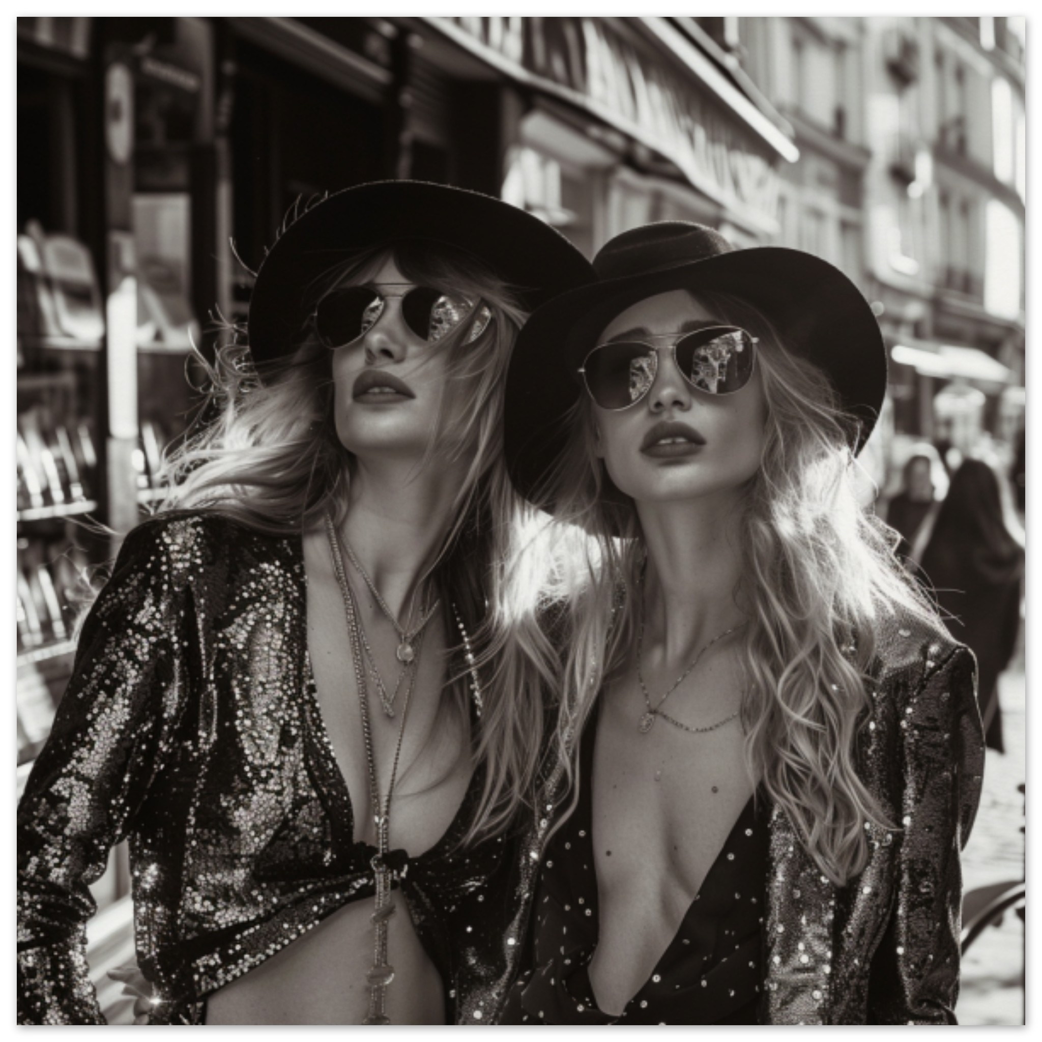Two fashionable women are standing outdoors, smiling as they wear stylish hats and sunglasses. The image is in black and white, with the dominant colors being grey and black. Both women have long hair and are dressed in trendy street fashion. The background shows a building. The women’s faces are not visible, but they are clearly enjoying themselves. The image is focused on the women’s fashion accessories, particularly their sunglasses. The overall vibe is chic and cool, perfect for a street style photoshoot.