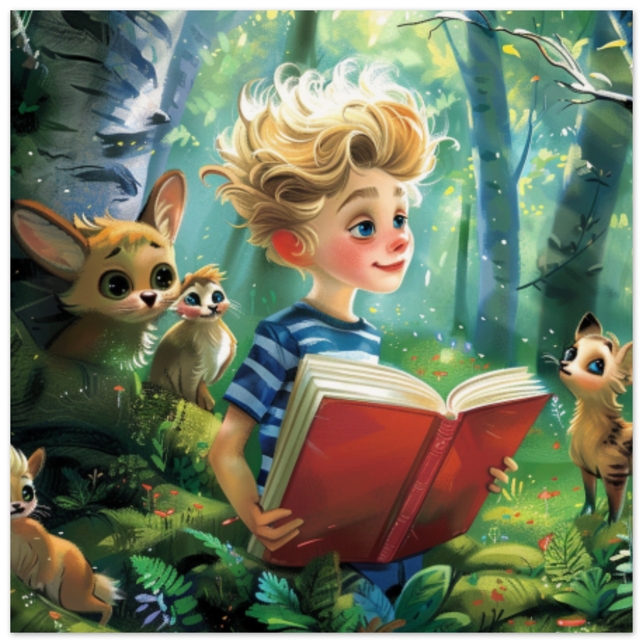 A young boy, depicted in a painting, is engrossed in reading a book while surrounded by lush greenery in the woods. The illustration features a cartoon animal, possibly a cat, in the background. The dominant colors are black and green, with an accent color of 988533. A fish object is also visible in the image. This whimsical scene captures the innocence and wonder of childhood, as the boy immerses himself in the magical world of books amidst nature. The artwork exudes a sense of tranquility and imagination, making it a charming and enchanting composition.