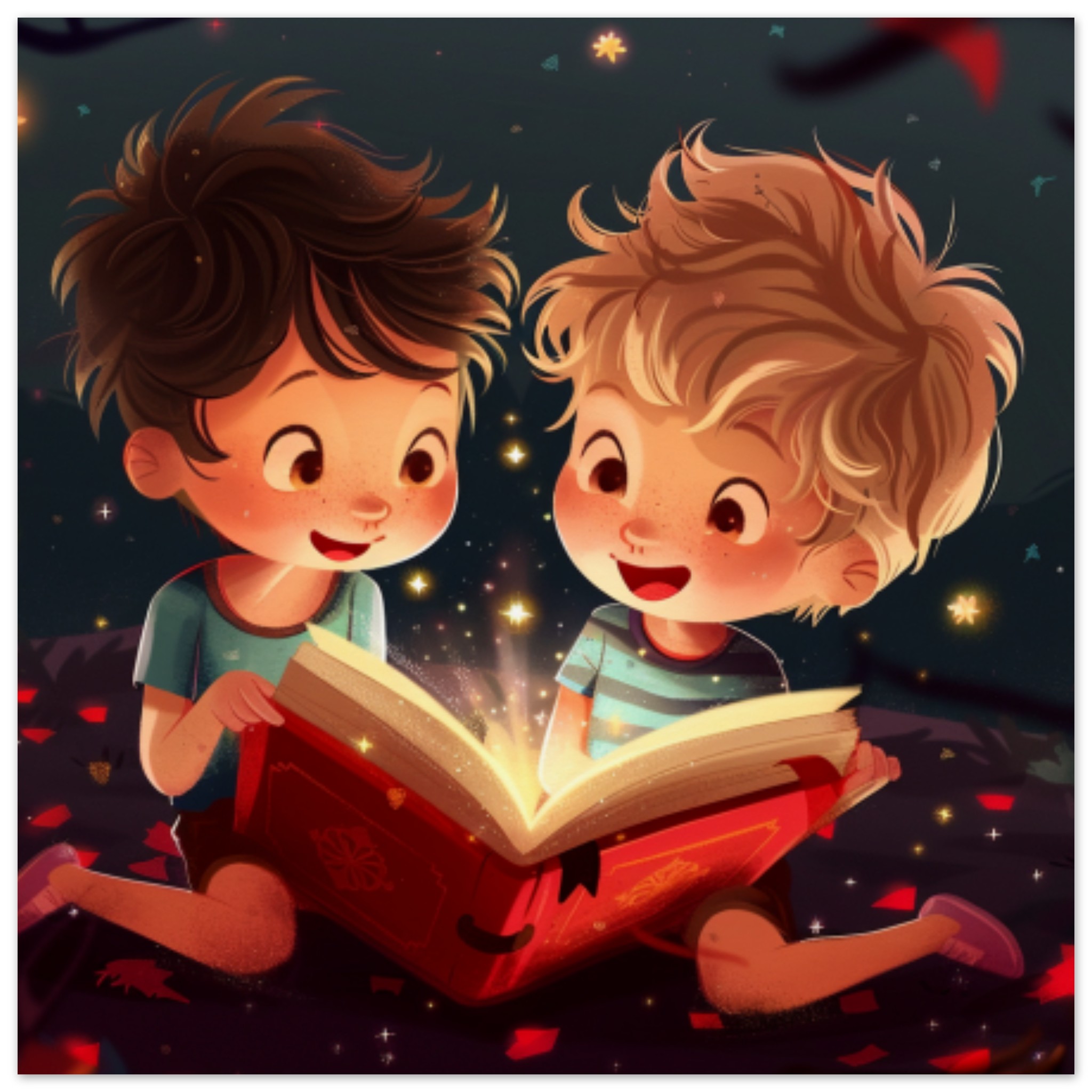 A colorful cartoon illustration featuring two young boys engrossed in reading a book together. The boys are depicted with big expressive eyes and wearing casual clothing. The background is a solid black color, emphasizing the boys and the book they are reading. The dominant colors are orange and black, with an accent color of BD6D0E. The image is not in black and white. The overall tone of the image is light-hearted and playful. The cartoon style is reminiscent of anime, with a high likelihood of being an animated cartoon.