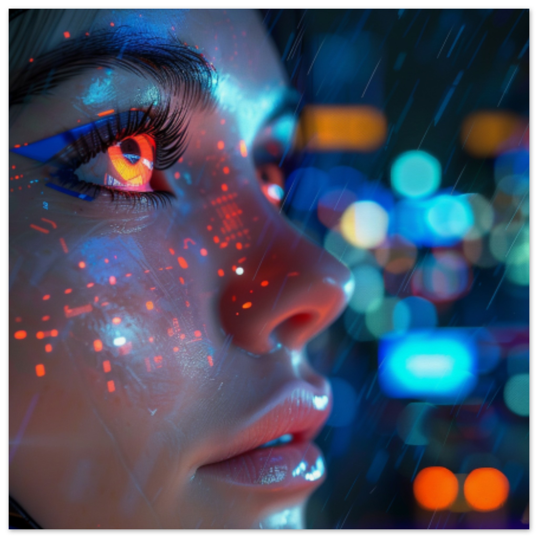 A woman is standing outdoors, looking up at the sky as rain falls around her. She appears calm and contemplative, with her face partially illuminated by a soft light. The background is dark, emphasizing the woman’s focused gaze. The dominant colors in the image are blue and black, creating a peaceful and introspective atmosphere. The woman’s features, including her eyelashes, are clear and detailed. The image conveys a sense of solitude and connection with nature, capturing a moment of quiet reflection on a rainy night.