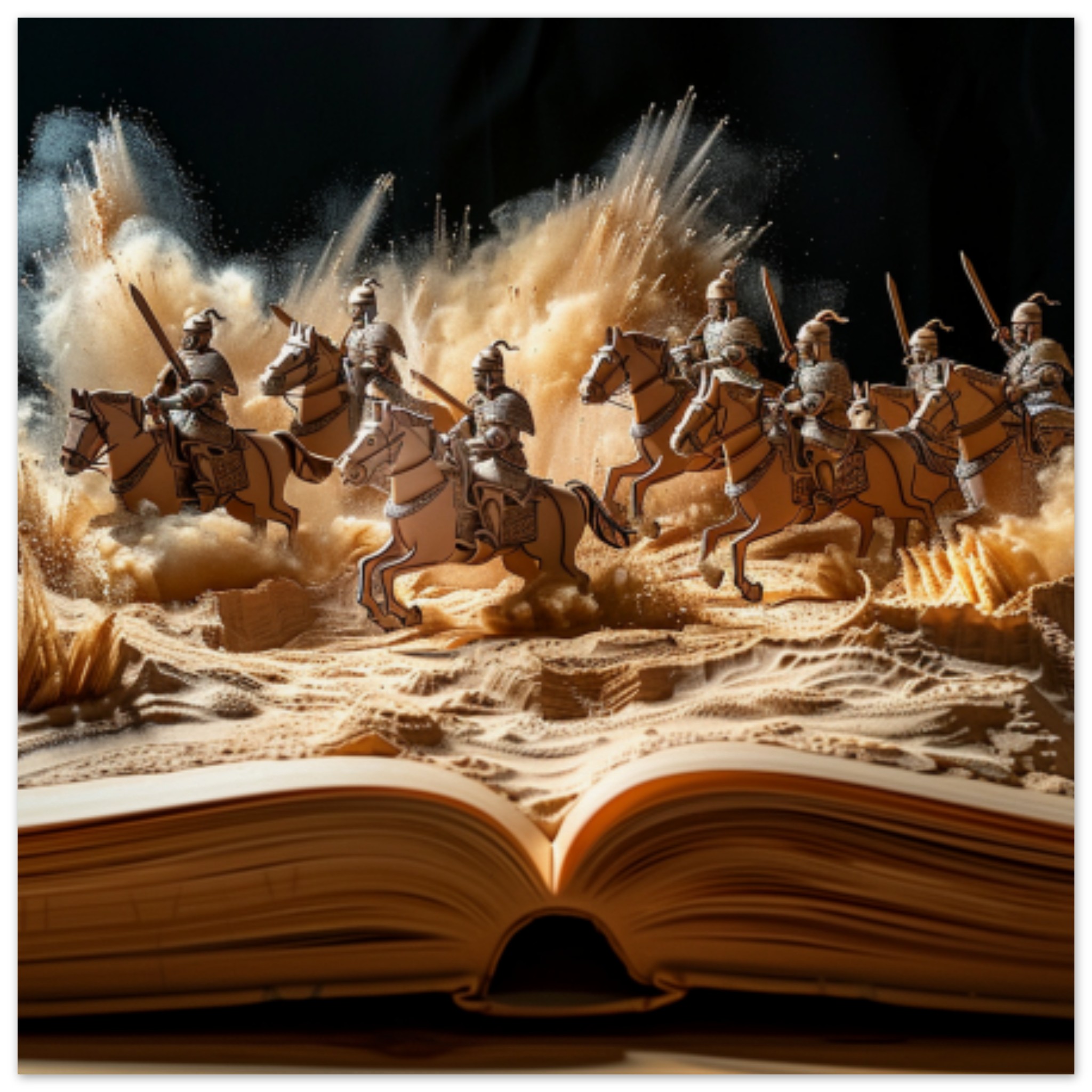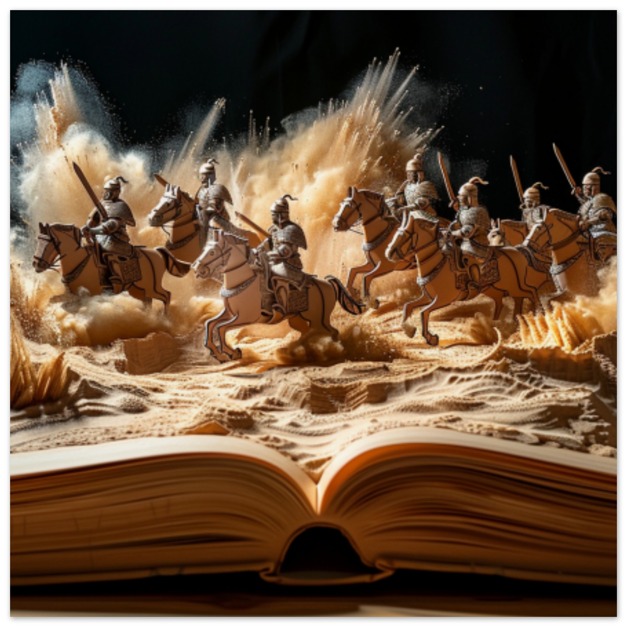A group of people are depicted riding horses in a book, with the background showing a dominant color of black and foreground in brown. The image is not adult, racy, or gory. The book is the main focus, with a dominant color of brown and an accent color of B84B02. The image is not black and white and is set outdoors. The caption describes a scene of people riding horses from the book, with no objects, faces, celebrities, landmarks, or text detected. The image is mainly categorized as abstract and outdoor.