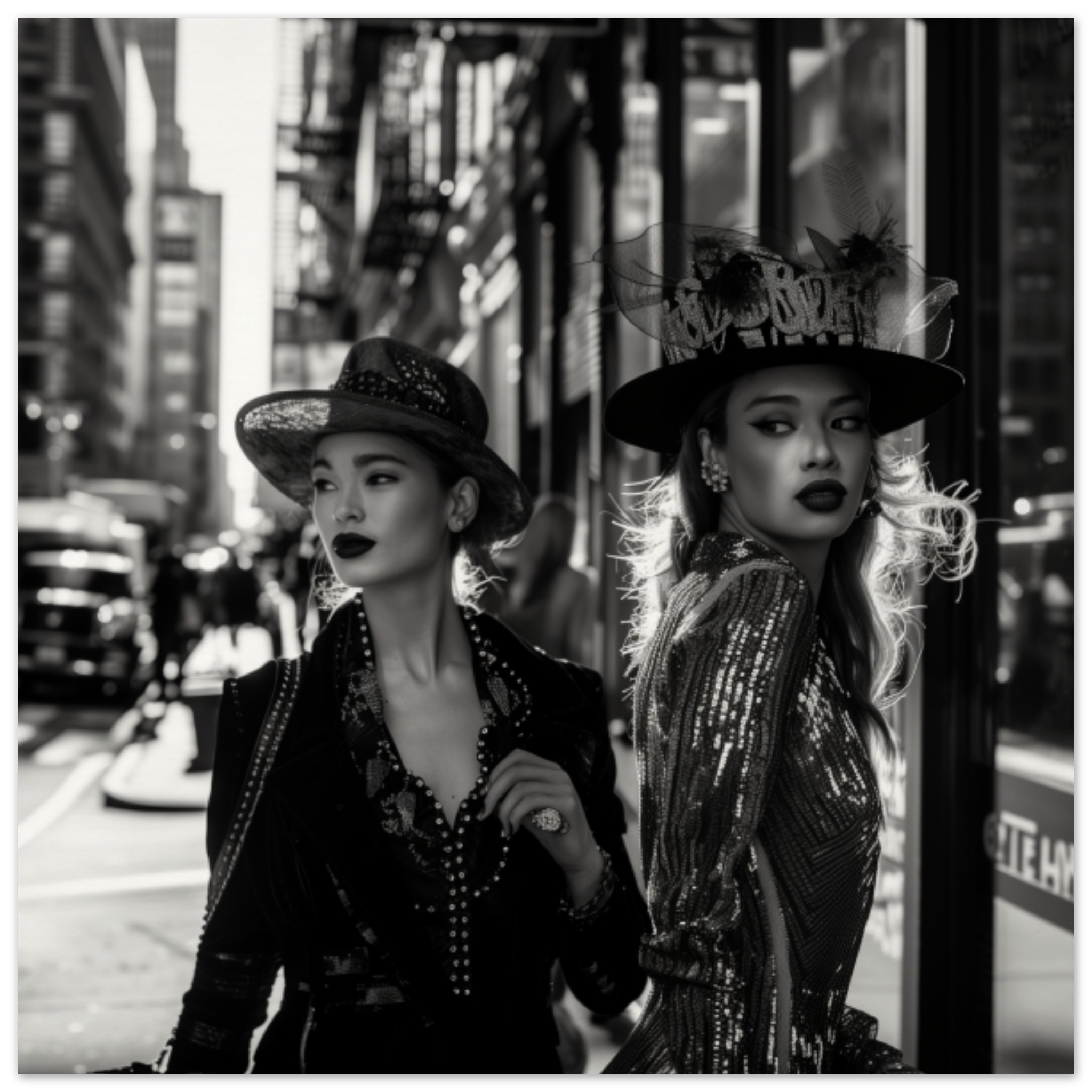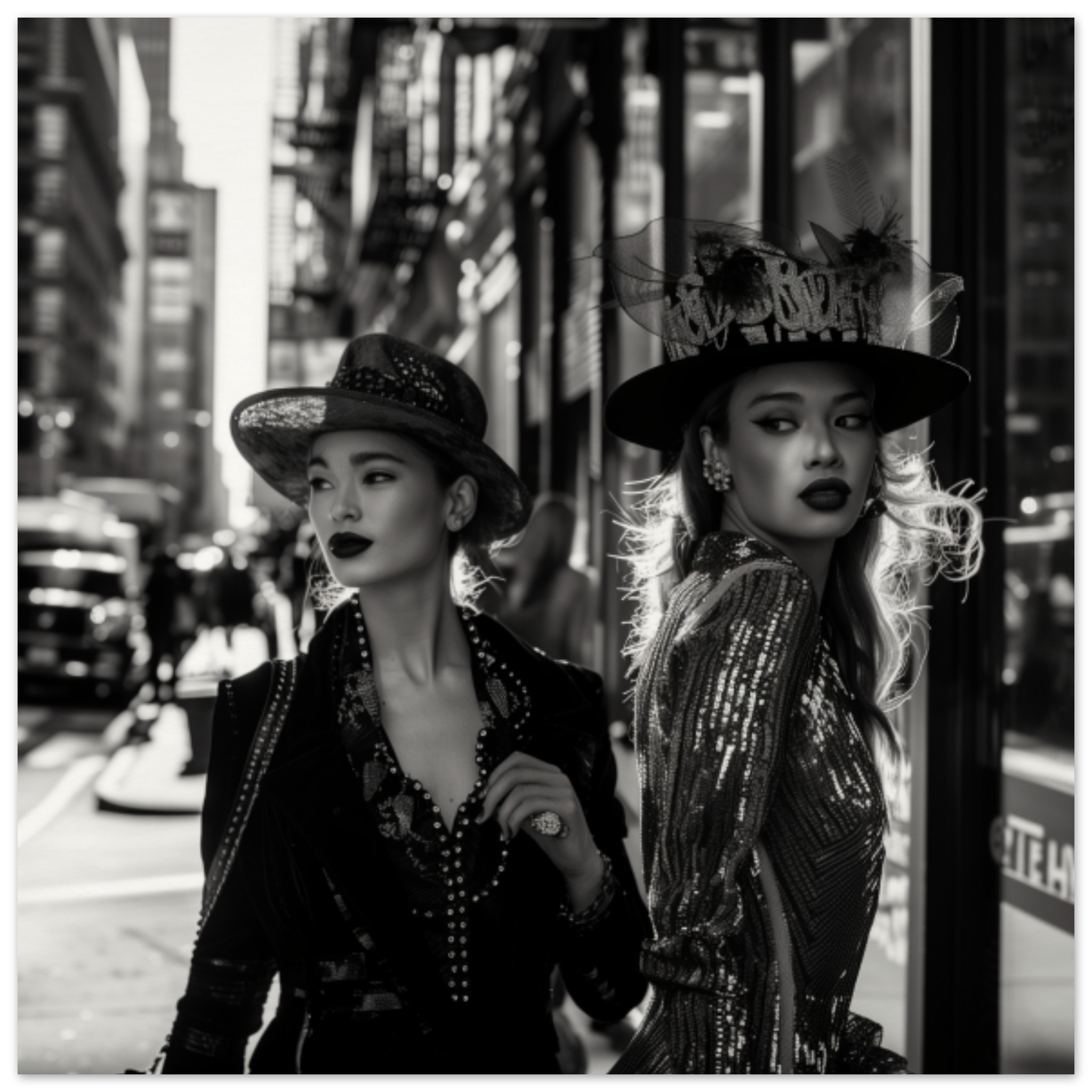 A group of four women, each wearing stylish hats, are posing for a photo on a bustling city street. The women are standing in front of a black car parked on the side of the road. The image is in black and white, with dominant colors of black, grey, and white. Two of the women are in focus, with one wearing a hat and a sequined top. The background consists of buildings and a sidewalk. The women’s faces are partially obscured, adding a sense of mystery to the scene.