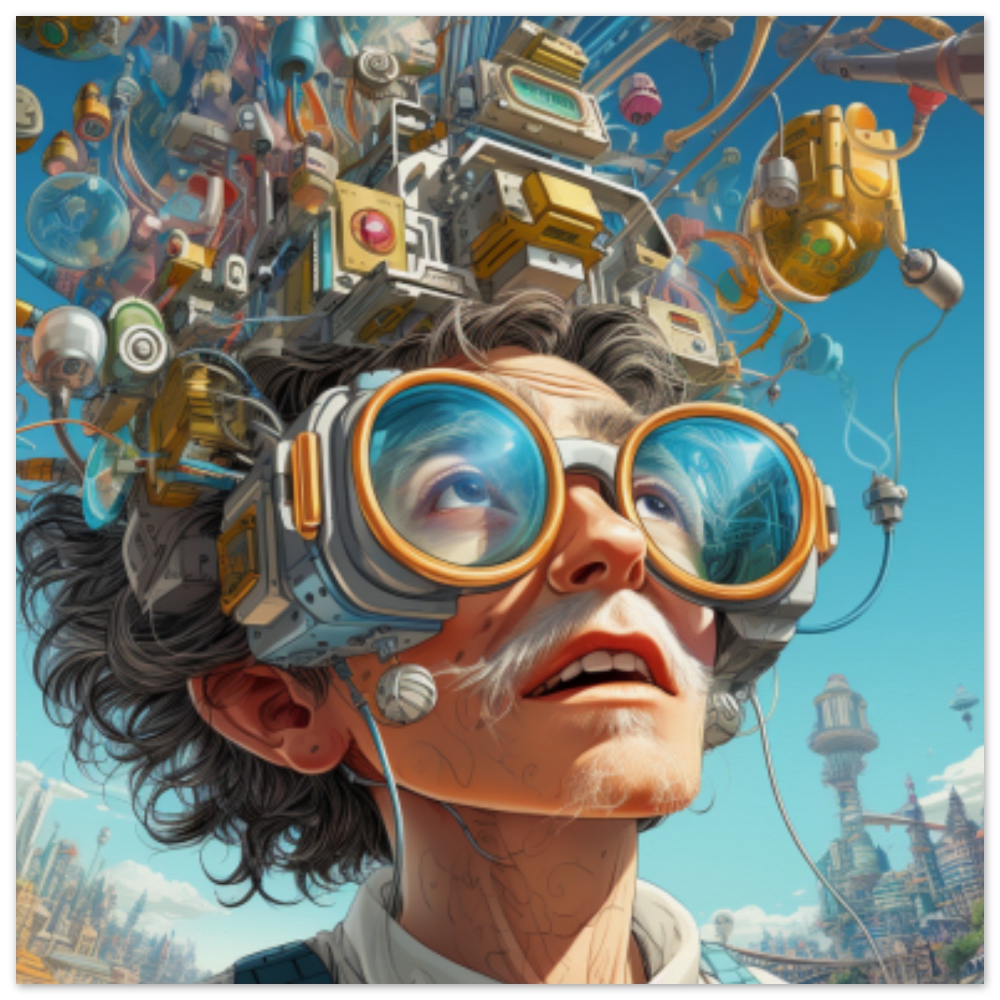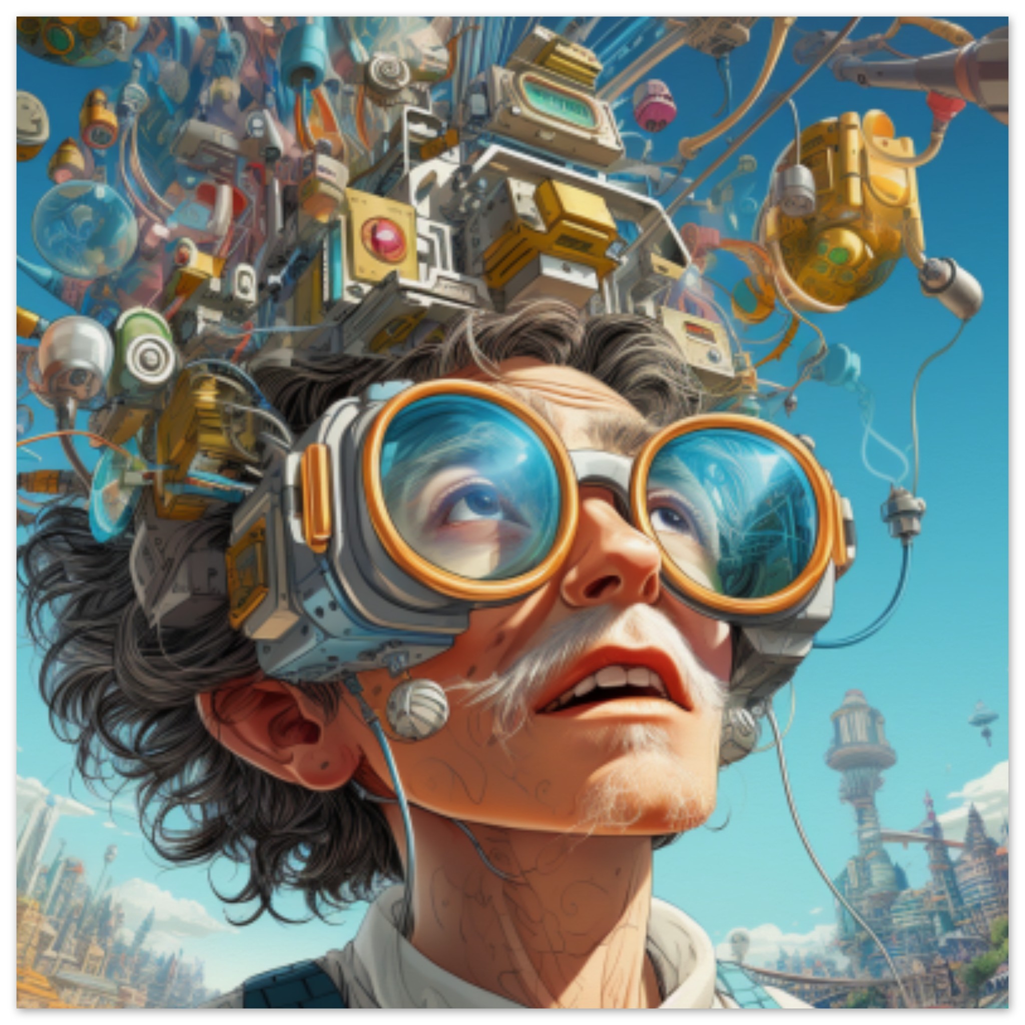 A man with glasses and wires attached to his head is depicted in the image. He has a serious expression on his face and is standing outdoors with a grey sky in the background. The dominant colors in the image are shades of grey. The man is wearing glasses, which are the dominant object in the image. There are no faces detected in the image. The image is not categorized as adult, racy, or gory content. The overall scene appears abstract and non-photographic in nature, with no celebrities or landmarks identified.