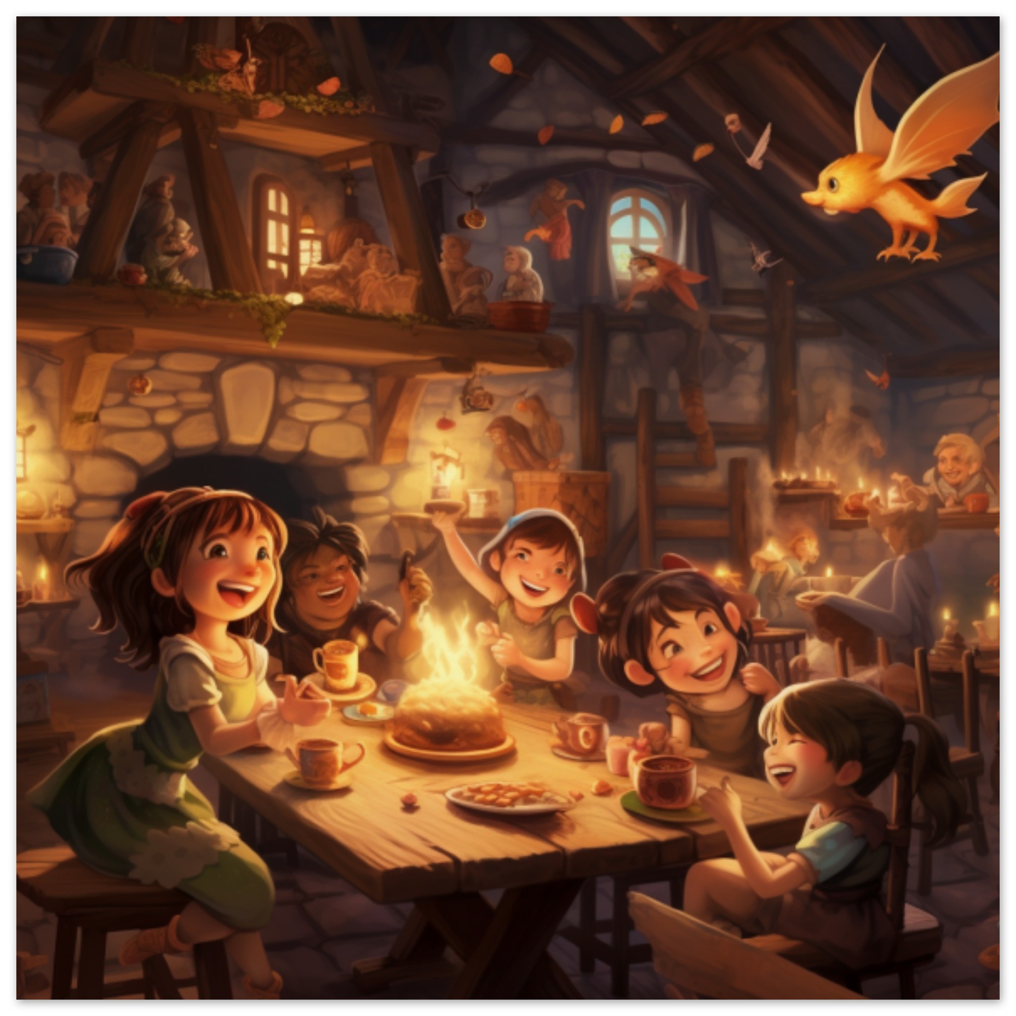 A colorful cartoon illustration depicting a group of children of various ethnicities sitting around a wooden dining table. The children are wearing casual clothing and appear to be engaged in conversation and laughter. A variety of food items are placed on the table, including a cake. In the background, there is a large candle burning on a nearby piece of furniture. The scene is warm and inviting, with a cozy atmosphere. The illustration is detailed, with expressive facial features and playful interactions among the children.
