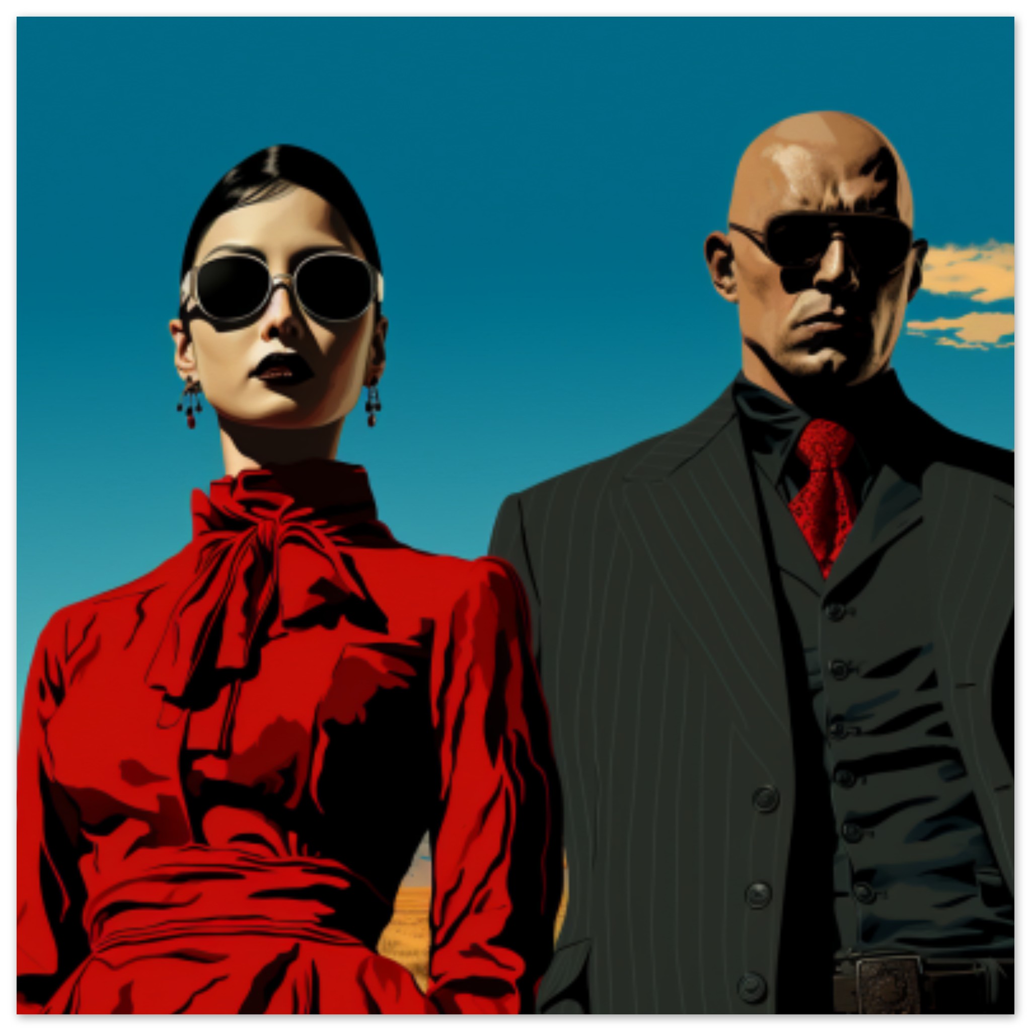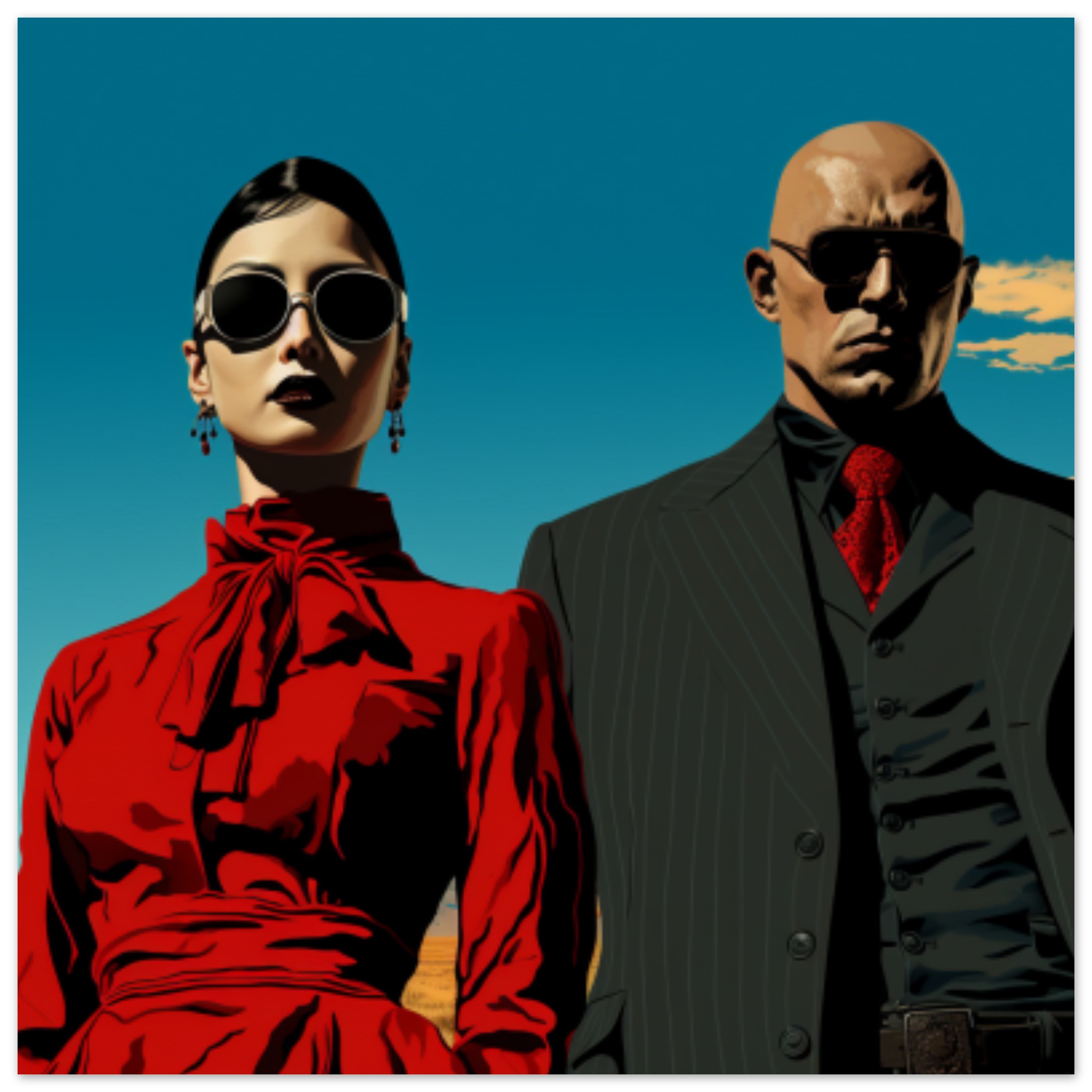 A man and woman are standing outdoors wearing sunglasses. The man is dressed in a suit and tie, while the woman is wearing a red shirt. The background shows a clear teal sky with fluffy clouds. The dominant colors in the image are black, teal, and red. Both individuals have their faces visible, and the man is wearing goggles over his sunglasses. The scene gives off a hiking or outdoor adventure vibe, possibly in a desert or mountainous area. The image is vibrant and colorful, with a modern and stylish feel.