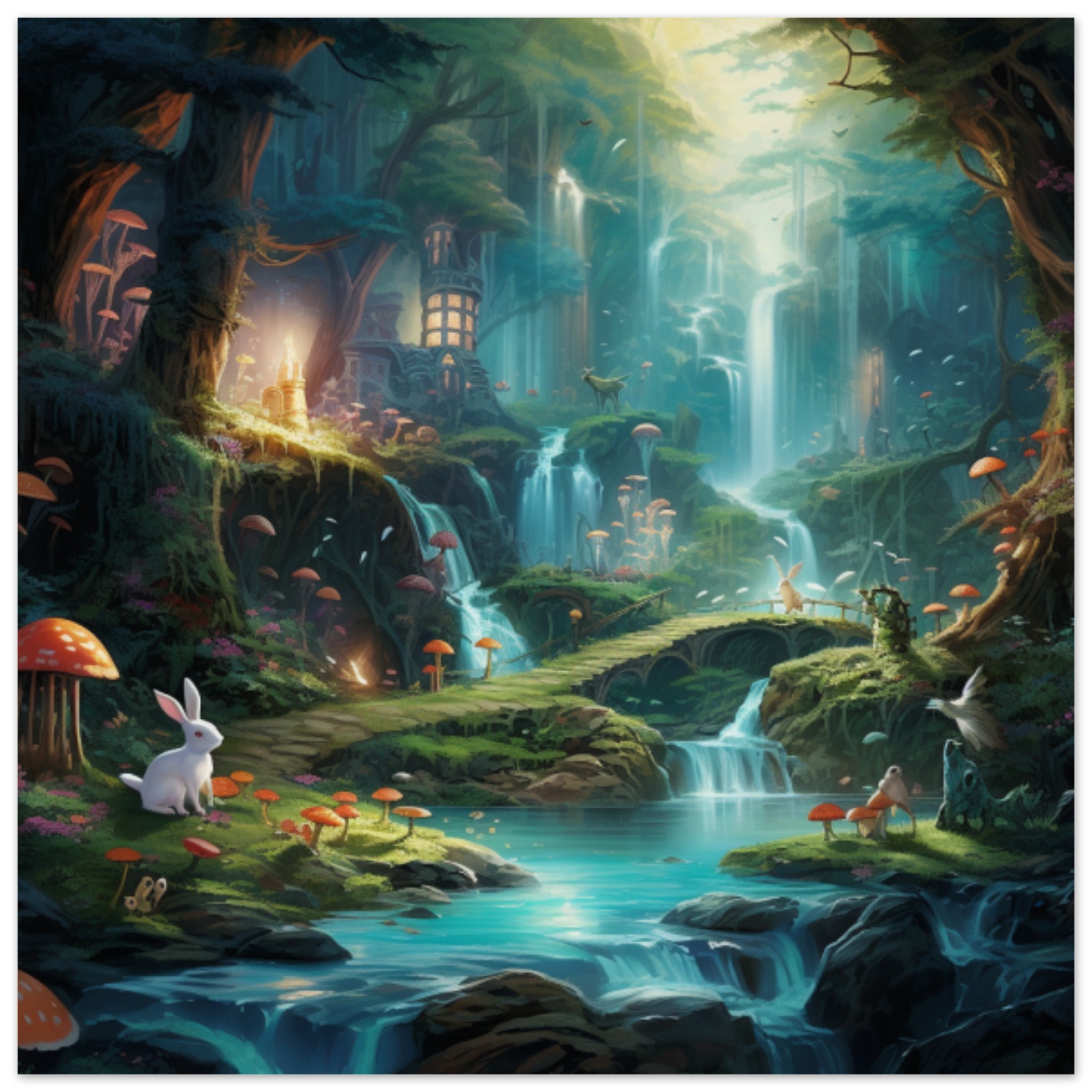 A stunning painting depicting a serene forest scene with a majestic waterfall cascading down into a crystal-clear stream. The lush greenery of the forest surrounds the waterfall, creating a tranquil and picturesque setting. The artwork captures the beauty of nature with intricate details, showcasing the play of light and shadow on the water’s surface. The overall color scheme is dominated by shades of black, with a subtle accent color of 264D5C adding depth to the composition. This artwork evokes a sense of peace and harmony, inviting the viewer to immerse themselves in the beauty of the natural world.