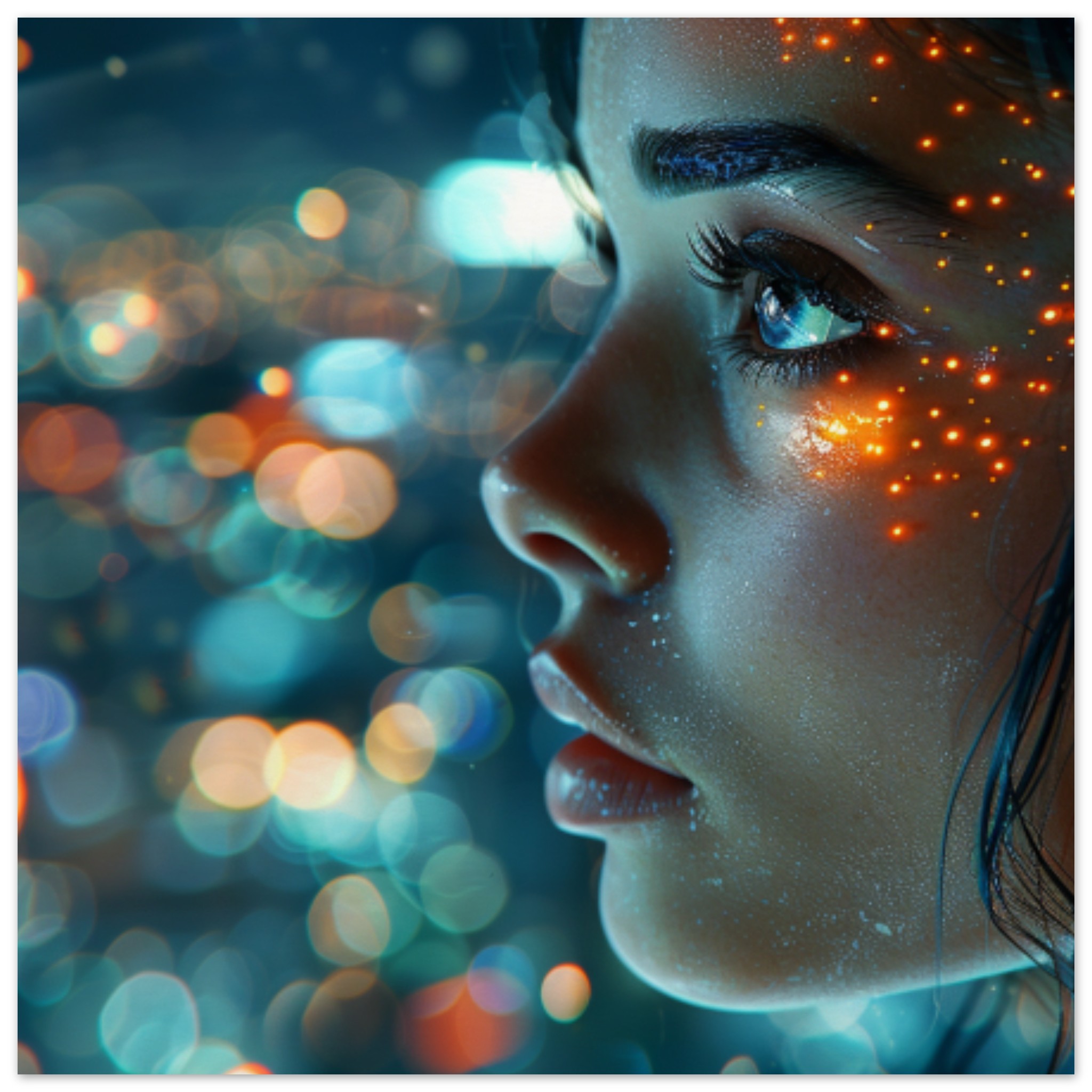A close up image of a woman looking away from the camera. Her face, with features like lips and eyelashes, is illuminated by light, creating a striking portrait. The dominant colors in the image are grey and black, with an accent color of A96C22. The woman’s expression is thoughtful and serene, giving off a sense of mystery. The photo appears to be taken at night, adding to the atmospheric quality. This high-quality image captures the beauty and elegance of a fashionable woman in a moment of introspection.
