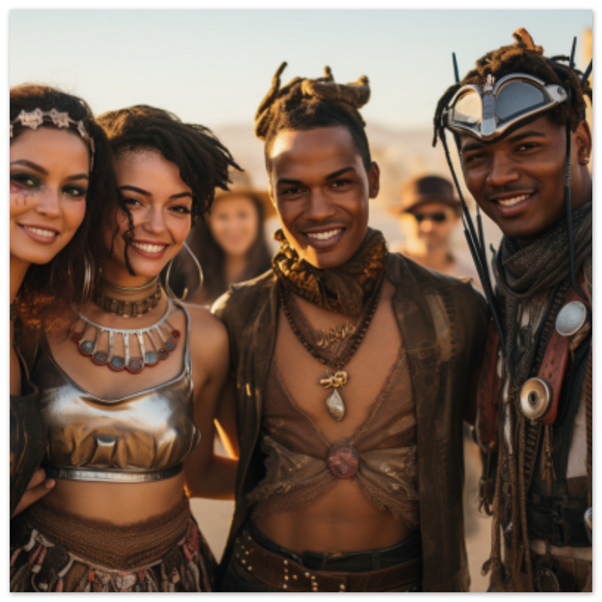 A group of four people, two men and two women, are posing for a photo outdoors. The individuals are wearing a variety of clothing, including hats and jewelry. The dominant colors in the image are brown, black, and white. The background is also brown. The people have smiling faces and are looking at the camera. The image is not in black and white. The individuals are standing close together, with one man in the foreground and the others slightly behind him. The overall scene is cheerful and lively, capturing a moment of togetherness.