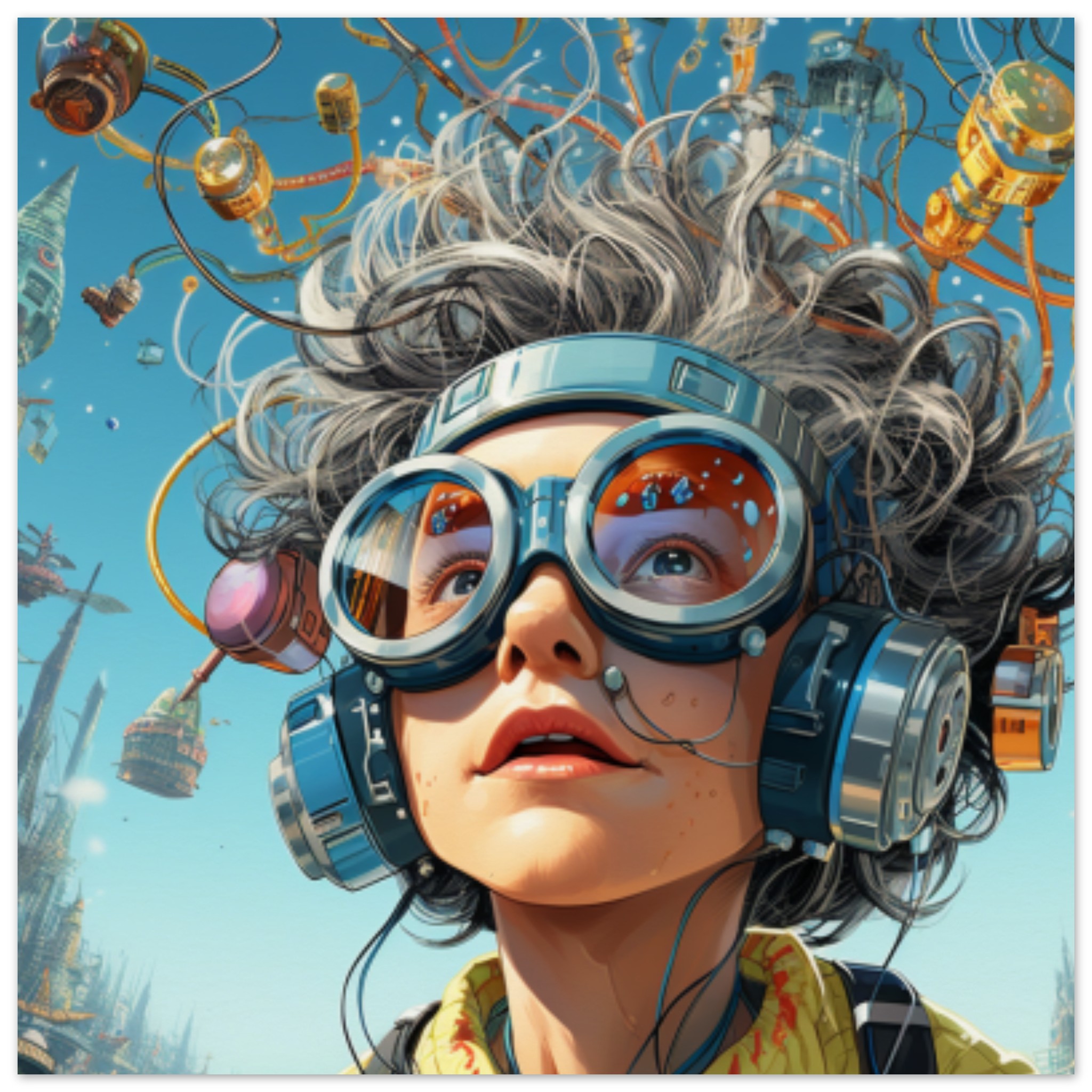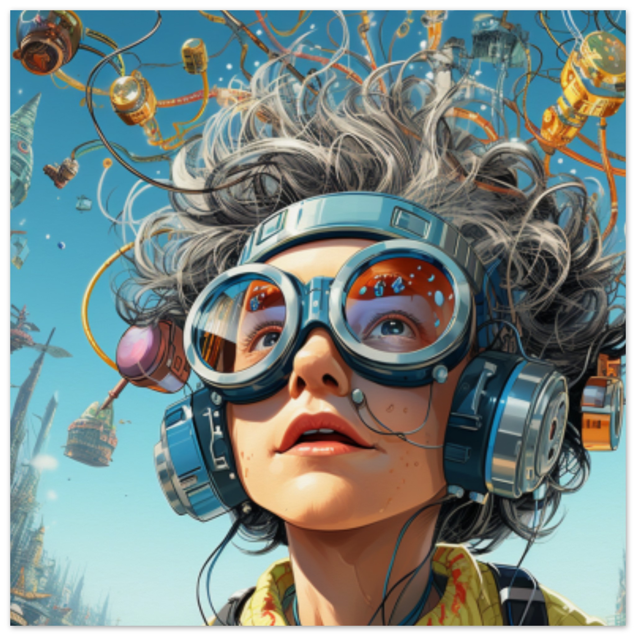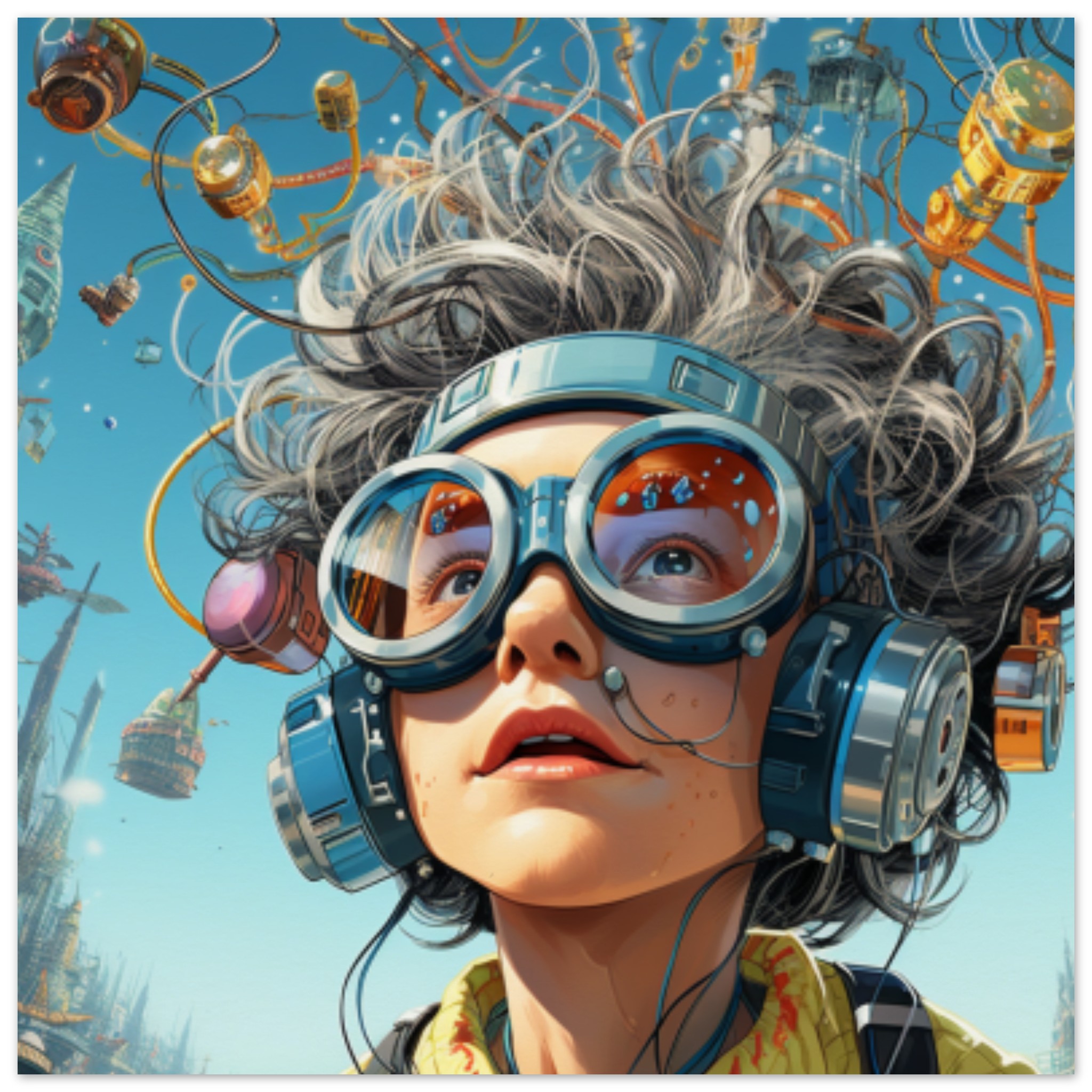A woman is depicted in this image wearing grey goggles and headphones. She is outdoors, with a grey sky in the background. The dominant colors are grey, with an accent color of 337B98. The image does not contain adult, racy, or gory content. Additionally, a pair of glasses is identified in the image. The tags associated with the image include human face, sky, goggles, outdoor, mask, person, carnival, sunglasses, and art. The image falls under the categories of abstract nonphoto and others_. No celebrities or landmarks are recognized in the image.