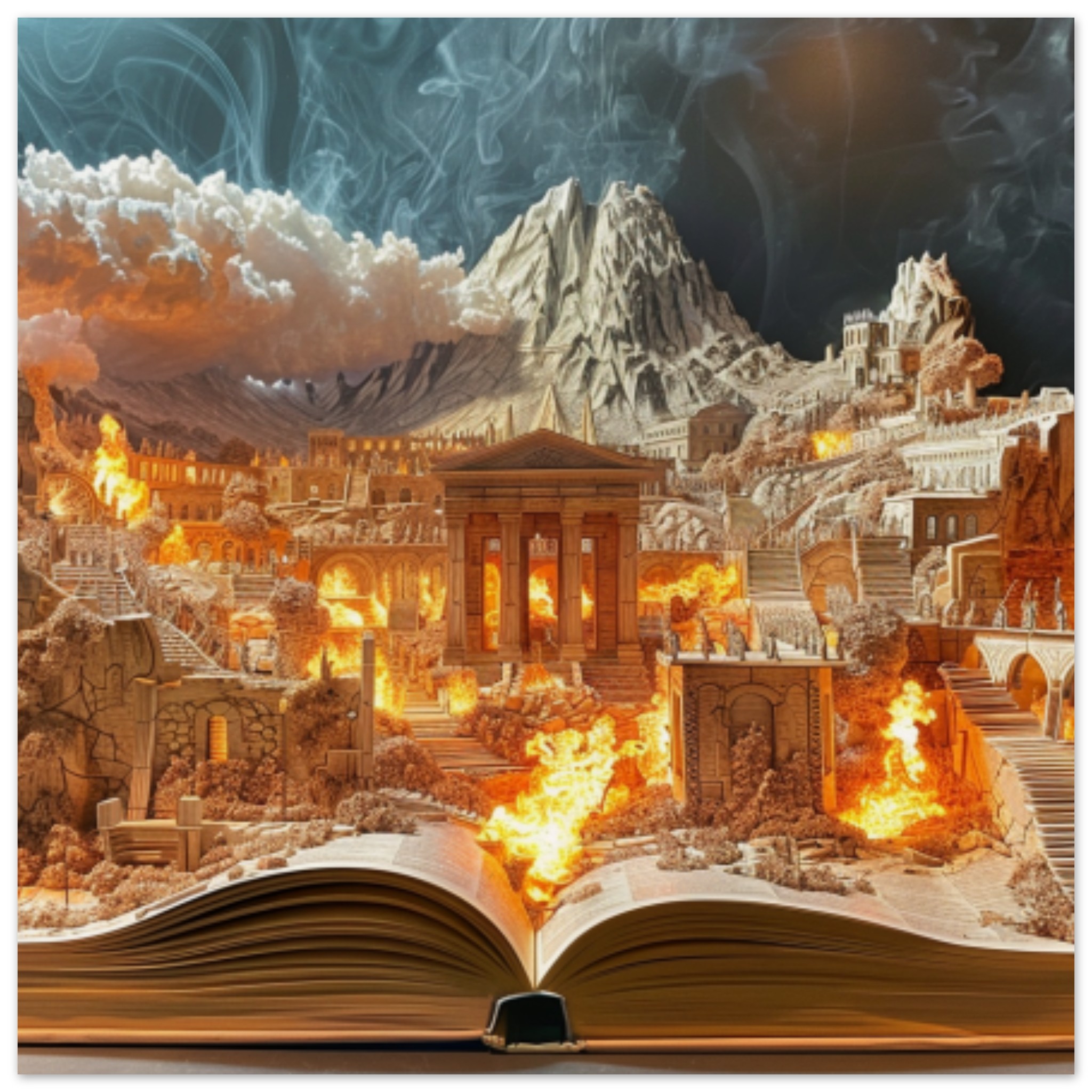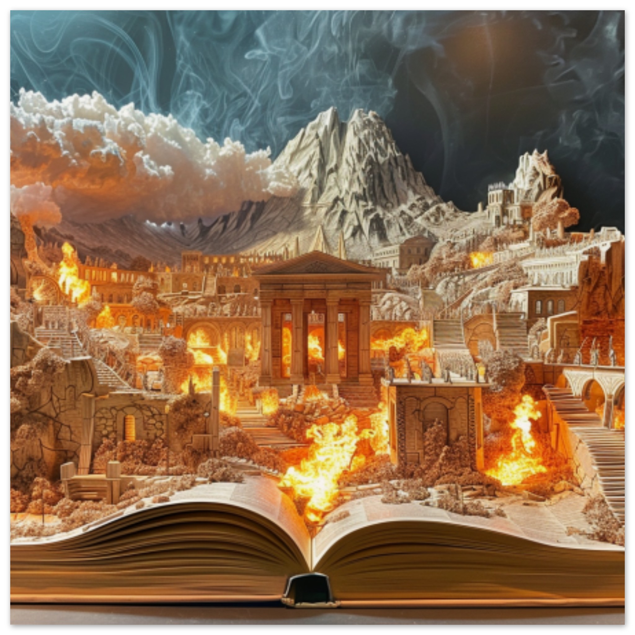 A screenshot of a painting depicting an open book with a burning city. The artwork captures a scene of destruction and chaos, with flames engulfing skyscrapers and billowing smoke filling the sky. The dominant colors of brown add a somber and ominous tone to the image, while the accent color of BA4A11 brings a sense of intensity to the fiery scene. This powerful piece of art evokes emotions of fear and despair, highlighting the devastation of urban life. The composition is both captivating and haunting, drawing the viewer into a world of disaster and turmoil.