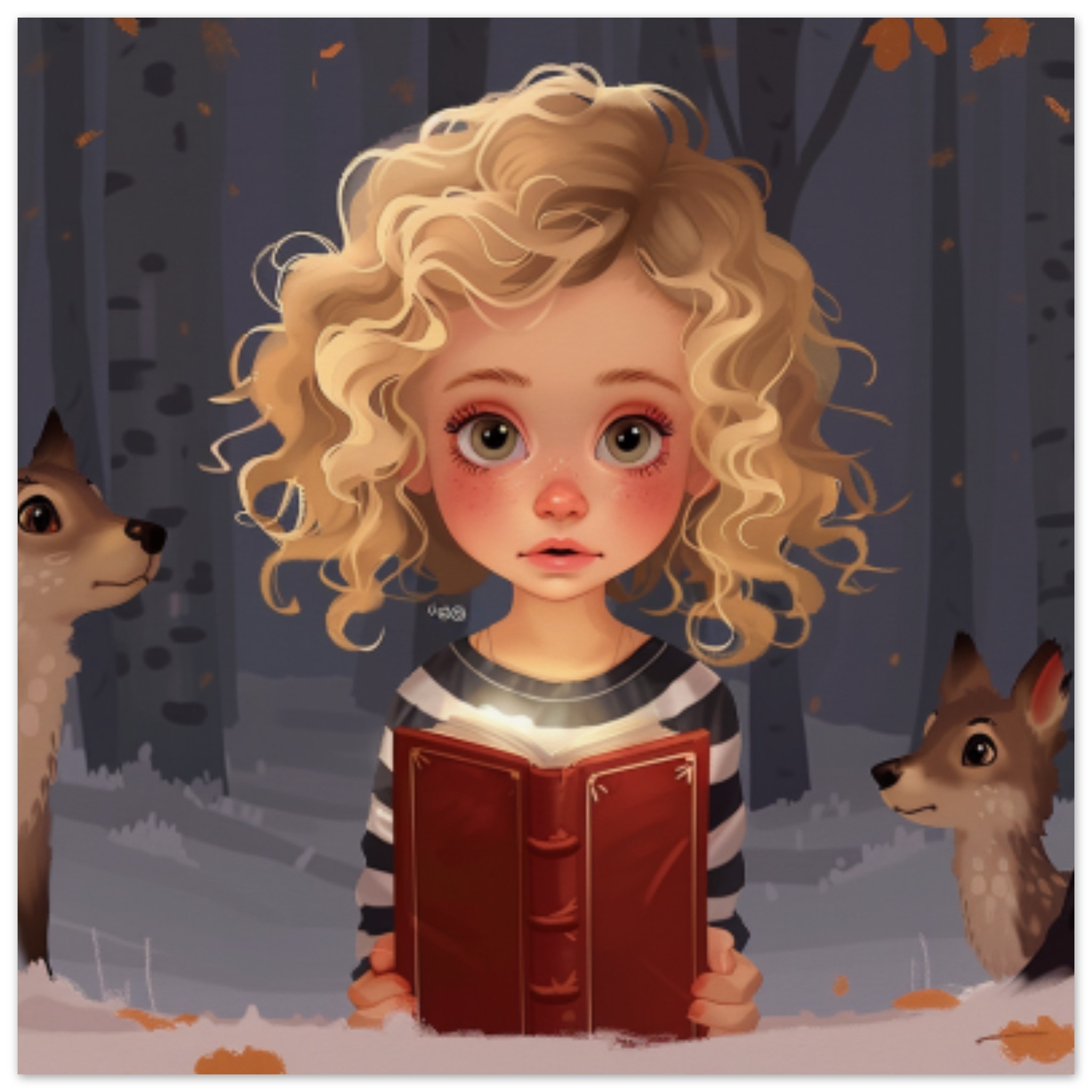 A cartoon of a girl reading a book in the woods during winter. The scene includes a brown squirrel peeking out from behind a tree, adding a whimsical touch to the snowy landscape. The girl is engrossed in her book, with a red book cover featuring white clouds visible. In the background, a black and brown mammal, possibly a deer, is also present. The color palette consists of warm browns and blacks, with an accent color of A66625. The image is vibrant and playful, capturing a serene moment in nature.