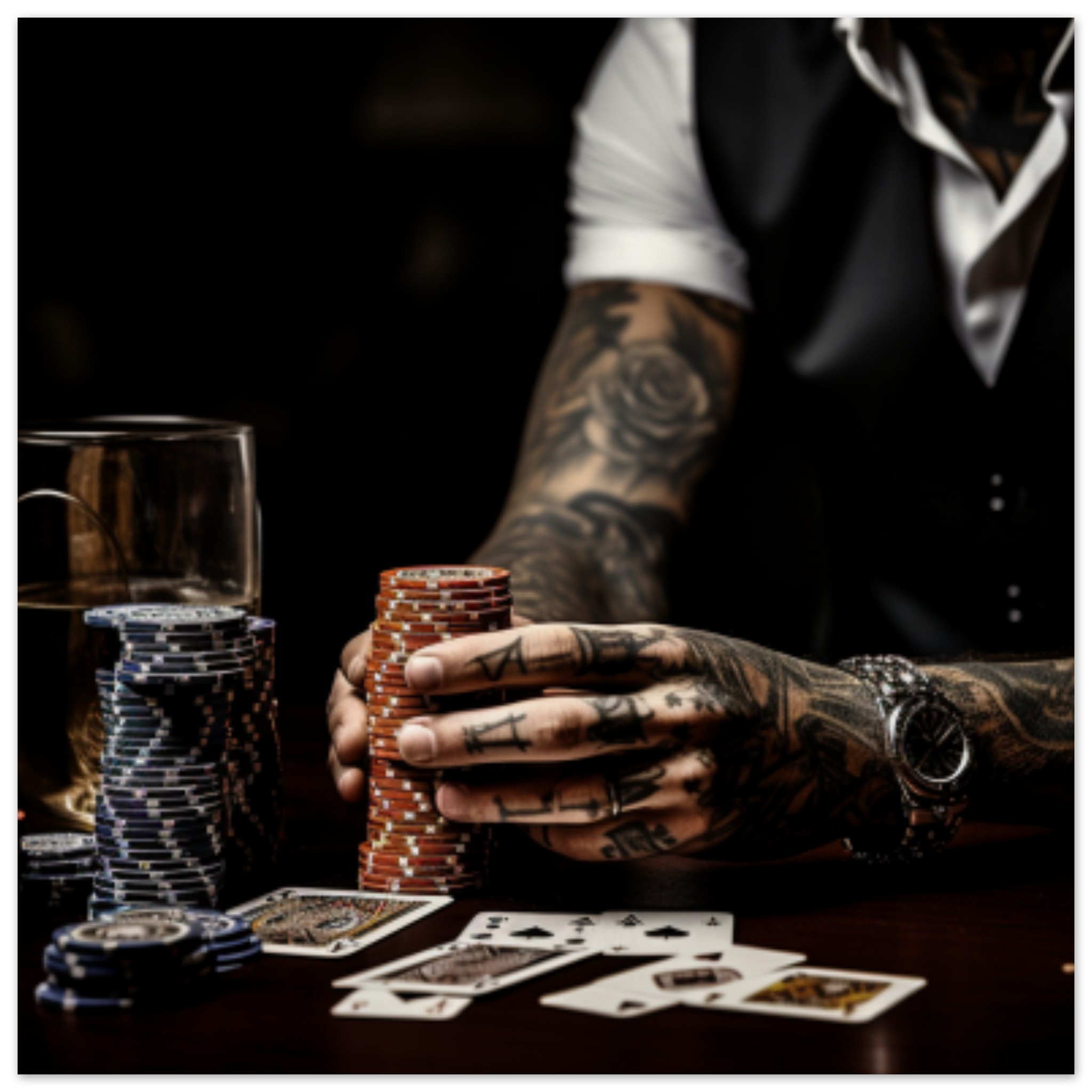 A person with tattoos on their hands is sitting at a table, surrounded by stacks of poker chips. The individual is focused on the game, their hands adorned with intricate tattoos. The atmosphere is intense as they strategize their next move. The background is dark, emphasizing the colorful chips and the person’s hands. The image captures the essence of a high-stakes poker game, with the player fully immersed in the competition. The scene exudes a sense of concentration, skill, and determination in the world of gambling.