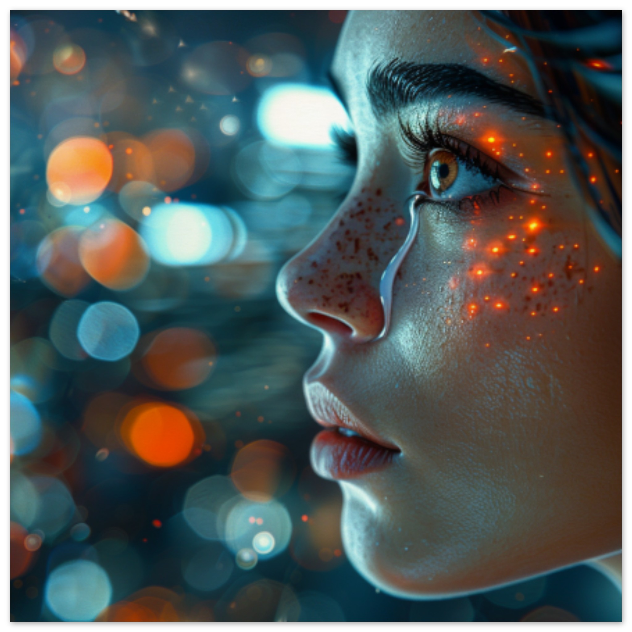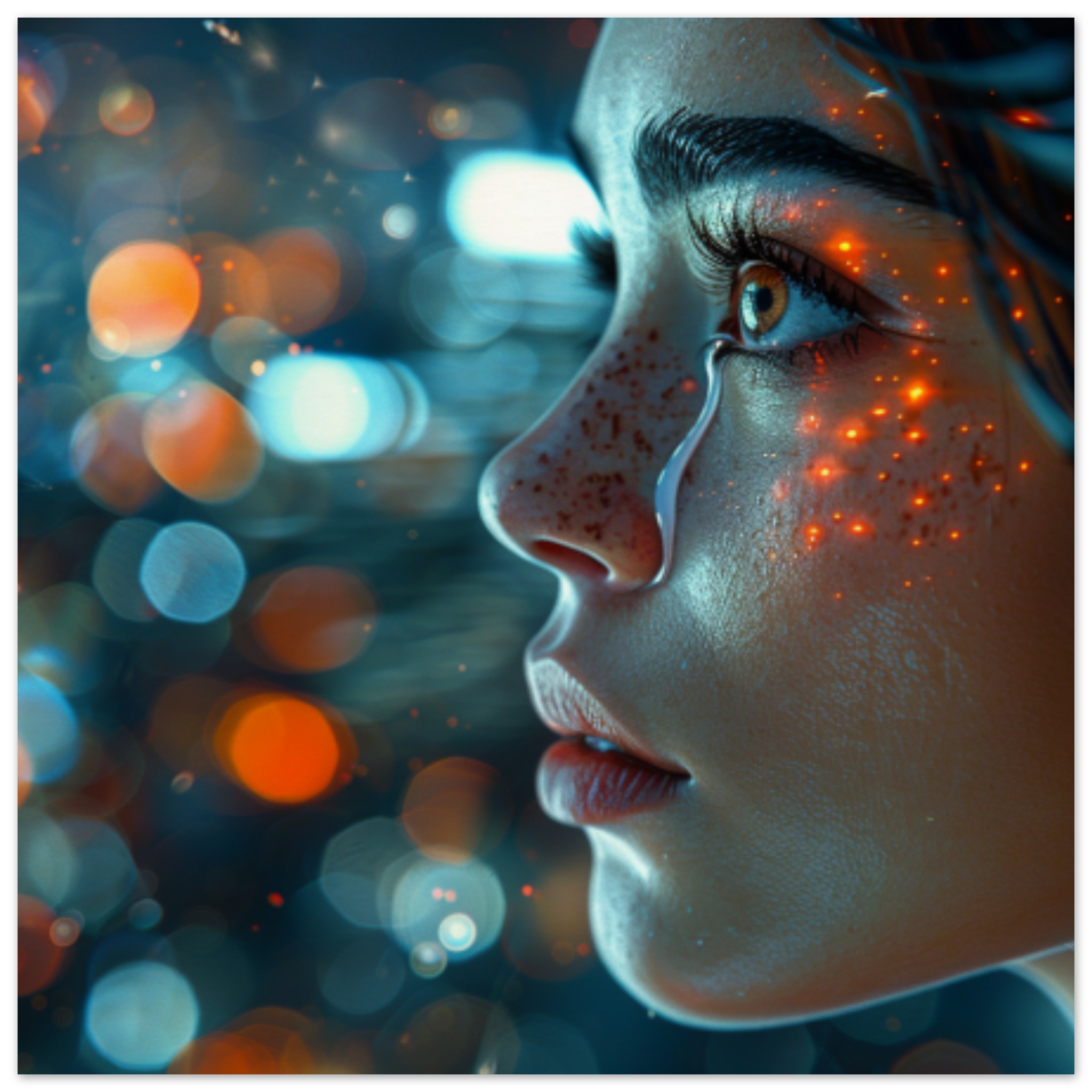 A woman with a tear in her eyes is shown in this image. She has a sorrowful expression on her face, with her eyes glistening with tears. The woman’s face is the main focus of the photo, showing her eyelashes and lips in detail. The background is dark, accentuating her emotions. The dominant colors in the image are black, brown, and grey. The woman’s face is highlighted by a warm accent color. There is an animal in the background of the image, but it is not the main subject. The overall mood of the image is somber and emotional.