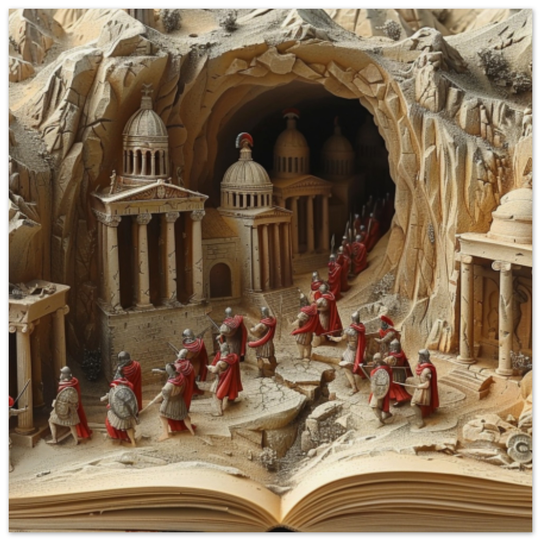 A brown book featuring a detailed sculpture of a cave with people inside. The intricate carving depicts individuals gathered in the cave, with various figures and elements visible. The scene evokes a sense of mystery and intrigue, inviting viewers to explore the depths of the cave through the pages of the book. The dominant color scheme of brown adds to the earthy, ancient feel of the sculpture. This unique art piece combines elements of history, culture, and storytelling, making it a captivating addition to any collection.