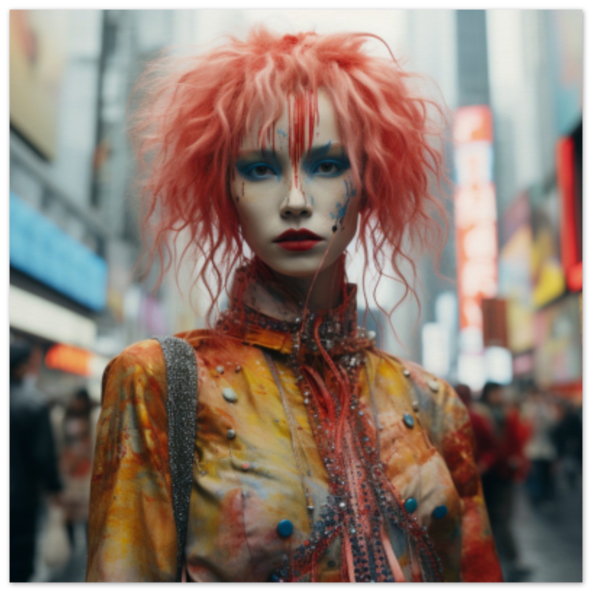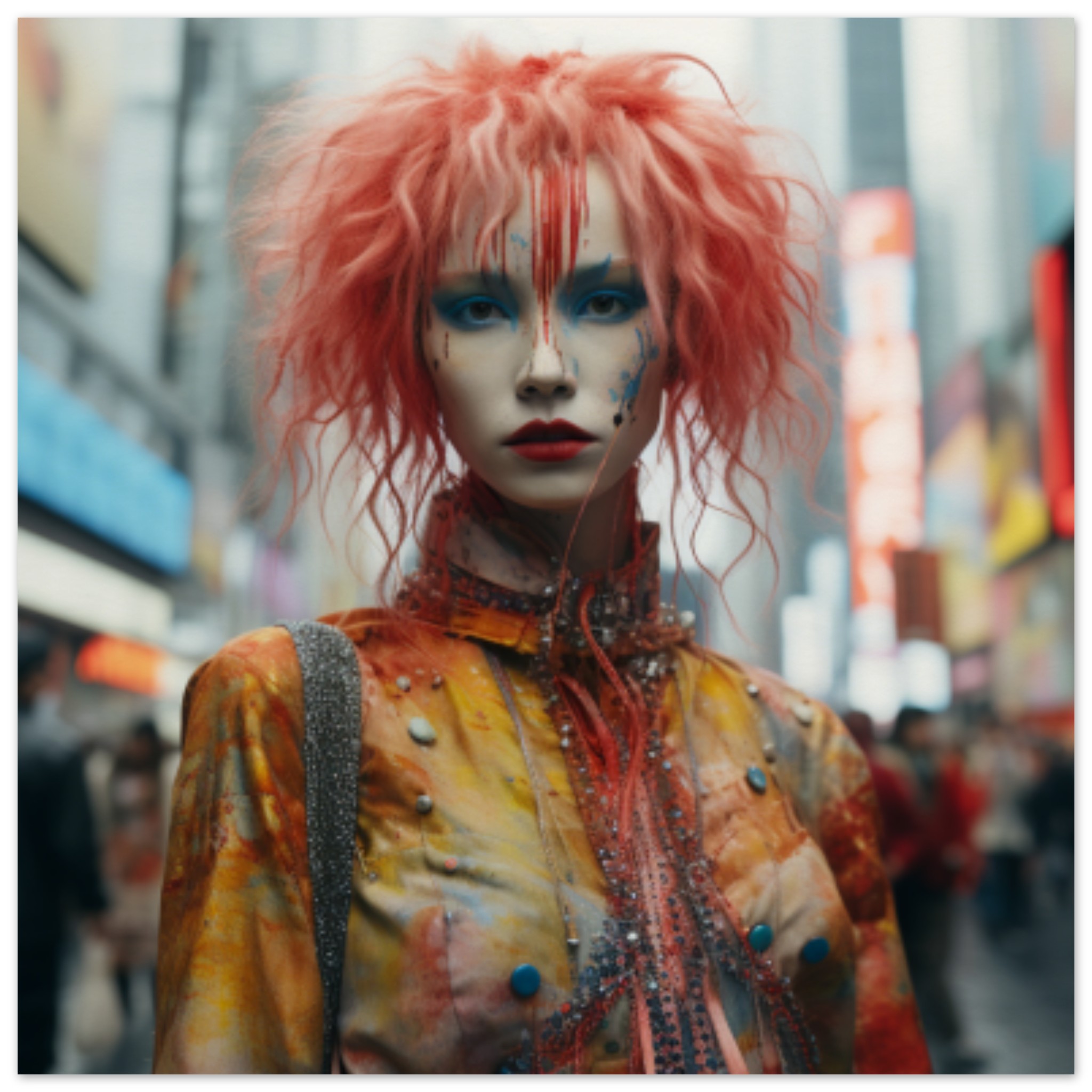 A woman with pink hair and makeup is standing outdoors. She is wearing a goth subculture costume, with dark clothing and dramatic makeup. The dominant colors in the image are black and grey, with an accent color of teal. The woman’s face is the main focus, showing her blue eyes and pink hair. There are two people in the image, one walking in the background and the other standing closer to the camera. The overall vibe of the image is edgy and alternative, perfect for a Halloween costume or a street style look.