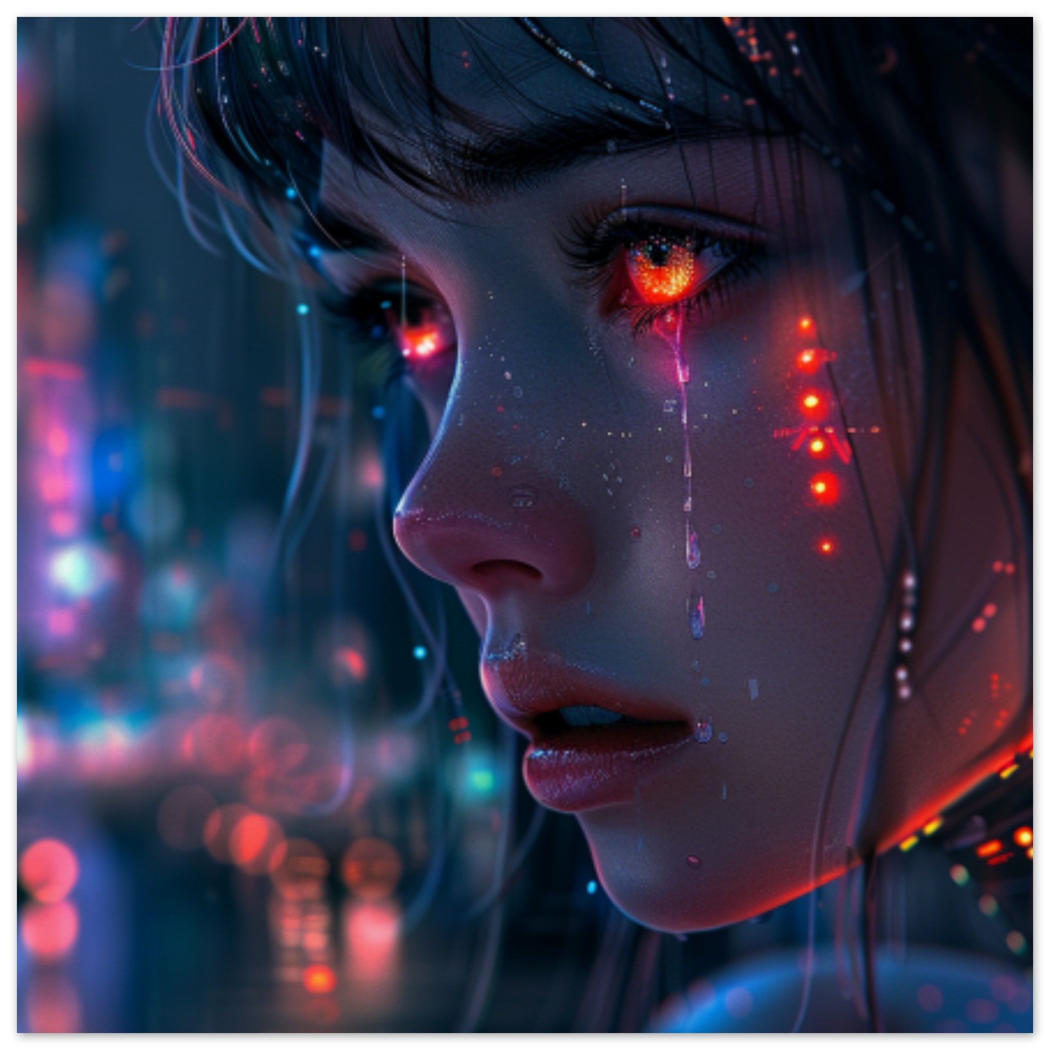 A woman with red eyes is shown crying in this image. Her eyes are a striking shade of red, reflecting the intense emotions she is experiencing. The background is dark, emphasizing the woman’s emotional state. The dominant colors in the image are black and blue, creating a somber and melancholic atmosphere. The woman’s face and lips are prominently featured, showcasing her distress. The image focuses on the woman’s expression, capturing the raw emotion of her tears. This powerful portrait conveys a sense of sadness and vulnerability, eliciting empathy from the viewer.