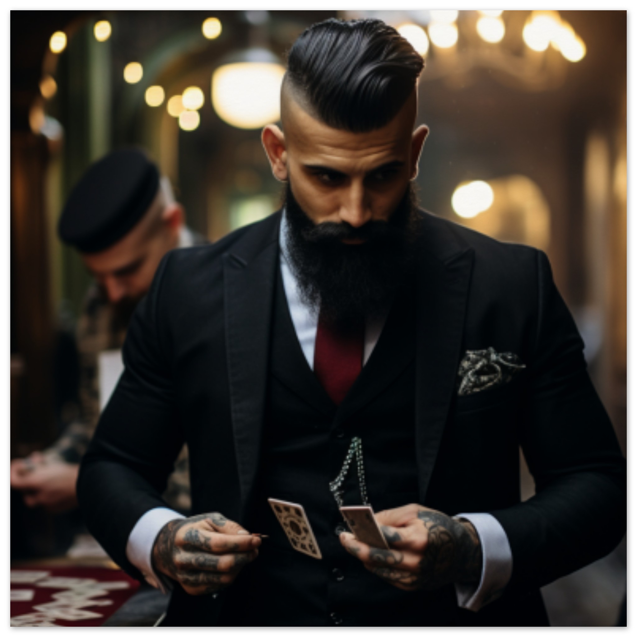A well-dressed man in a black suit is standing indoors, holding a deck of cards in his hand. He has a serious expression on his face and is wearing a stylish black hat. The image is dominated by black and brown colors, with an accent color of A97922. The man’s face is partially obscured, adding a mysterious element to the scene. Various objects such as headwear and other people are also present in the image. Overall, it portrays a sense of sophistication and intrigue, making it a captivating visual.