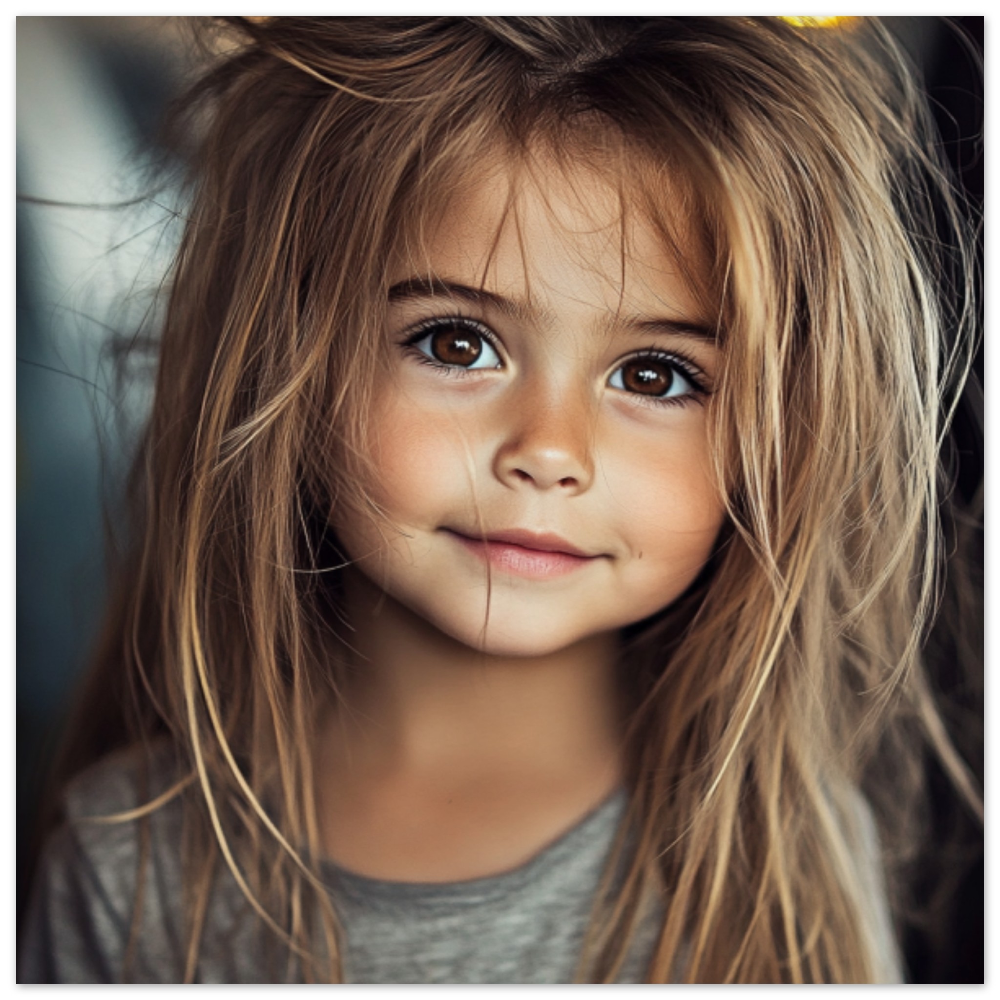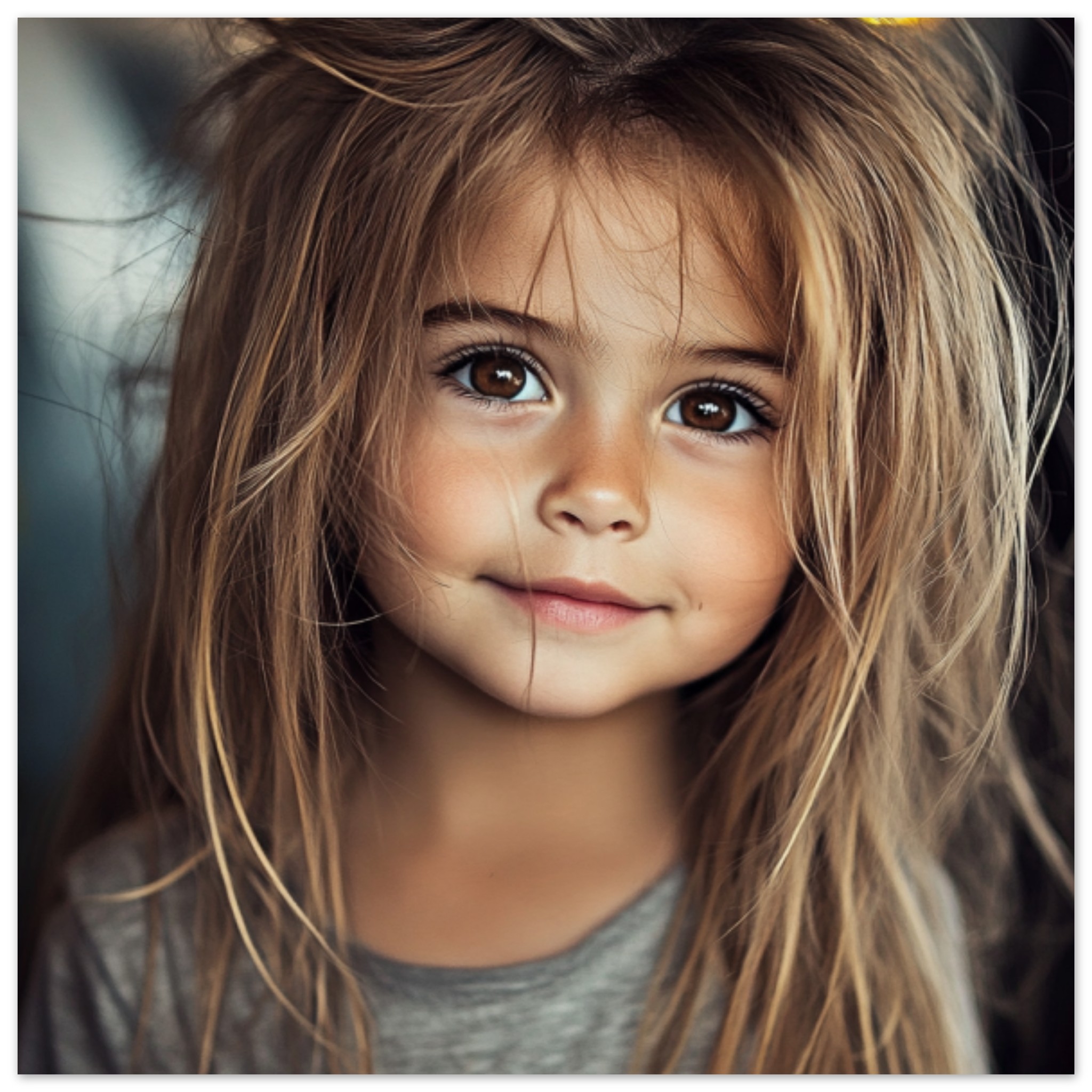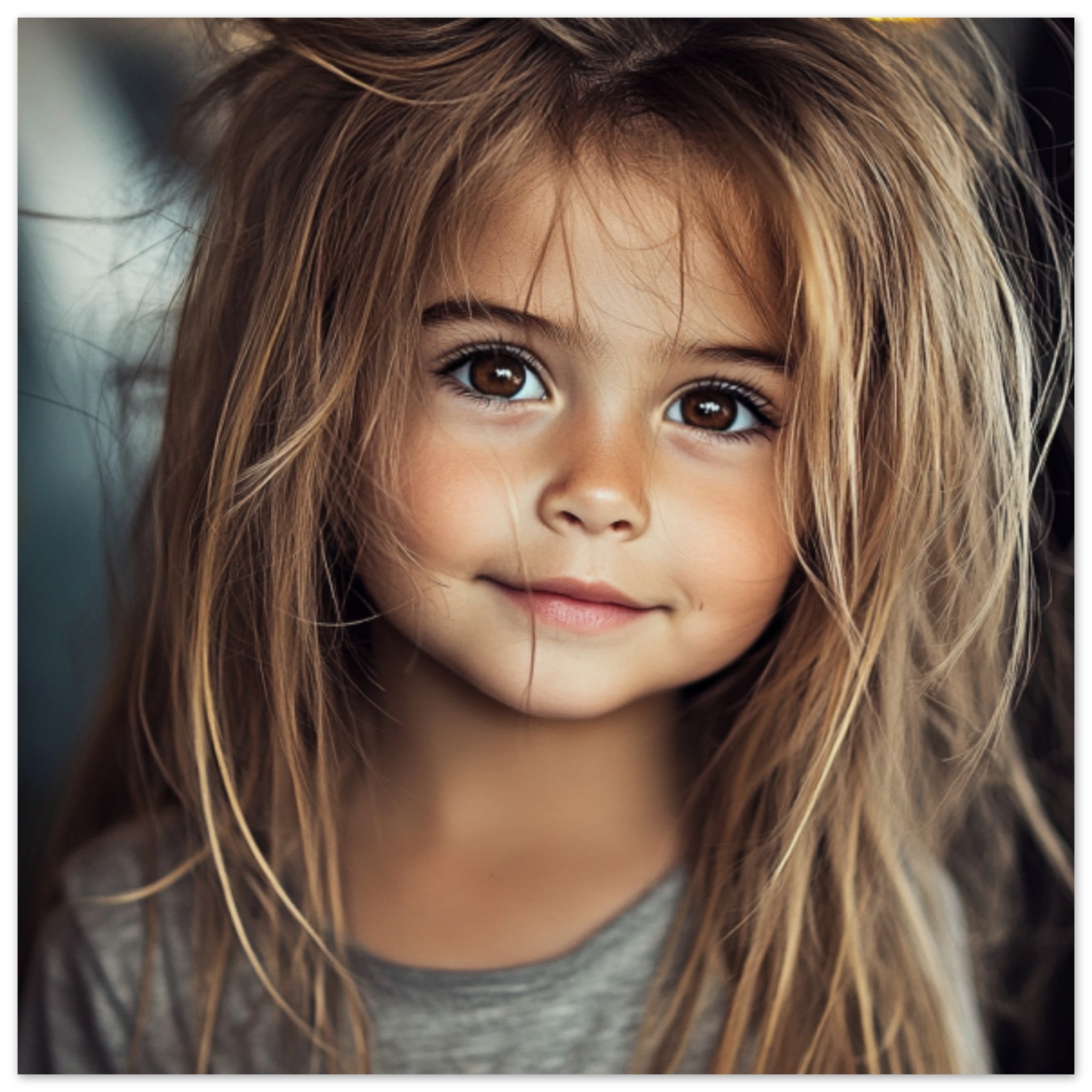 A portrait of a young girl with brown hair, styled in bangs, showcasing her lovely skin and expressive features. The girl, possibly a child model, has a toddler-like appearance with a sweet smile. Her prominent human face, highlighted by her lips, cheek, and eyebrows, is the focus of the image against a neutral grey background. The photograph is a close-up shot capturing the girl’s beauty and innocence, making it a perfect example of portrait photography. The dominant colors in the image are brown, grey, and black, with a subtle accent color of 847647 adding depth to the composition.