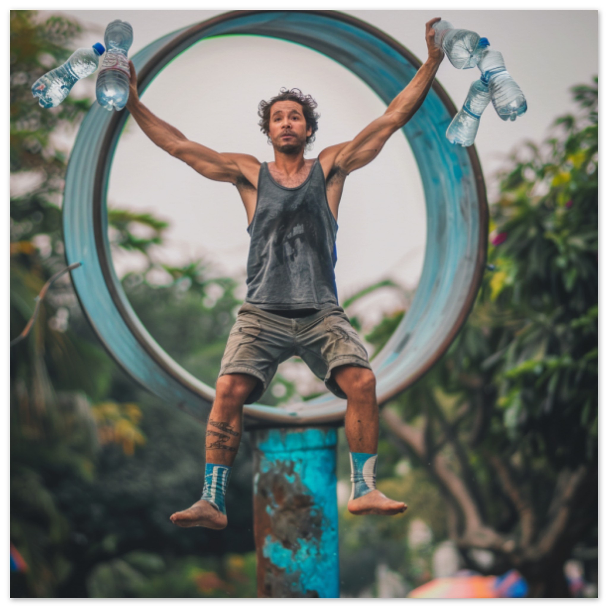 A man wearing grey clothing and black footwear is captured mid-jump in the air, holding water bottles in both hands. The background is a mix of black and white tones, with a dominant color palette of grey, white, and black. The man is outdoors, possibly in a playground with trees in the background. In the foreground, the man’s face is partially visible, with a slight smile as he leaps. The image conveys a sense of movement and energy, with a focus on outdoor activities and staying hydrated.