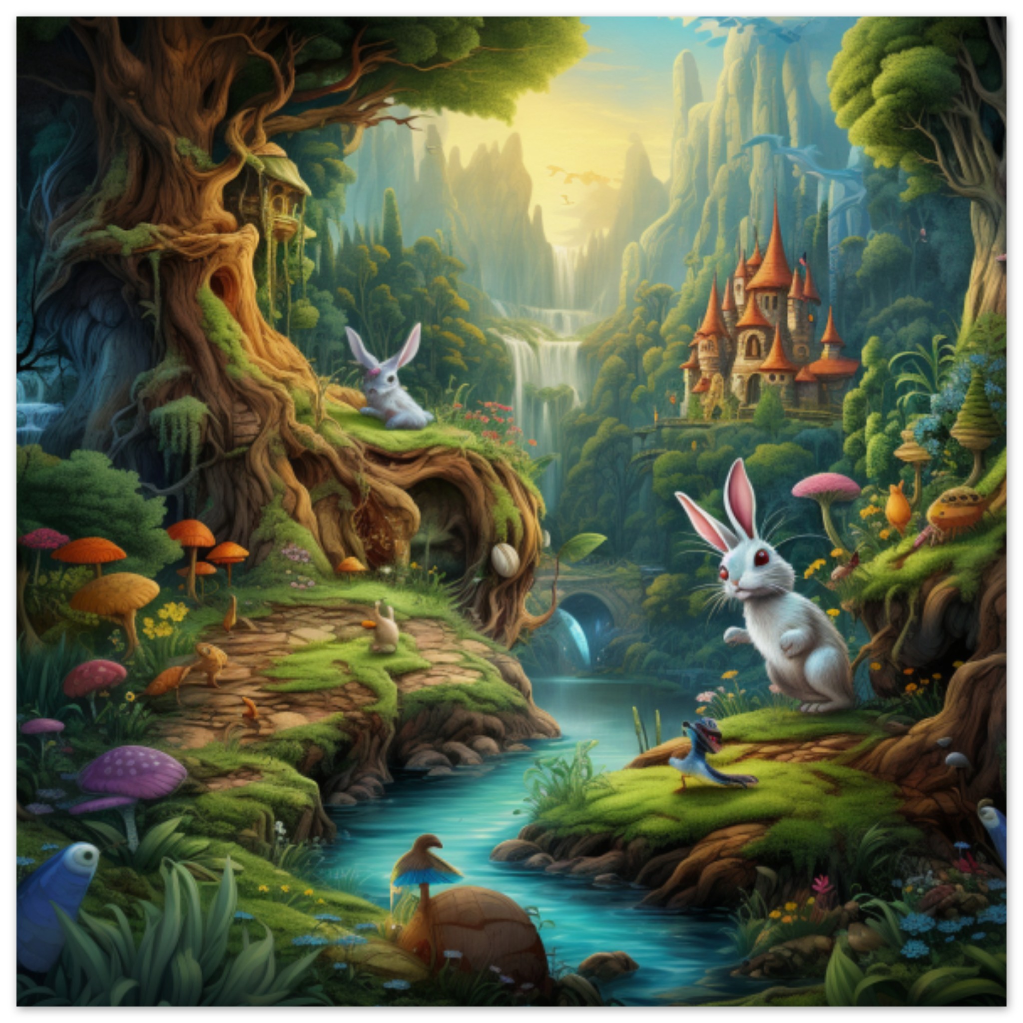 A detailed cartoon illustration of a forest scene featuring a river winding through the lush greenery and a majestic castle in the background. The dominant colors are brown and black, with an accent color of dark orange. The image is not in black and white and does not contain any adult, racy, or gory content. Tags include “reef,” “painting,” and “art.” An animal, specifically a white rabbit with red eyes, is present in the image. The overall scene gives off a whimsical and enchanting vibe, perfect for a fairy tale setting.