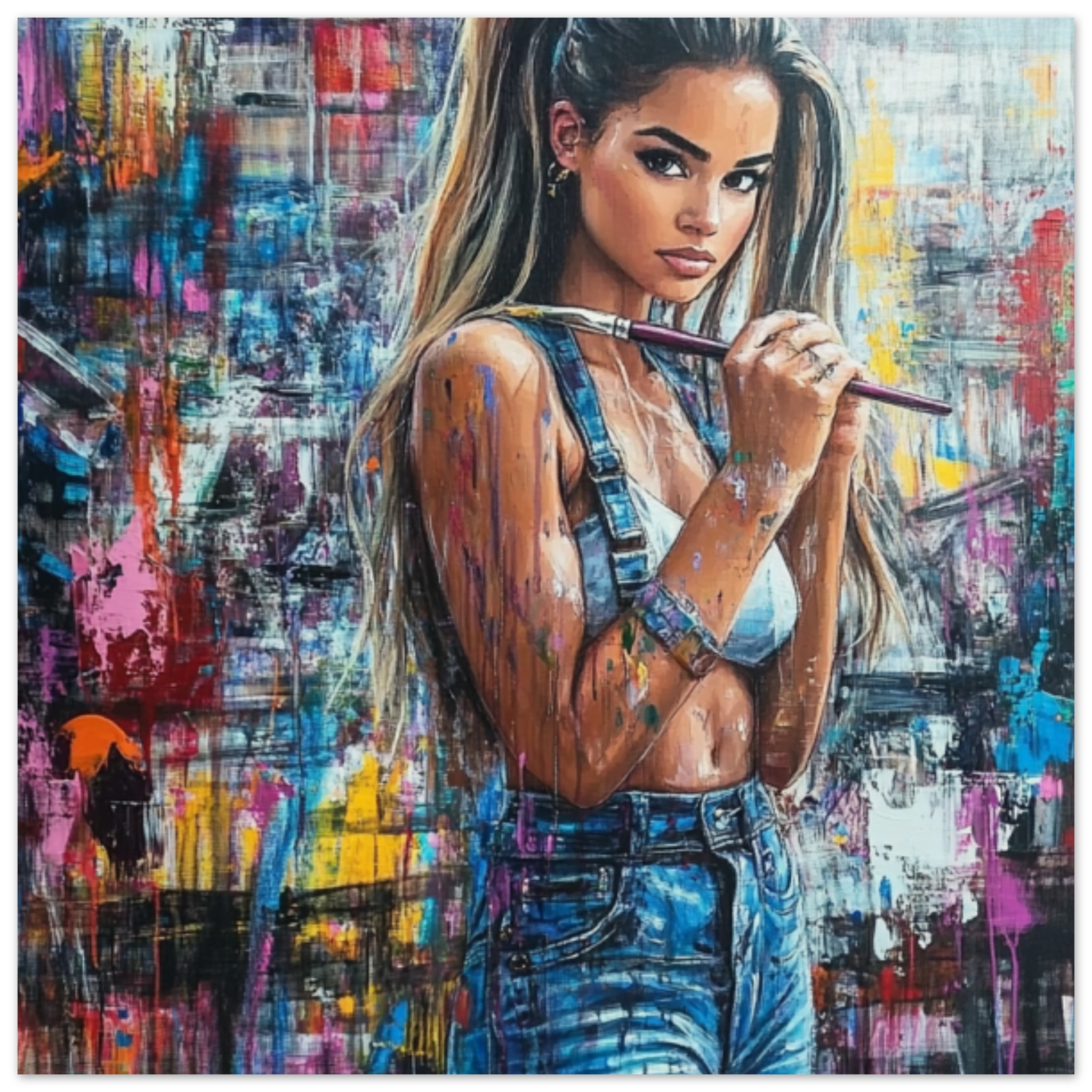 A detailed painting depicting a woman holding a paintbrush, with a focus on her face and clothing. The woman is wearing jeans and is deeply engrossed in her artistic creation. The dominant colors in the painting are grey and black, with an accent color of 237BA8. The artwork showcases the woman’s passion for art and creativity. The image is not adult, racy, or gory. The painting captures the essence of a talented artist immersed in her work, creating a captivating and inspiring scene.