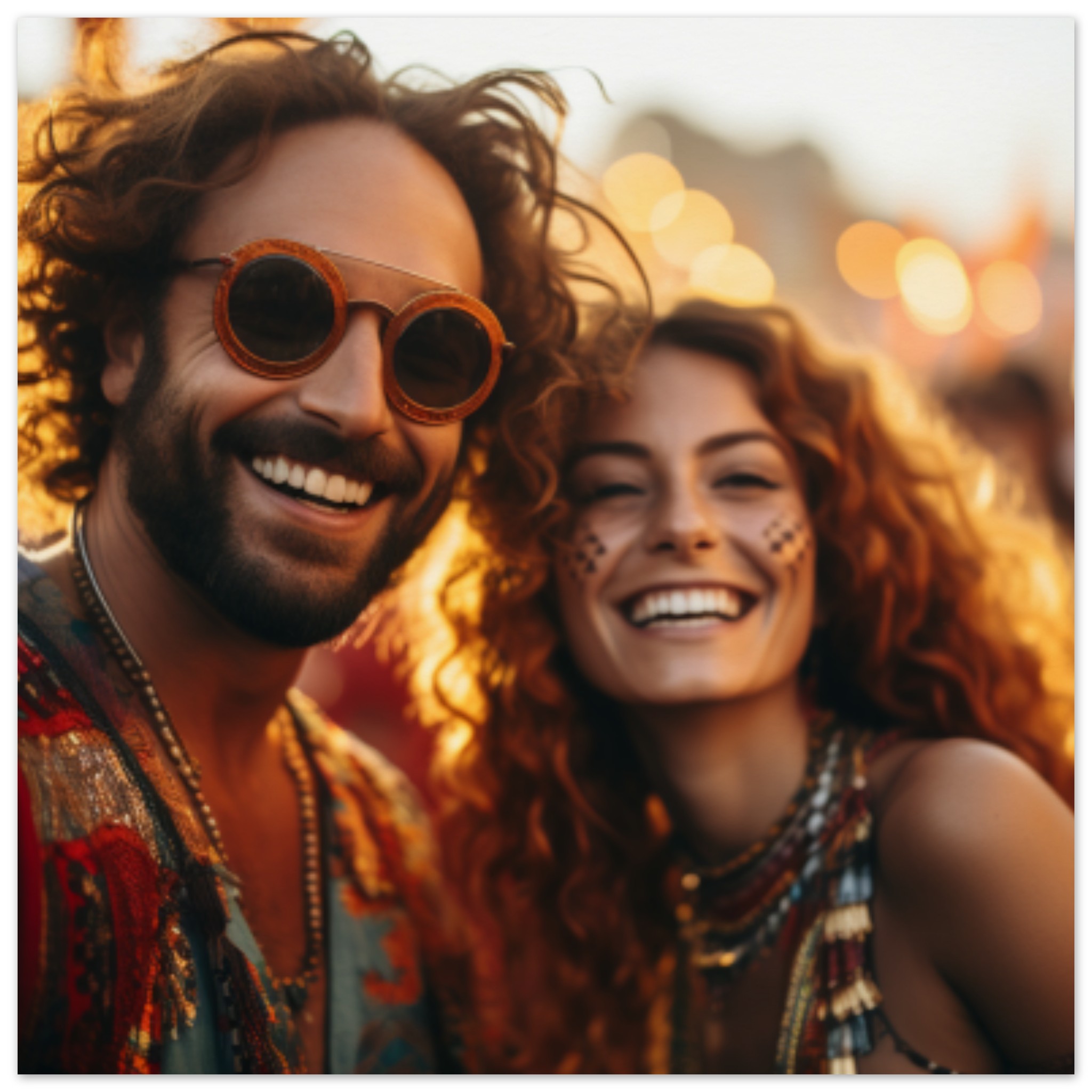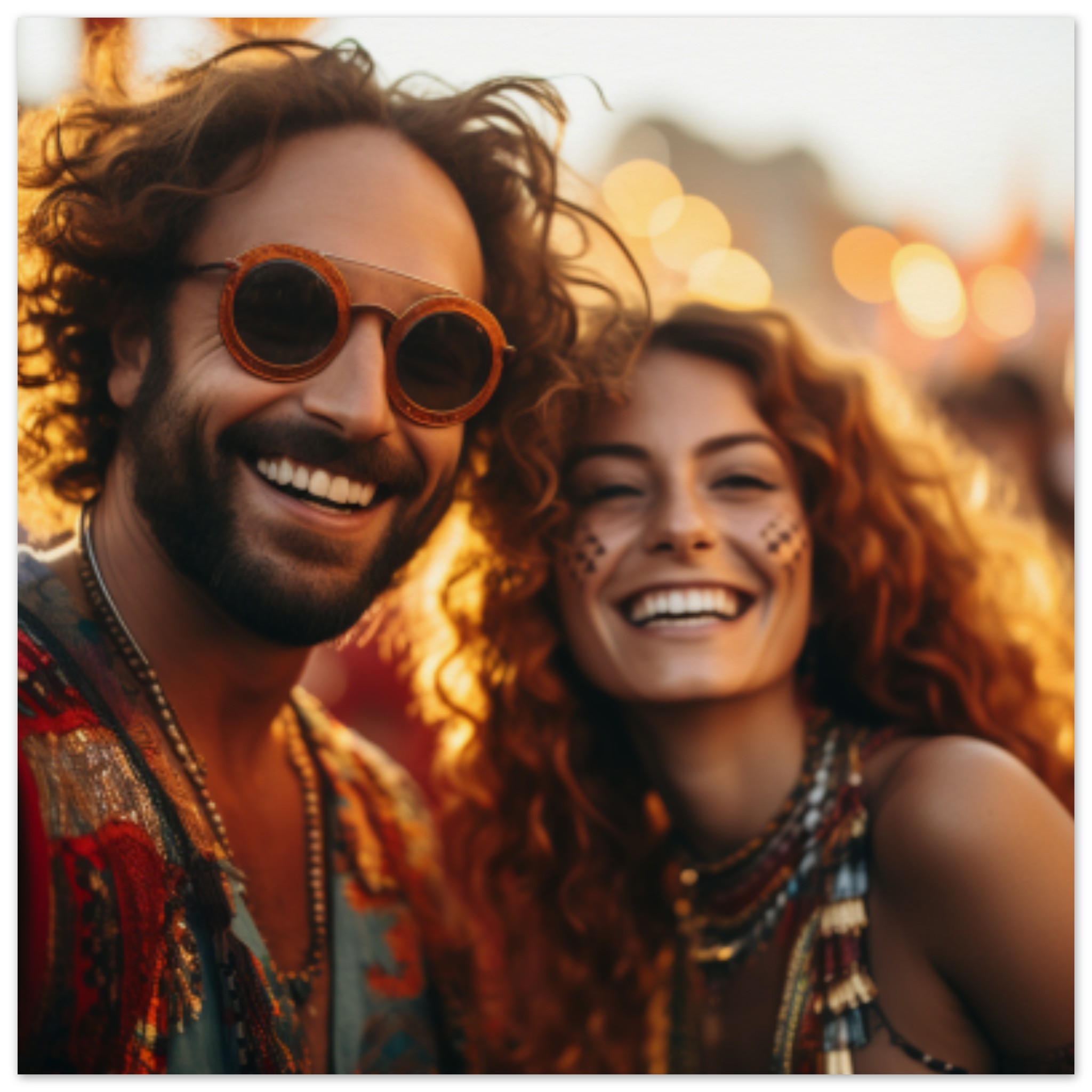 A man and woman are standing outdoors, smiling at the camera. The man, wearing brown sunglasses, has a stubble and is dressed in casual clothing. The woman, with red curly hair and tribal paint on her face, is also smiling. The dominant colors in the image are brown, black, and white. The background is brown as well. The image is not black and white and features two people, with one wearing goggles and the other wearing sunglasses. The faces of the two individuals are in focus, with the man’s face slightly blurry.