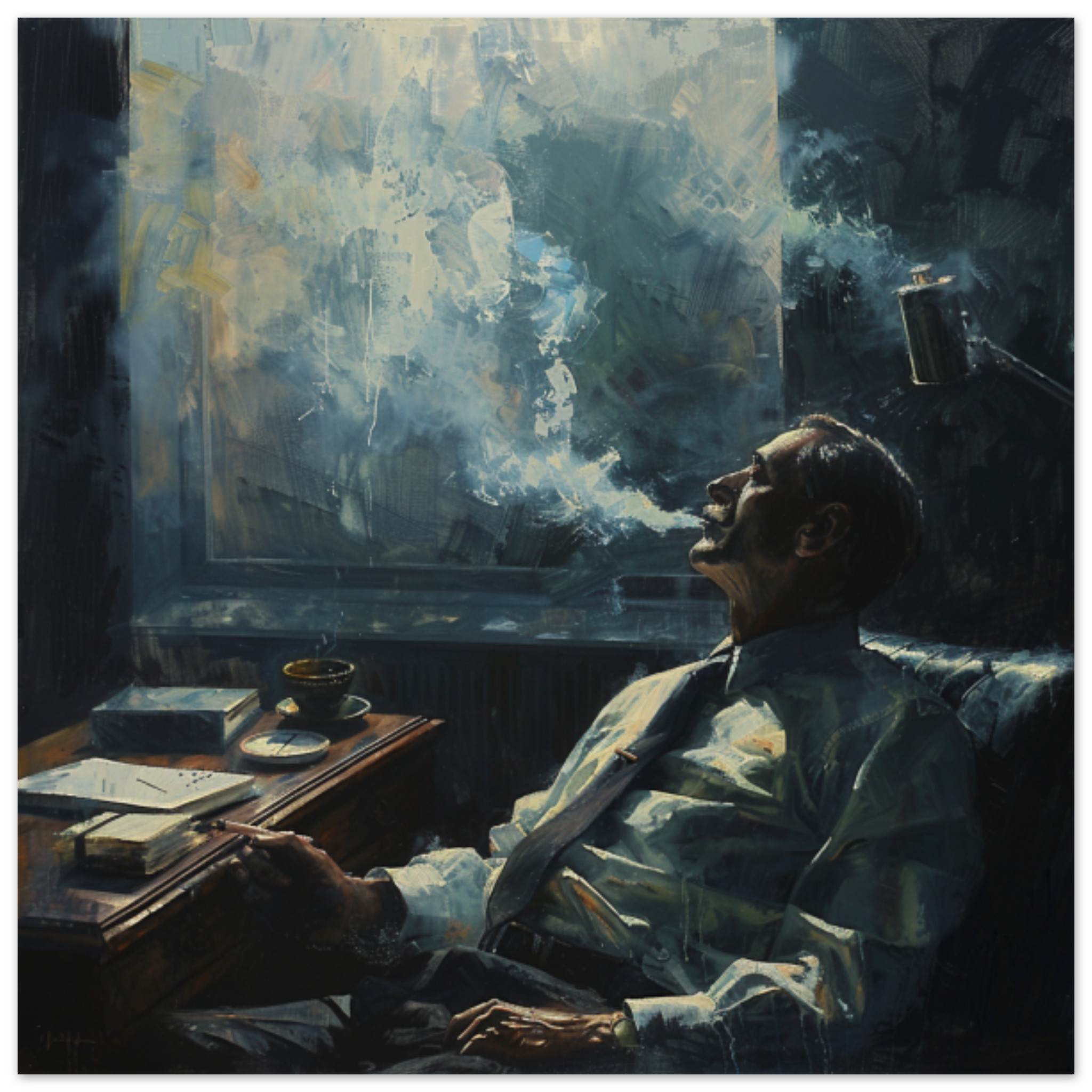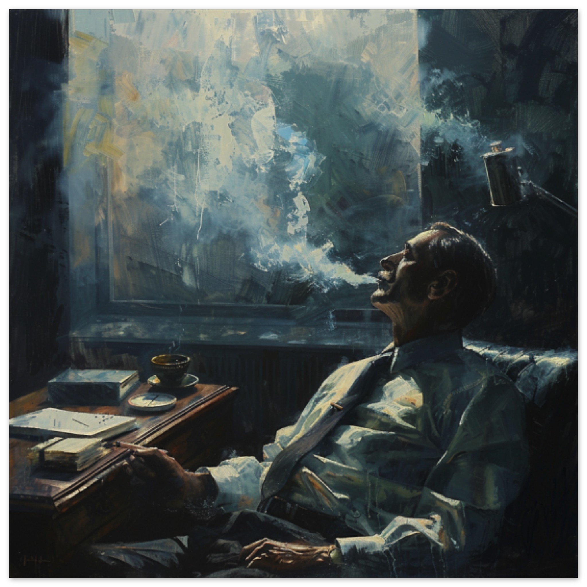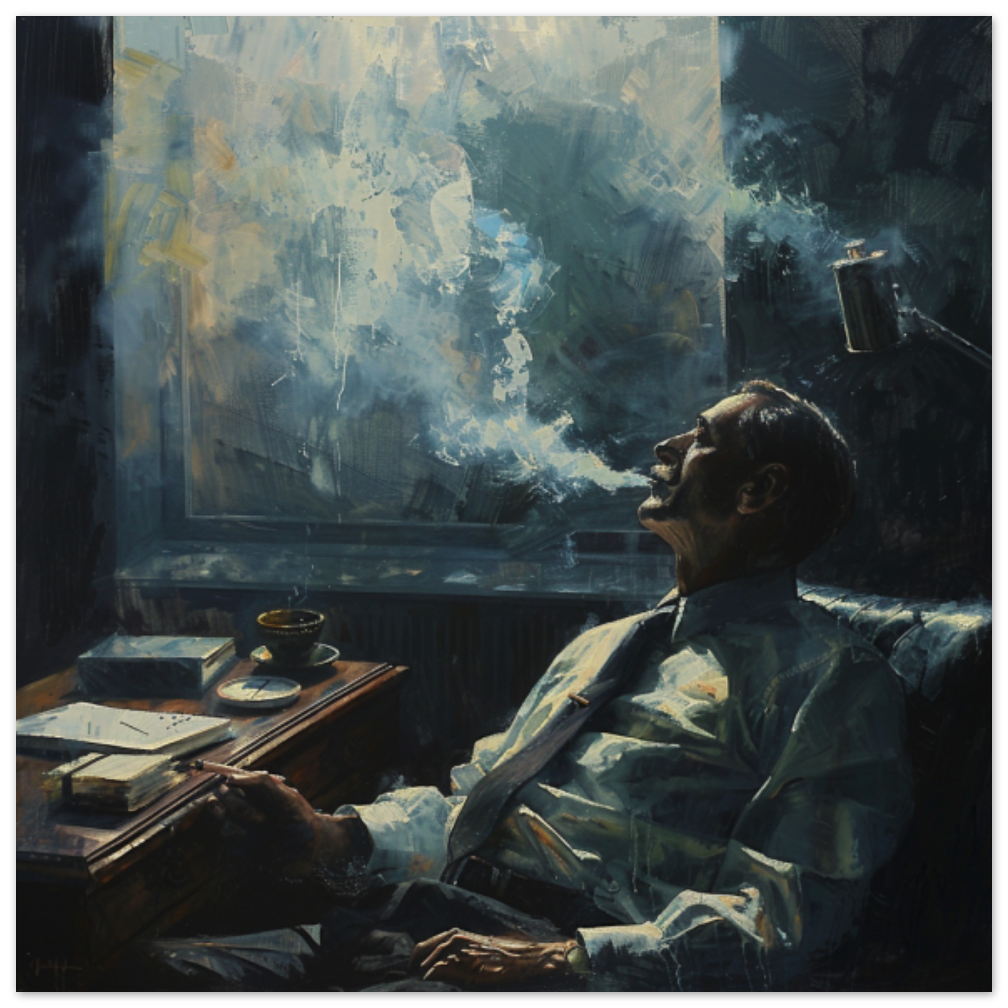 A man is depicted in a painting sitting in a chair, smoking a cigarette. The artwork has dimensions of 600×600 pixels and features dominant colors of black and grey. The man is the main object in the image, with a confidence score of 0.80. The setting appears to be indoors, with no identifiable landmarks or celebrities present. The image is not flagged as containing adult, racy, or gory content. The tags associated with the image include painting, drawing, art, and visual arts. The man is wearing a black belt on a green fabric.