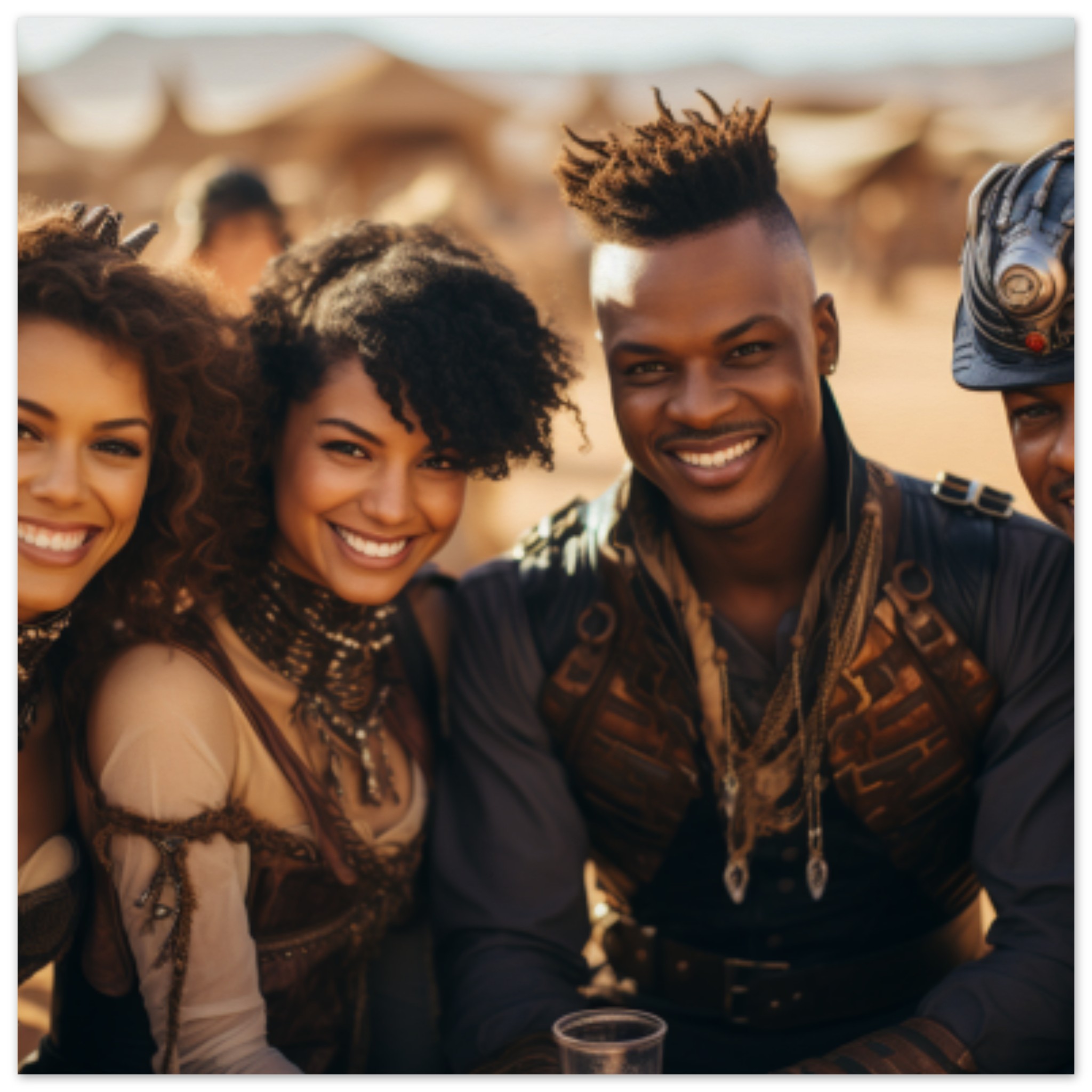 A diverse group of people in various stylish clothing are gathered outdoors, posing for a photo with smiles on their faces. The image features a mix of individuals, including a woman in the foreground smiling at the camera. The dominant colors in the background are black and brown, with accents of a blueish-gray hue. The scene exudes a sense of friendship and camaraderie. The photo captures a moment of joy and connection among the individuals, who are all dressed in fashionable attire. The overall mood is cheerful and vibrant, making it a heartwarming scene to behold.