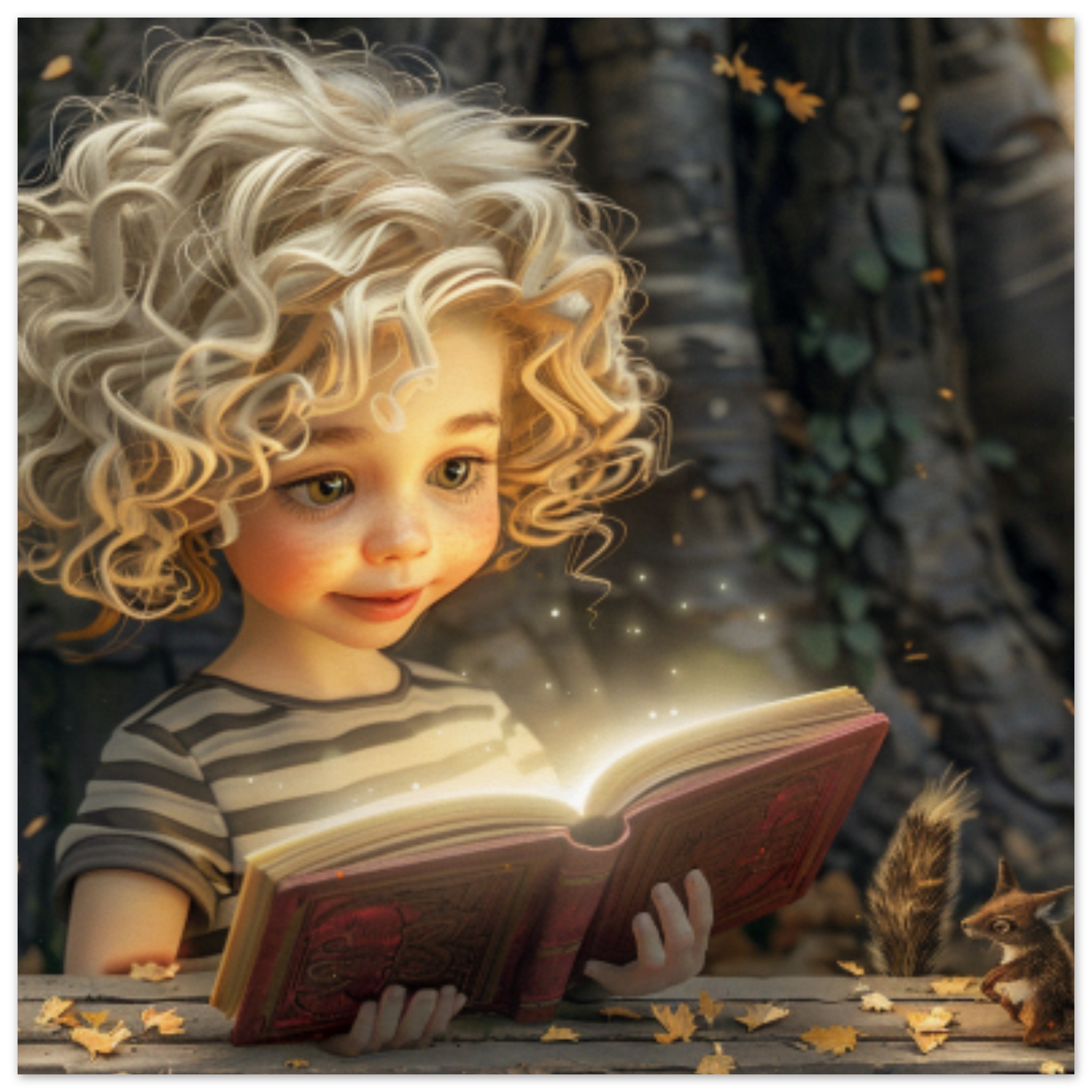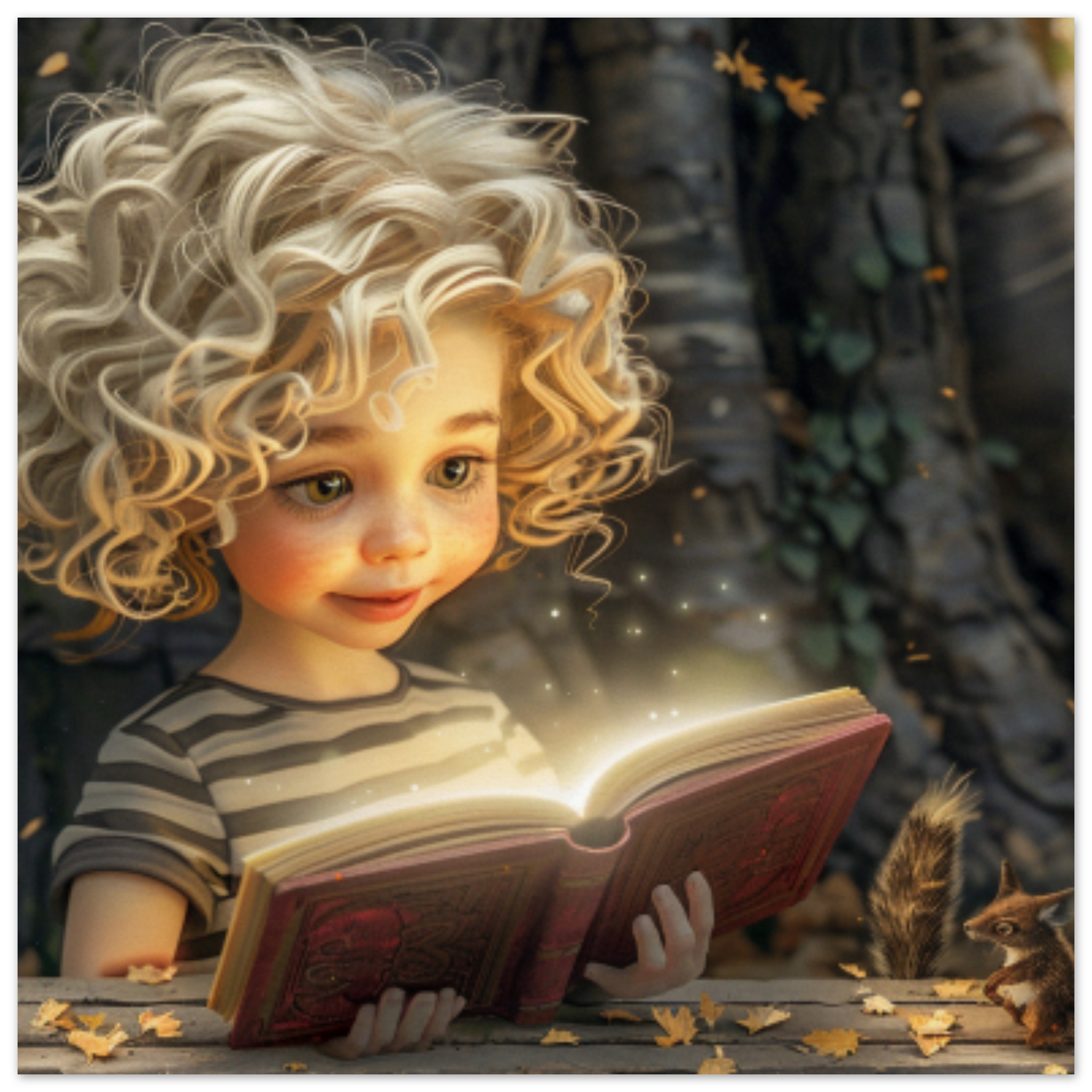 A detailed cartoon illustration featuring a young girl sitting outdoors, engrossed in reading a book. The scene includes a brown toy animal with a long tail in the background. The dominant colors are black and brown, with an accent color of 9A7531. The image is not black and white and shows a human face with a person reading a book. Additionally, there is a mammal present in the illustration. The overall vibe is wholesome and child-friendly, perfect for a children’s book or educational material.