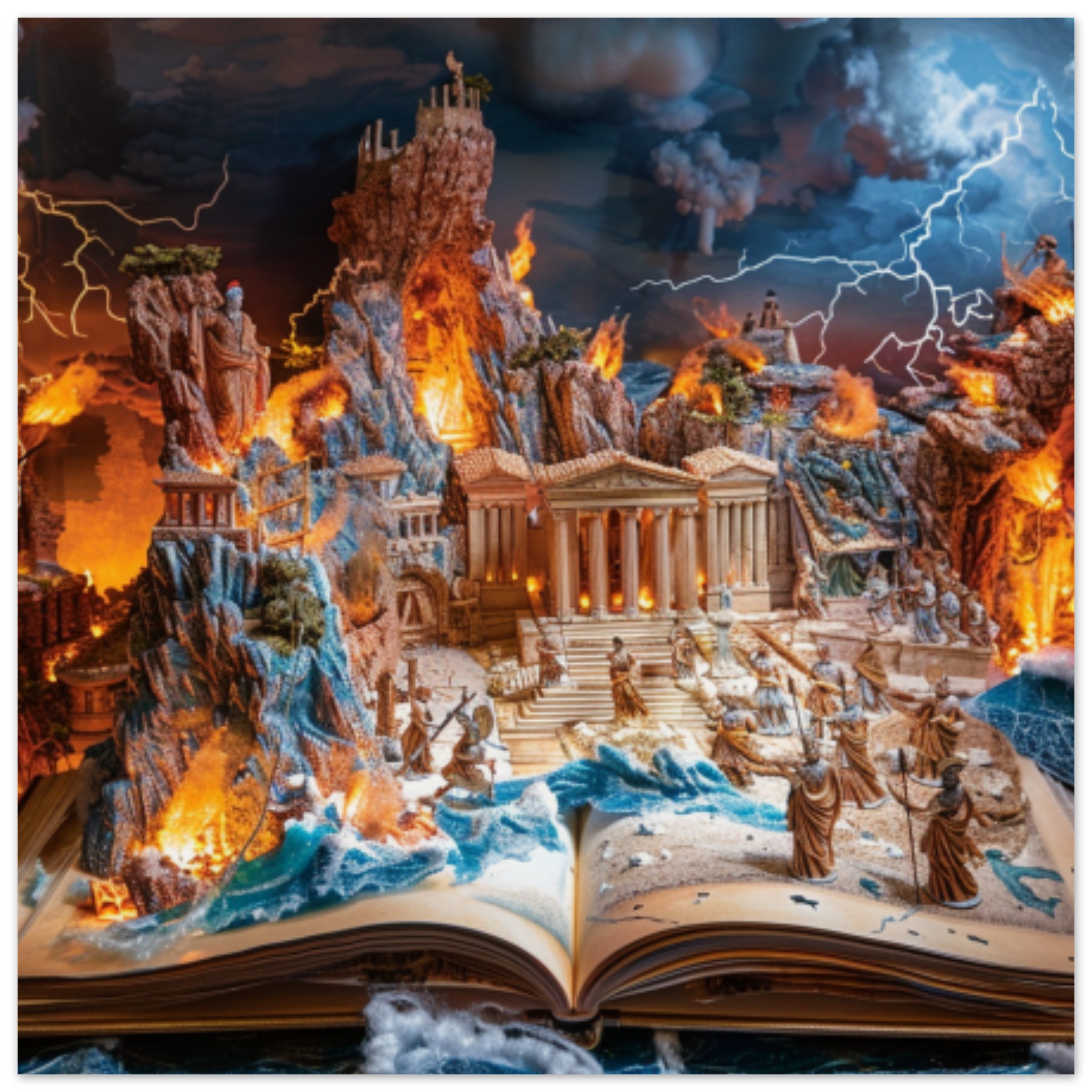 A large hardcover book is open to reveal a detailed painting of a majestic statue of a temple perched on top of a rugged mountain peak. The intricate artwork captures the beauty and grandeur of the temple, surrounded by lush greenery and a serene atmosphere. The statue on the book’s pages depicts a man in a position of reverence and contemplation. The predominant color scheme of the painting is rich browns, with accents of a warm orange hue. This captivating scene is a testament to the skill and talent of the artist, showcasing a stunning blend of nature and architecture.