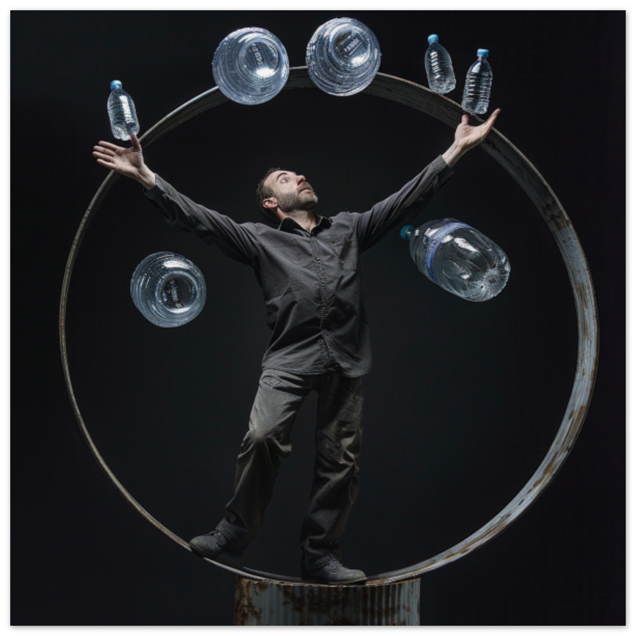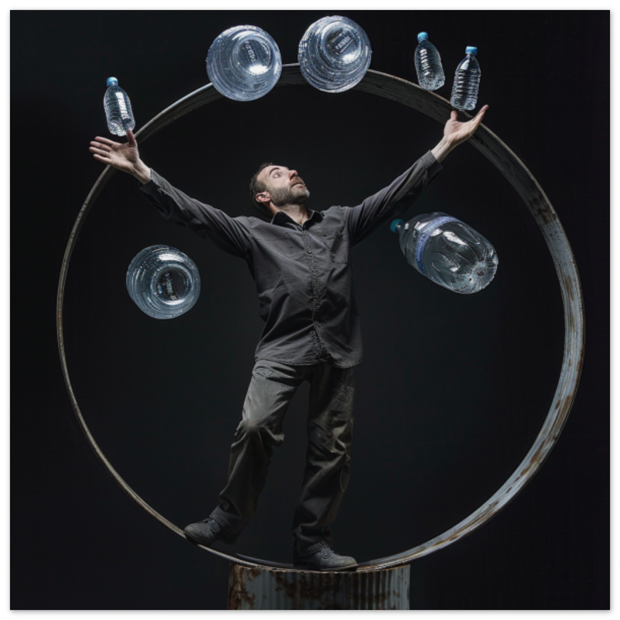 A man wearing black clothing is skillfully juggling water bottles in a room. The dominant colors in the image are black and a shade of blue. The man, who is the main subject, is positioned towards the center of the image. He is standing still and focused, with a plastic bottle with a blue band visible in his hands. The image is free of adult, racy, or gory content. The scene depicts a person engaging in a playful and entertaining activity, showcasing coordination and dexterity.