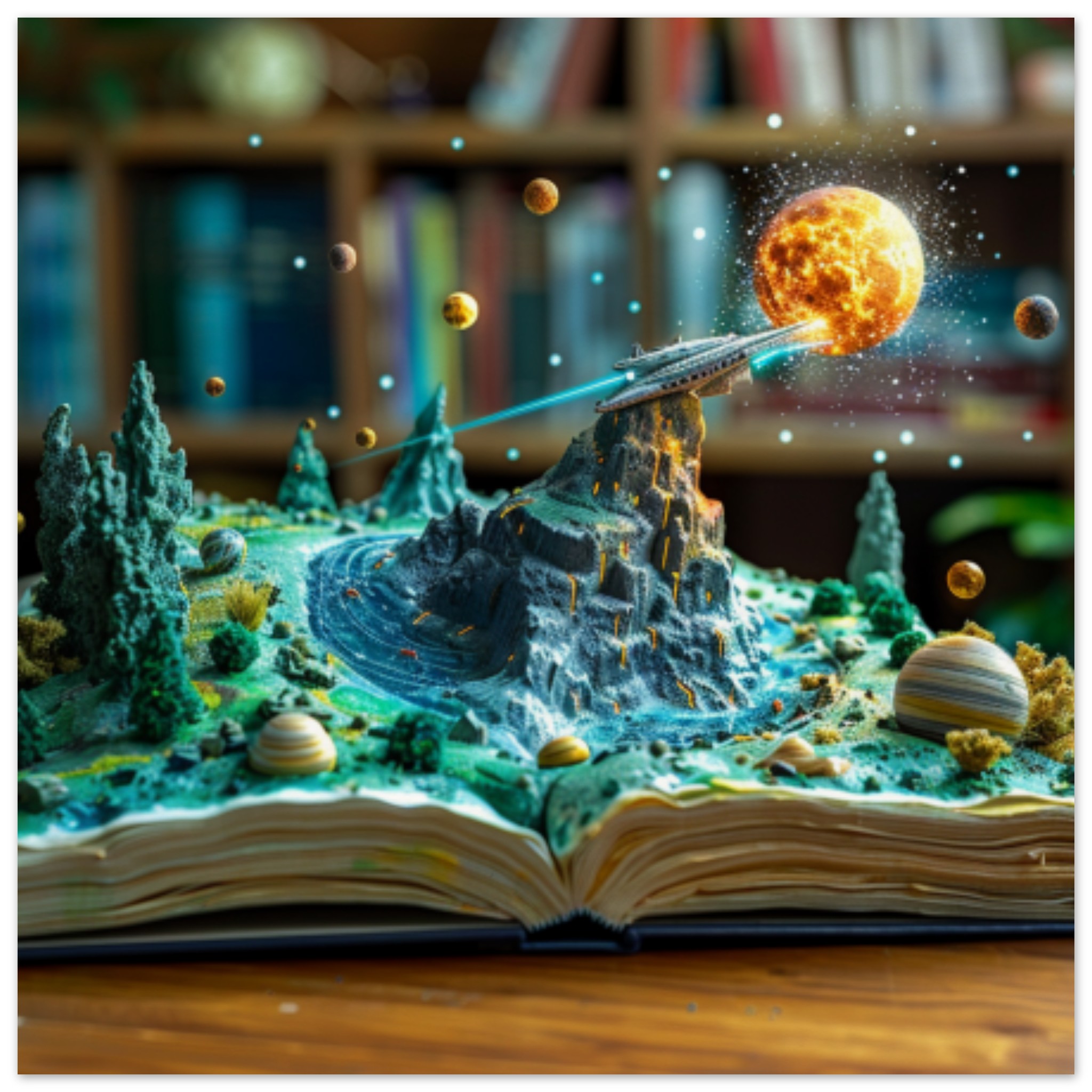 An open book sits on a wooden surface, displaying a model of a planet and a rocket flying through the air. The book is filled with intricate details, showcasing a colorful landscape and a mountain scene. The rocket appears to be soaring through the pages, as if brought to life by the reader’s imagination. The dominant colors in the image are black and brown, adding a sense of depth and contrast to the composition. This captivating scene evokes a sense of wonder and exploration, making it a perfect addition to any bookcase or indoor space.