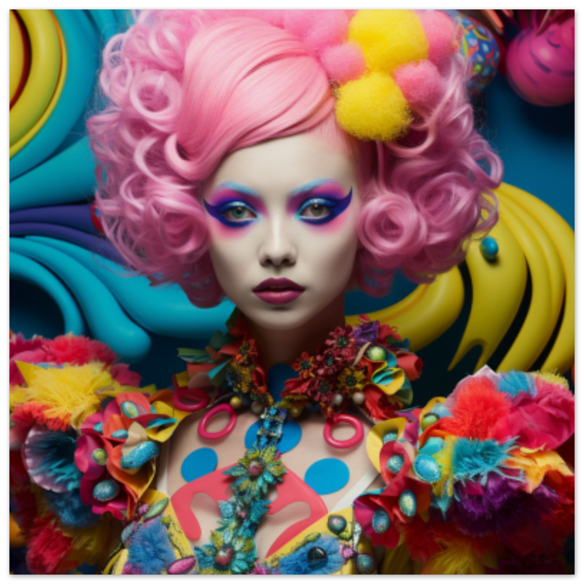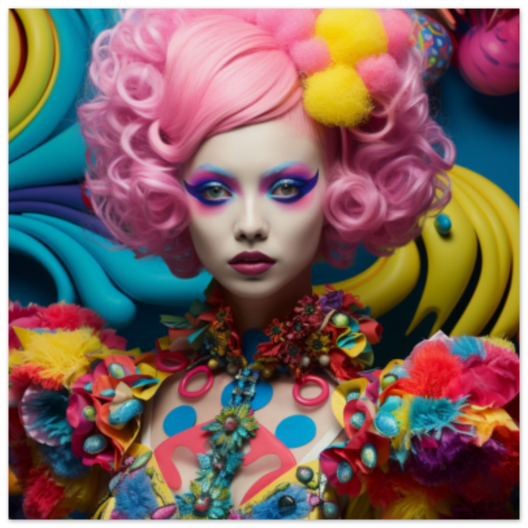 A woman with vibrant pink hair styled in loose curls, adorned with colorful and bold makeup. She is standing out against a black background, with her expressive face capturing attention. The dominant colors in the image are yellow and pink, adding to the playful and eccentric vibe. There is a close-up of a toy in the corner, featuring a banana shape. The woman’s face is the focal point, showcasing her unique and artistic appearance. The overall composition is striking and artistic, with a touch of whimsy and creativity.