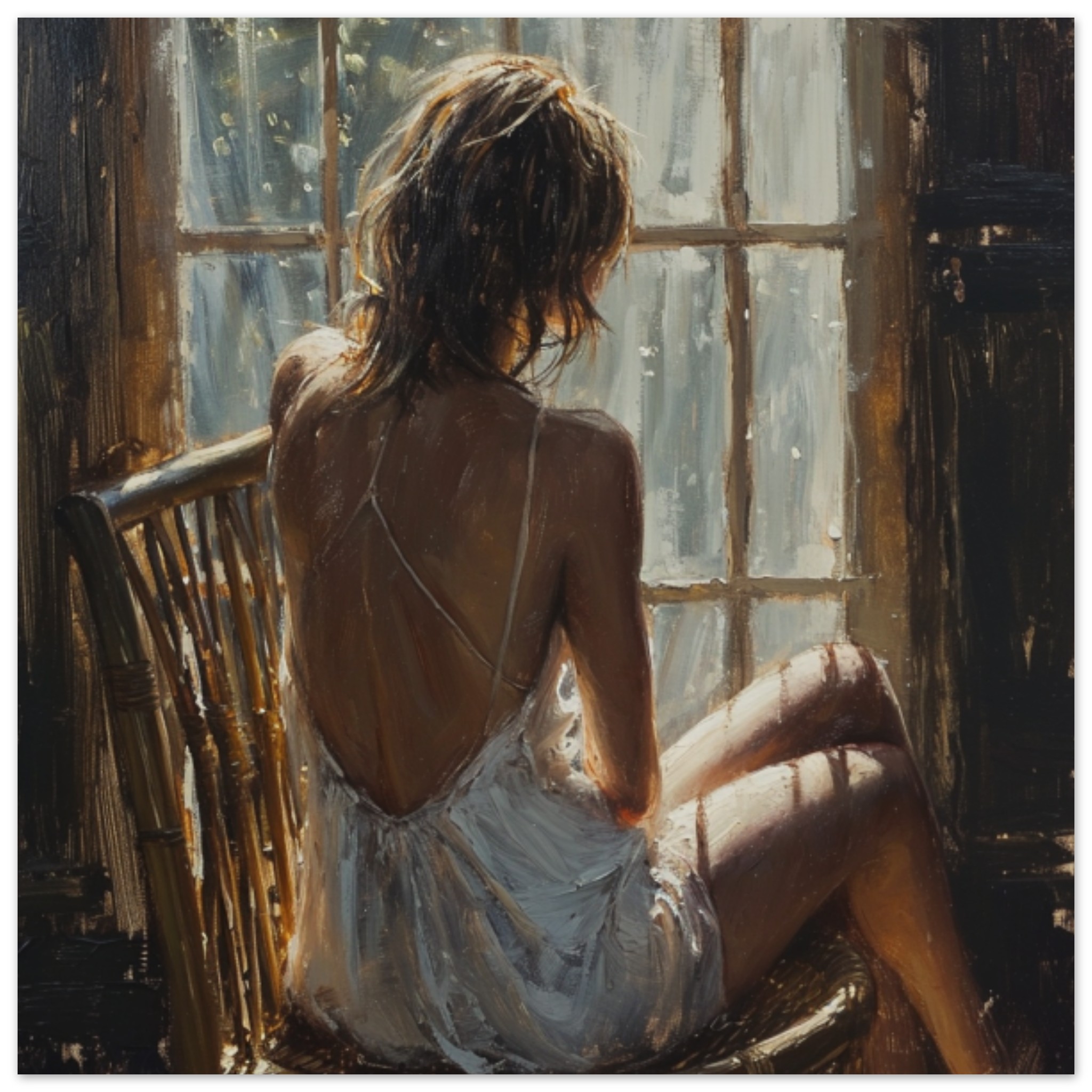 A woman is seated in a chair, gazing out a window. The scene is serene, with the woman appearing contemplative. The photo captures her profile, highlighting her elegant posture and thoughtful expression. She is wearing a flowing dress that drapes gracefully over the chair. The background is a dark, solid color, enhancing the peaceful ambiance. The overall color scheme includes shades of black, grey, and brown, with a warm accent color. The image conveys a sense of introspection and quiet beauty, inviting viewers to imagine the woman’s thoughts as she gazes out into the world beyond the window.