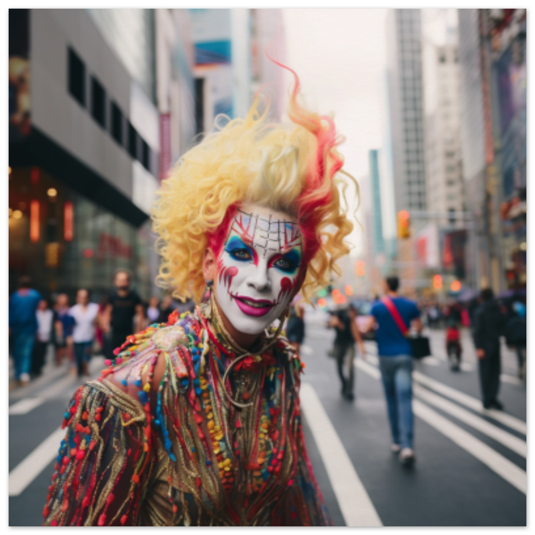 A person with face paint and yellow hair is standing on a city street. The individual is wearing a colorful costume and appears to be dressed up for an event or celebration. The background consists of buildings and a road, typical of a city setting. The person’s face is painted with white and red colors, resembling a clown. The image is vibrant and busy, with other people walking around in the street. The overall atmosphere suggests a festive or playful occasion, possibly a Halloween celebration or a street performance.