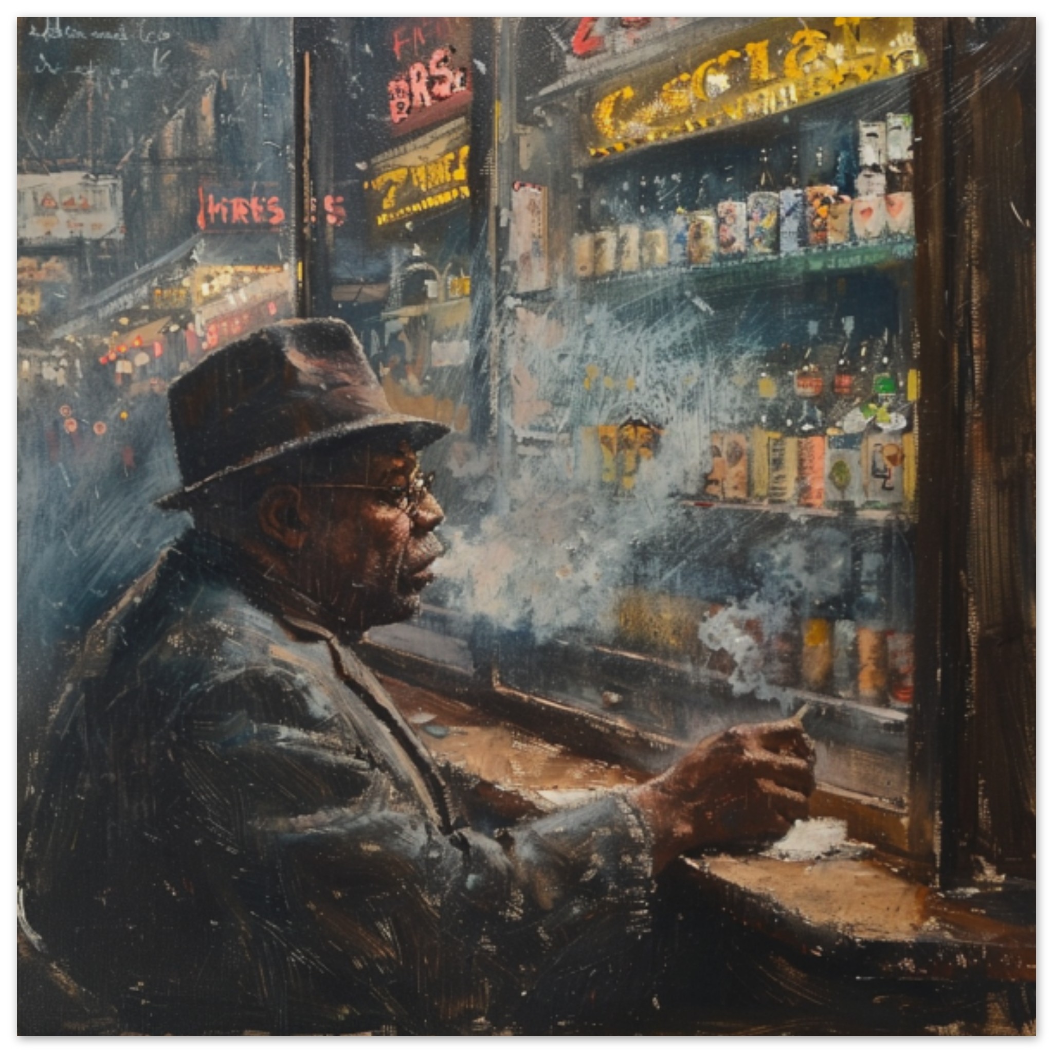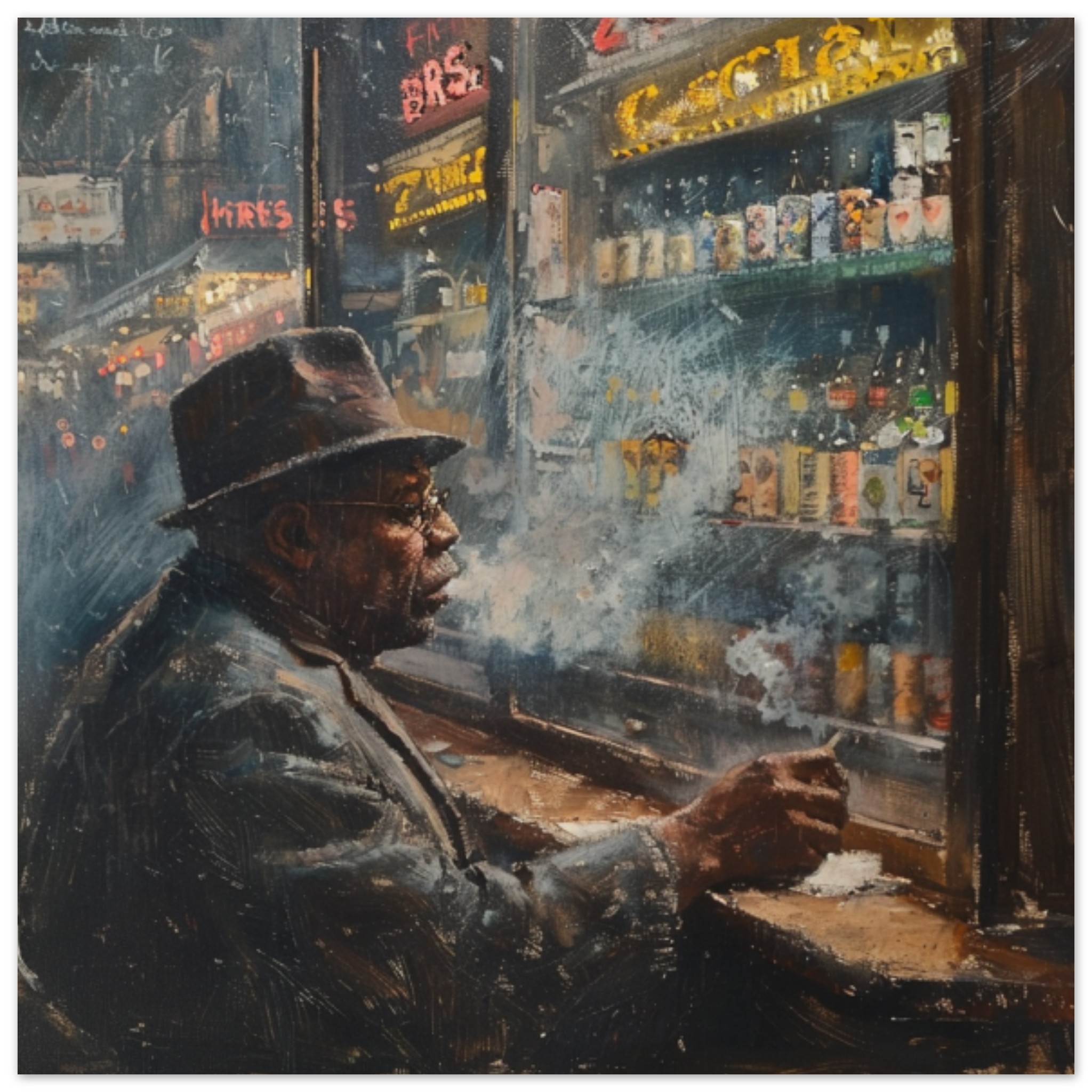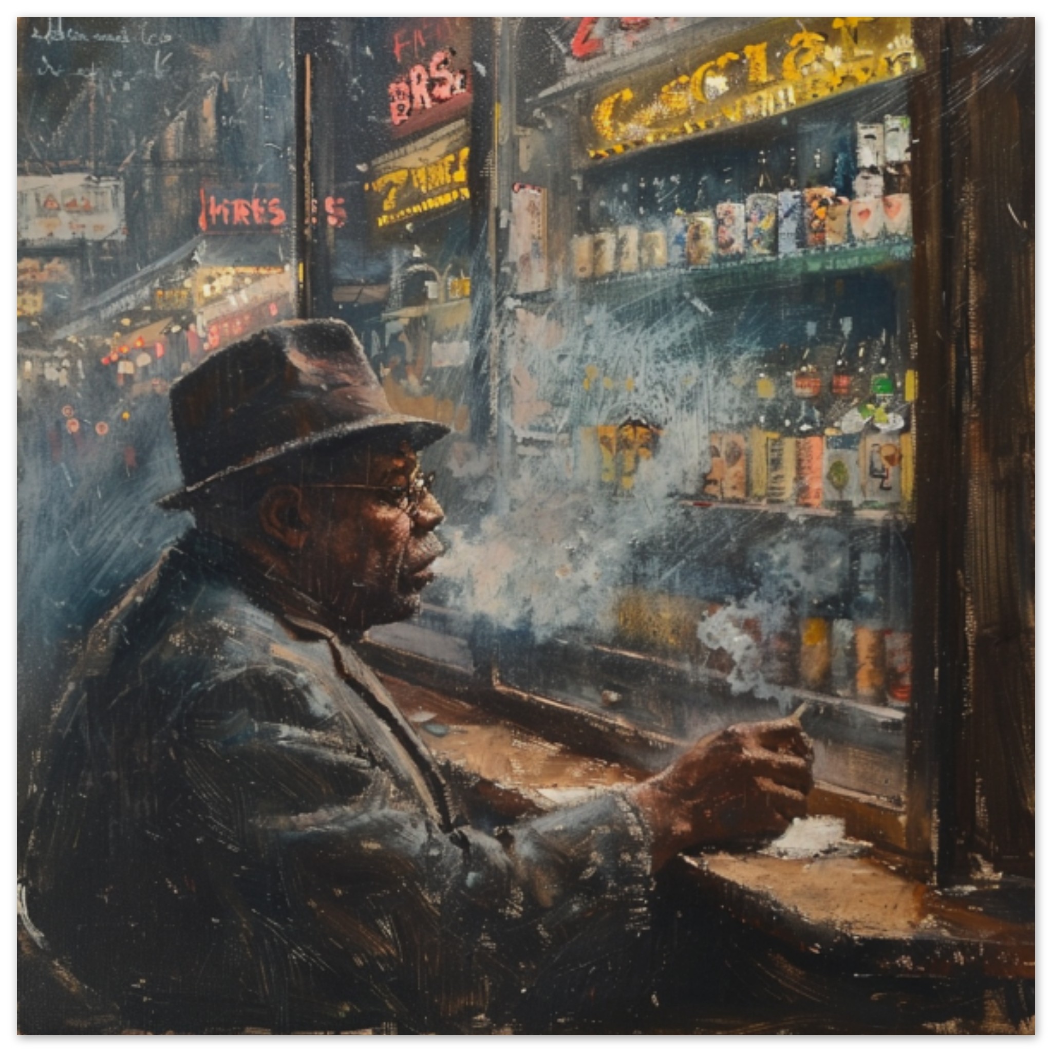 A man with a serious expression is smoking a cigarette in this painting. The man is wearing a hat and is depicted on a street with text in the background. The dominant colors in the image are grey and black, with an accent color of 9F772C. The image is not black and white. The man’s face is the focus of the painting, with a headwear object detected in the composition. The overall scene exudes a gritty urban vibe, capturing a moment of contemplation or solitude. The artwork is detailed and realistic, showcasing skilled drawing techniques.